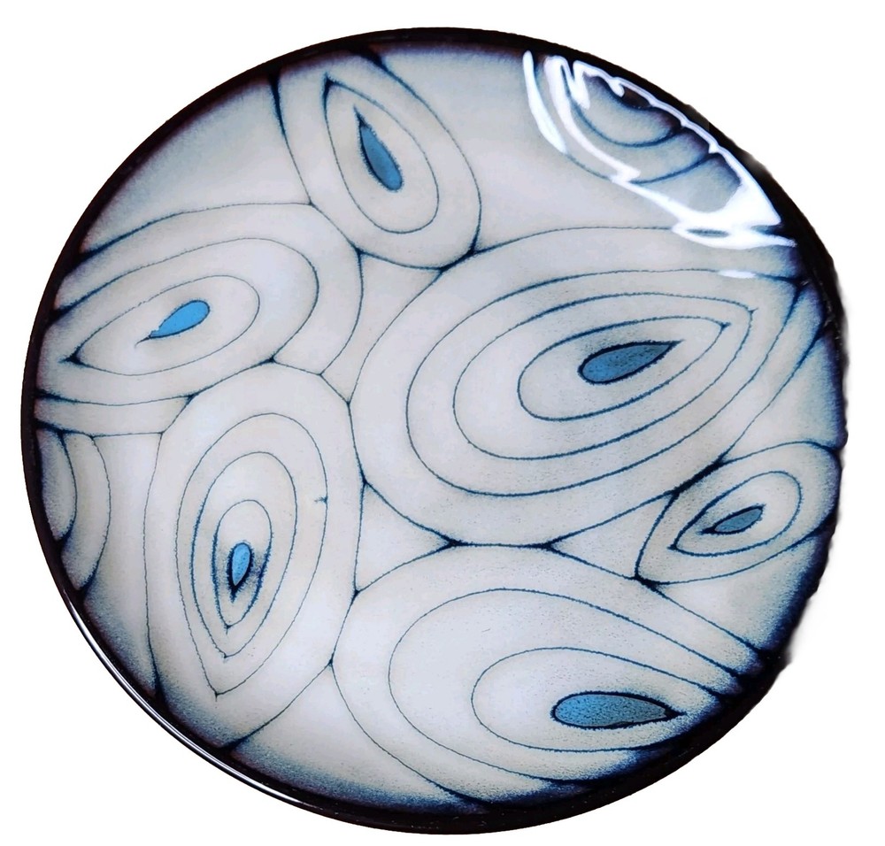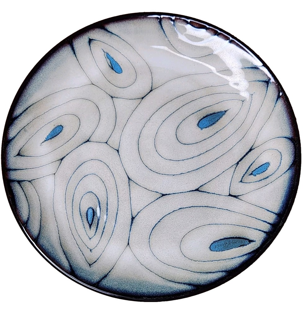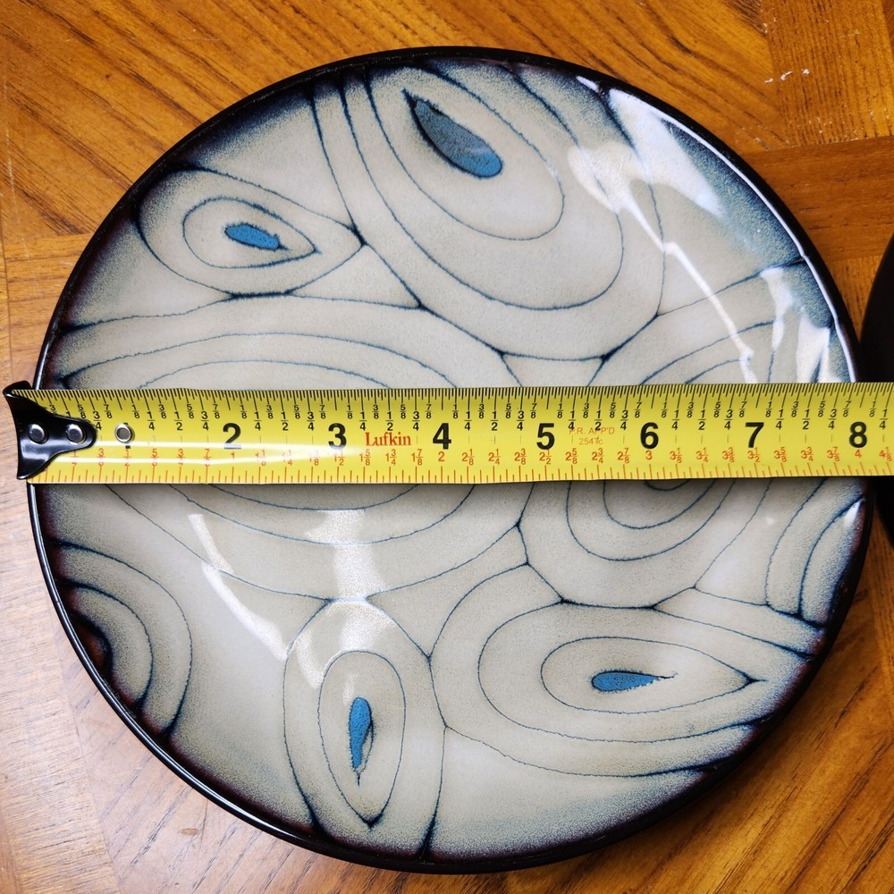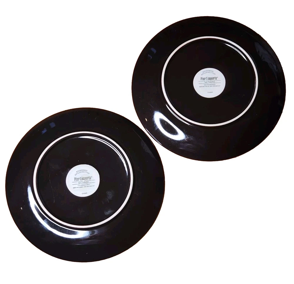 Add a touch of modern elegance to your dining table with these two stoneware salad snack plates from Pier 1 Imports. The plates feature a beautiful teal reactive pattern with an abstract peacock feather design, perfect for all occasions. Measuring 8.25 inches in diameter and 1 inch in height, these round plates are dishwasher safe and made of stoneware. The set includes two plates and is an original production style from China. The backstamp is printed, and the product line is Pier1 Imports. Perfect for any adult, these plates are a must-have addition to your collection. Great Pre-owned condition Ships USPS Priority or Ground Advantage Mail or FedEx Home Delivery.