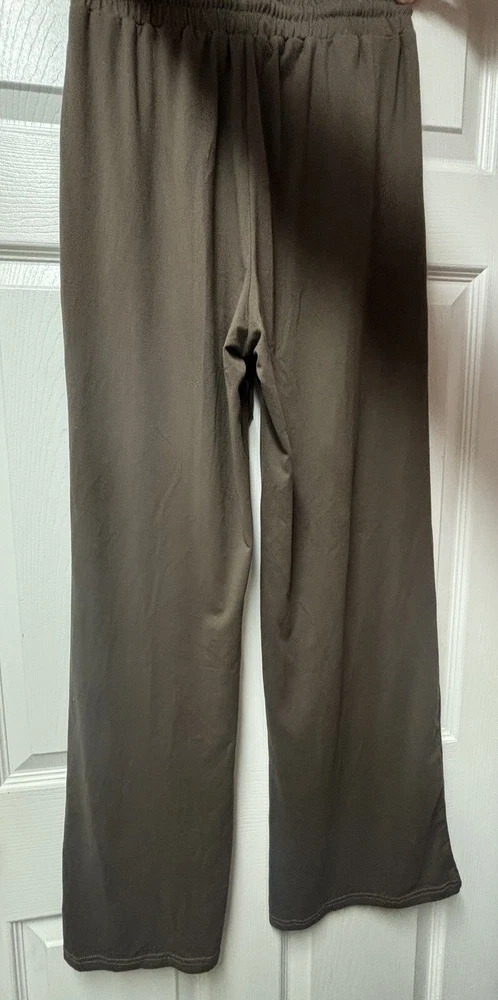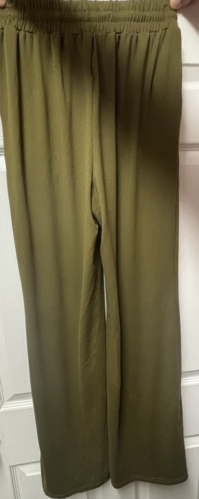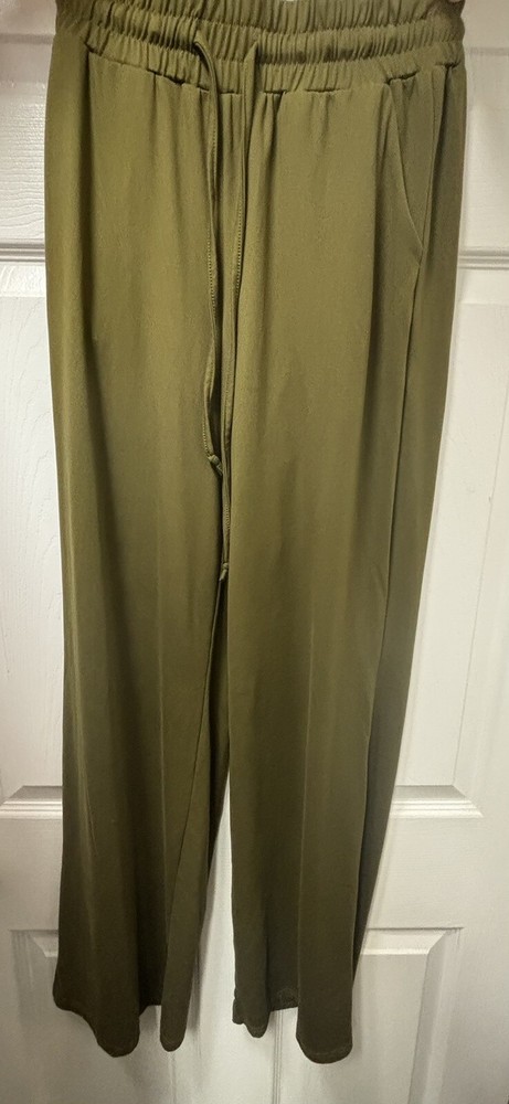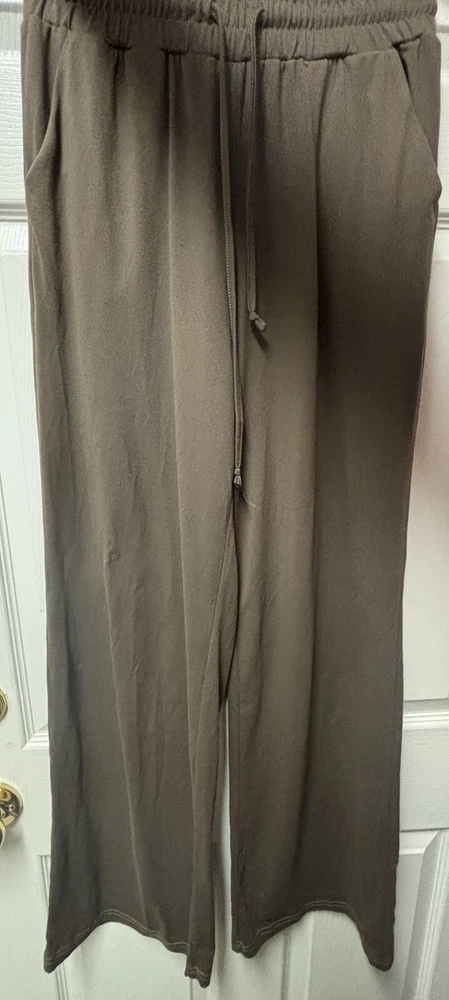 Elevate your loungewear game with these cozy and comfortable women's wide leg lounge pants. This product comes in a pair of two pants, one brown and one olive green, The drawstring closure and adjustable waist provide a relaxed fit that is perfect for casual occasions. The solid olive color and wide-leg style offer a chic and versatile look that can be dressed up or down. These pants are designed to provide both comfort and stretch. The 30-inch inseam and pockets add functionality to the pants, making them perfect for everyday wear. Ideal for women who prefer a relaxed fit, these pants are a must-have addition to any casual wardrobe.