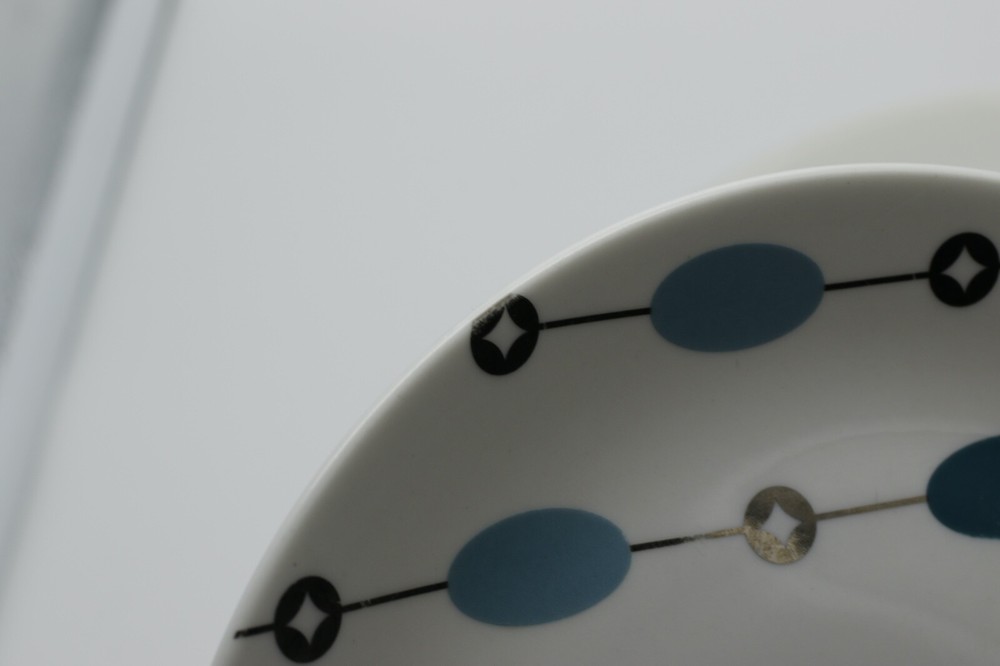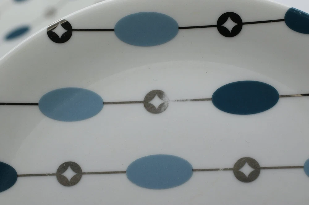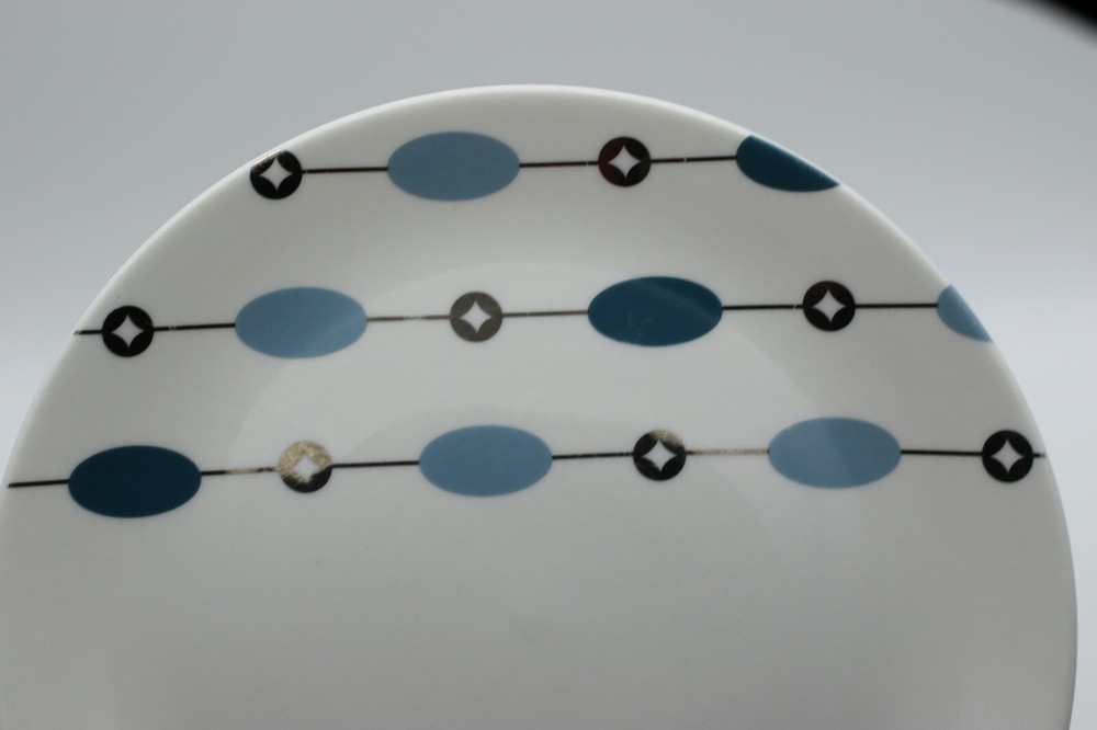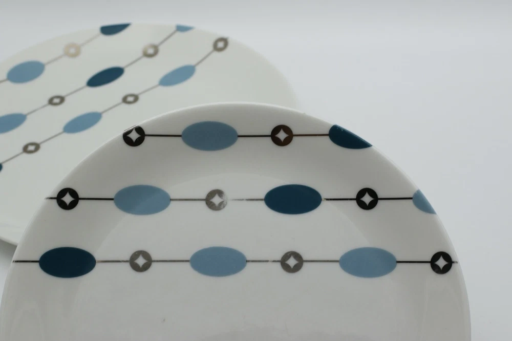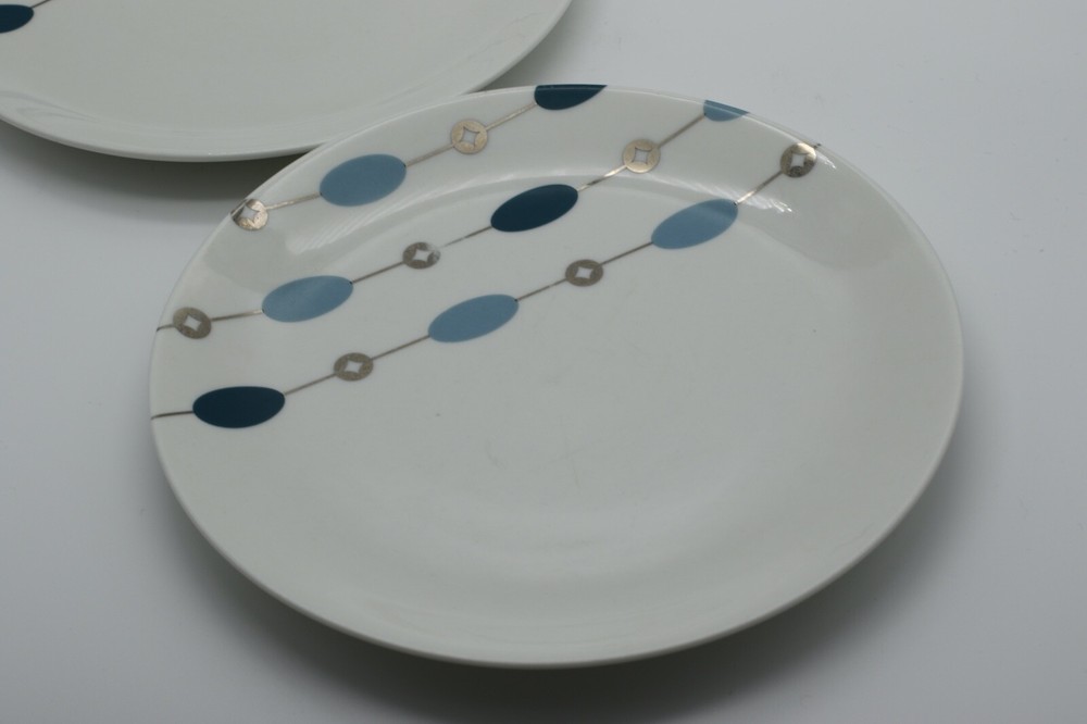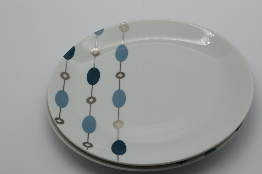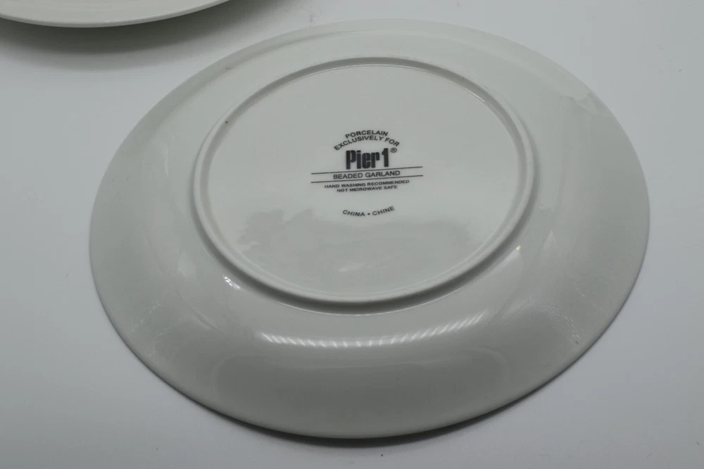 Two Pier 1 porcelain plates in the Beaded Garland pattern Blue. Good condition with some regular signs of usage. There are a couple photos highlighting a small bit of fading on the plate. 7.75" diameter USPS Priority I have two of the green Beaded Garland plates listed on my ebay store.