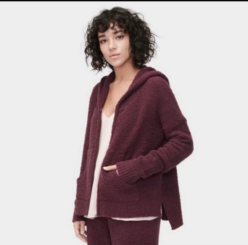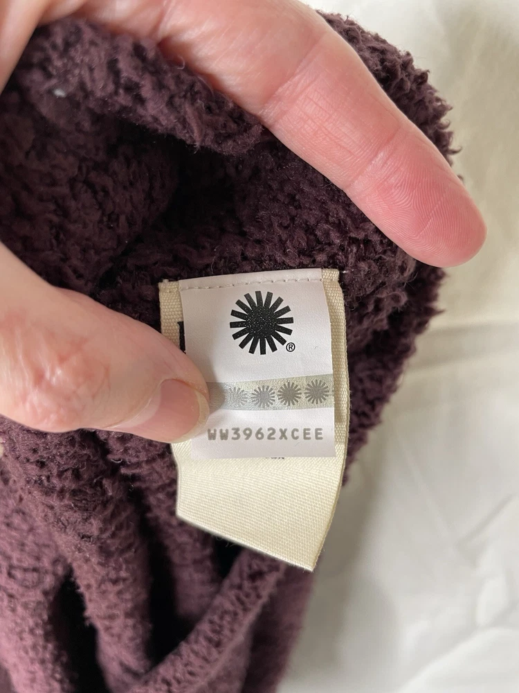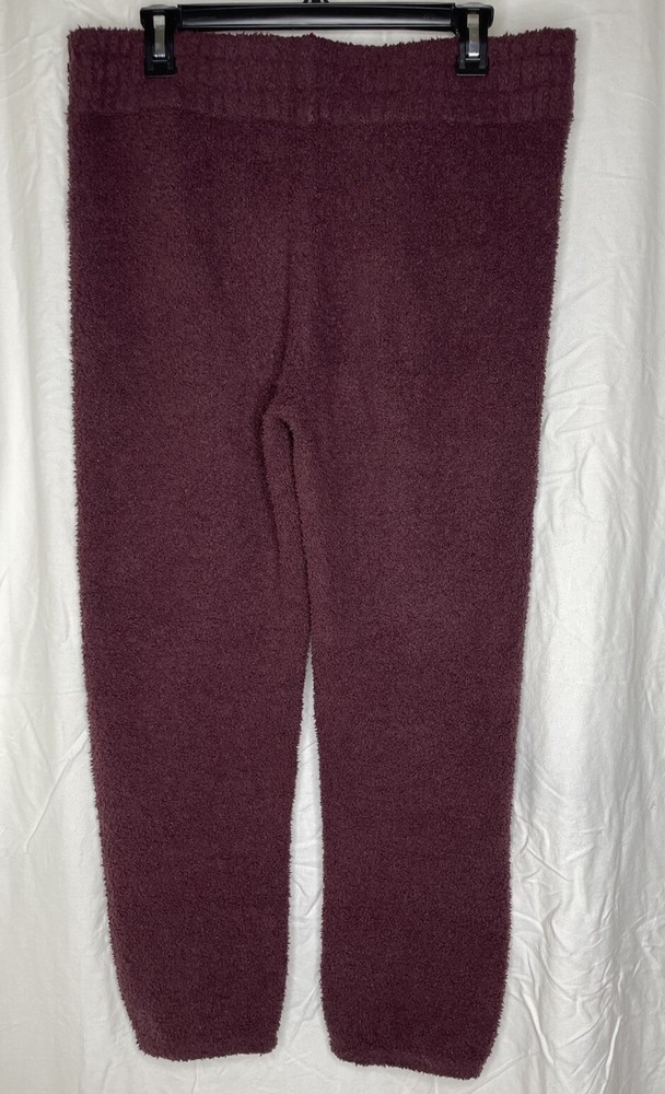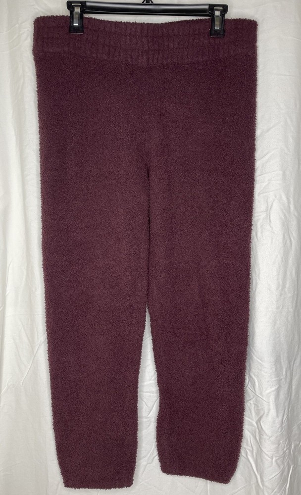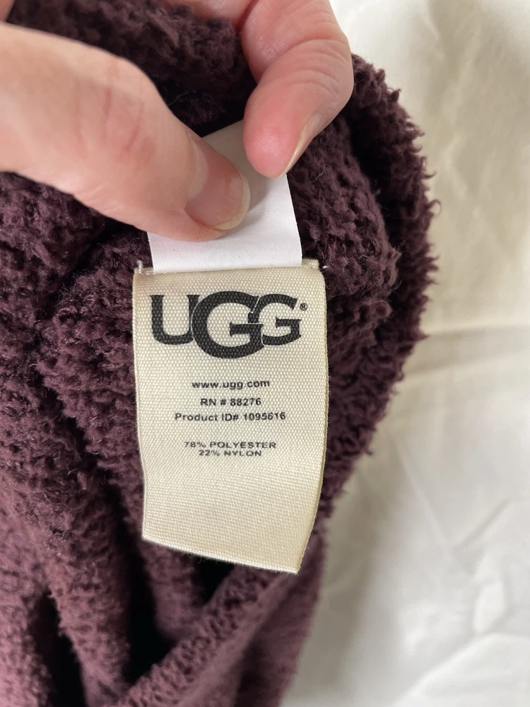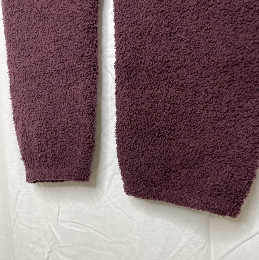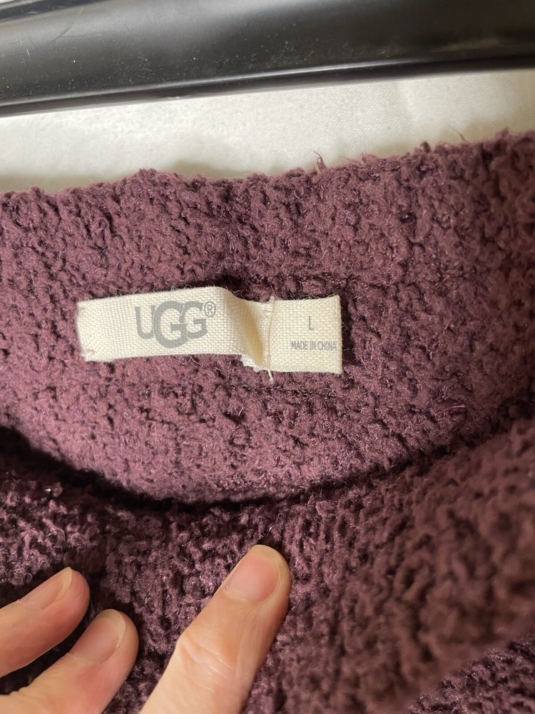 UGG Womens Deep Port Purple KYLEIGH Fluffy Sweater Knit Cropped Pants Large Fuzzy fleece adds an extra bit of texture and softness to a that makes for a cozy off-duty essential lounge wear. • Elastic waistband • 78% polyester, 22% nylon • Machine wash, tumble dry Preowned in great condition. Measured Flat Waist: 17.5” Rise: 12” Inseam Length: 26”