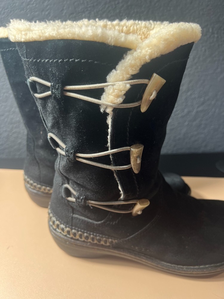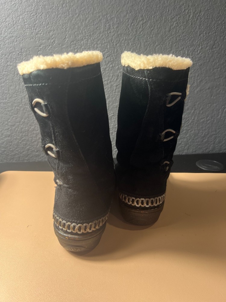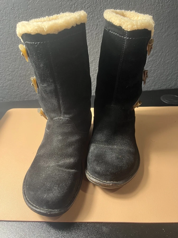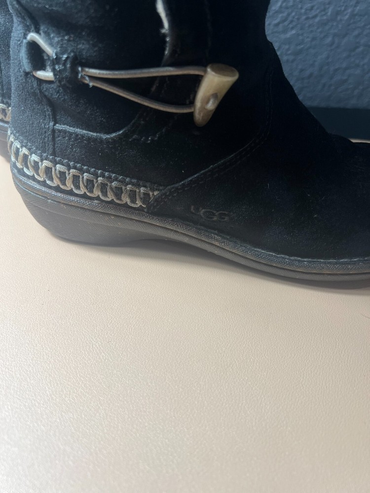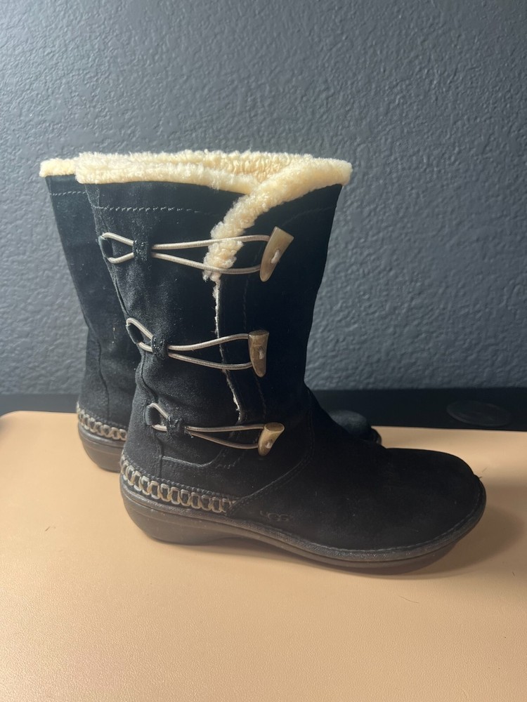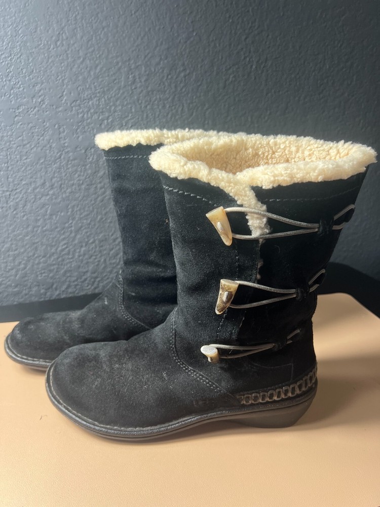 UGG Kona Mid Calf Boots Women’s 9 – Black Suede Winter Toggle – Cozy & Stylish Key Features: Brand: UGG Australia Model: Kona Size: Women’s 9 Color: Black Material: Genuine suede upper, soft interior lining Style: Mid-calf winter boot with toggle closure Sole: Durable rubber sole for traction Product Description: Stay warm in style with these UGG Australia Kona mid-calf boots , crafted in soft black suede and designed for cozy comfort. These winter-ready boots feature a toggle closure for a secure fit and a plush interior lining that keeps your feet warm even on the chilliest days. The mid-calf height offers added coverage and pairs perfectly with jeans, leggings, or winter wear, while the signature UGG comfort ensures all-day support. Whether you're heading out for errands or enjoying a snowy stroll, these boots combine function with fashion in true UGG style.