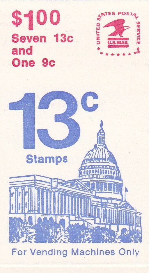 U.S. DEFINITIVE BOOKLET OF 8 STAMPS SCOTT #BK131 1977 13ct FLAG OVER CAPITOL. SEVEN 13ct STAMPS & ONE 9ct STAMP. PERF 11 x 10.5. NO PLATE NUMBER. MINT OPENED IN GOOD CONDITION. 2023 SCOTT CATALOG VALU...