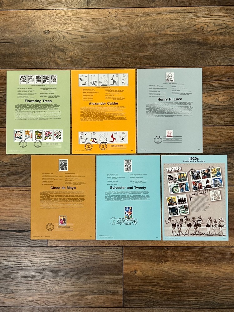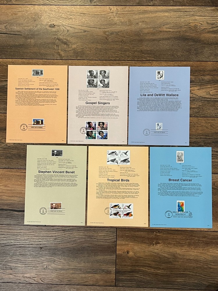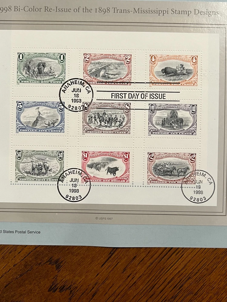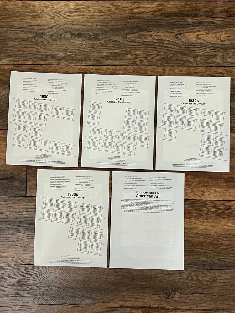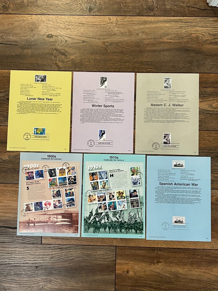 United States Post Office American Souvenir Pages. First Day Of Issue. Complete Year Set with a Scotts or Brookman Catalog Value Several Hundred Dollars!!! From a Smoke Free home to you. STOCK PHOTOS: I have, am, and will sell multiples of these. Pictures are of one set. Although usually very consiste nt, the USPS may have differences on the Souvenir Page (stamps, locations, cancels) Blocks/Packets/Coils may or may not have numbering or margin information/markings. There can be some differences between pictures and actual items. Few pages may have slight blemishes (corner/edge wrinkle/dent/bend). No holes or major blemishes. NOTE: if something very specific you are looking for, ask before purchasing. FREE item with every order! * Shipped with USPS Mail, protected and packed in a hard board cardstock mailer, marked with bright "DO NOT BEND". Information (deemed accurate) below provided from the American Society for Philatelic Pages and Panels (ASPPP). 98-01 1/5/1998 .32 LUNAR NEW YEAR 98-02 1/22/1998 .32 WINTER SPORTS 98-03 1/28/1998 .32 MADAM C.J. WALKER 98-03A 2/3/1998 .32 CELEBRATE THE CENTURY 1900'S 98-03B 2/3/1998 .32 CELEBRATE THE CENTURY 1910'S 98-04 2/15/1998 .32 SPANISH AMERICAN WAR 98-05 3/19/1998 .32 FLOWERING TREES (STRIP OF 5) 98-06 3/25/1998 .32 ALEXANDER CALDER (STRIP OF 5) 98-07 4/3/1998 .32 HENRY R. LUCE 98-08 4/16/1998 .32 CINCO de MAYO 98-09 4/27/1998 .32 SYLVESTER AND TWEETY 98-09A 5/28/1998 .32 CELEBRATE THE CENTURY 1920'S 98-10 5/29/1998 .32 WISCONSIN 98-11 6/18/1998 TRANS-MISSISSIPPI AND INTERNATIONAL EXPOSITION SOUVENIR SHEET 98-12 6/18/1998 $1.00 TRANS-MISSISSIPPI AND INTERNATIONAL EXPOSITION 98-13 6/26/1998 .32 FOLK MUSICIANS (4 DESIGNS) 98-14 6/26/1998 .32 BERLIN AIRLIFT 98-15 6/5/1998 (.05) WETLANDS COIL AND (.25) DINER COIL 98-16 7/11/1998 .32 SPANISH SETTLEMENT OF THE SOUTHWEST 1598 98-17 7/15/1998 .32 GOSPEL SINGERS (4 DESIGNS) 98-18 7/16/1998 .32 LILA AND DeWITT WALLACE 98-19 7/22/1998 .32 STEPHEN VINCENT BENET 98-20 7/29/1998 .32 TOPICAL BIRDS (4 DESIGNS) 98-21 7/29/1998 .32 BREAST CANCER 98-22 7/31/1998 .20 RING-NECKED PHEASANT 98-23 8/3/1998 .32 ALFRED HITCHCOCK 98-24 8/5/1998 .32 ORGAN AND TISSUE DONATION 98-24A 8/14/1998 $1.00 RED FOX 98-24B 8/14/1998 (.10) GREEN BICYCLE COIL 98-25 8/20/1998 .32 BRIGHT EYES (STRIP OF 5) 98-26 8/21/1998 .32 KLONDIKE GOLD RUSH 98-26A 9/10/1998 .32 CELEBRATE THE CENTURY 1930'S 98-27 8/27/1998 .32 AMERICAN ART SHEET OF 20 98-28 9/16/1998 .32 BALLET 98-28A 9/30/1998 (.25) DINER COIL 98-29 10/1/1998 .32 SPACE DISCOVERY (STRIP OF 5) 98-30 10/7/1998 .32 PHILANTHROPY 98-31 10/15/1998 .32 MADONNA AND CHILD 98-32 10/15/1998 .32 WREATHS (SHEET & BOOKLET BLOCK) 98-33 11/9/1998 "H" (.33) STAMP AND (.01) MAKE UP RATE 98-34 11/9/1998 .22 UNCLE SAM COIL 98-35 11/9/1998 "H" (.33) COIL SINGLES 98-36 11/9/1998 "H" (.33) BOOKLETS SINGLES 98-37 11/9/1998 .77 MARY BRECKINRIDGE 98-38 11/9/1998 $3.20 SPACE SHUTTLE LANDING 98-39 11/19/1998 $11.75 SPACE SHUTTLE PIGGYBACK 98-40 12/14/1998 (.10) EAGLE AND SHIELD COIL AND (.05) WETLANDS COIL