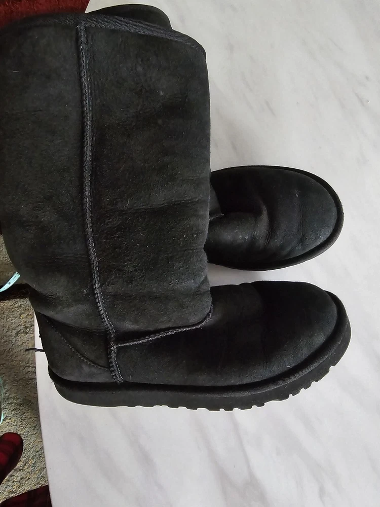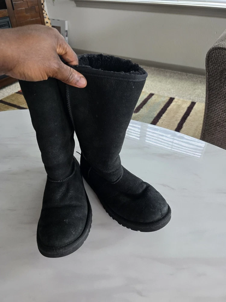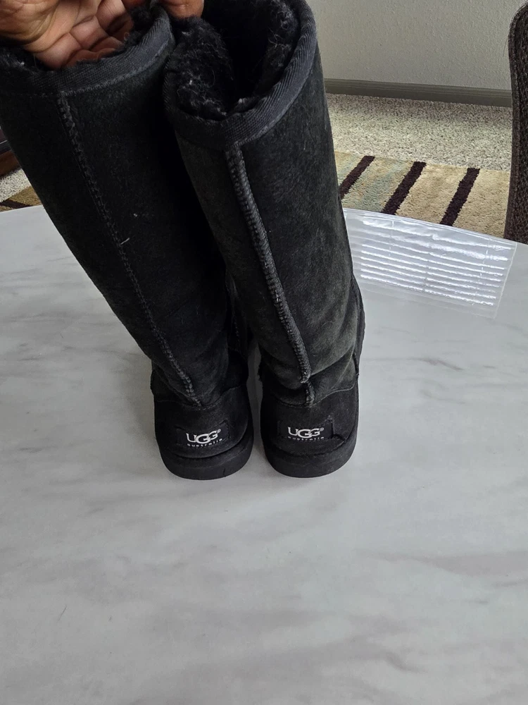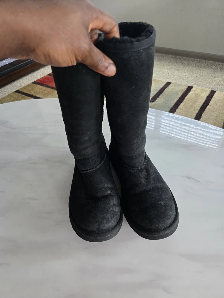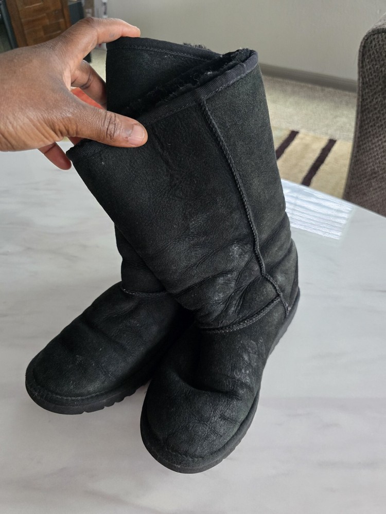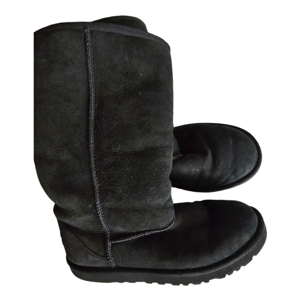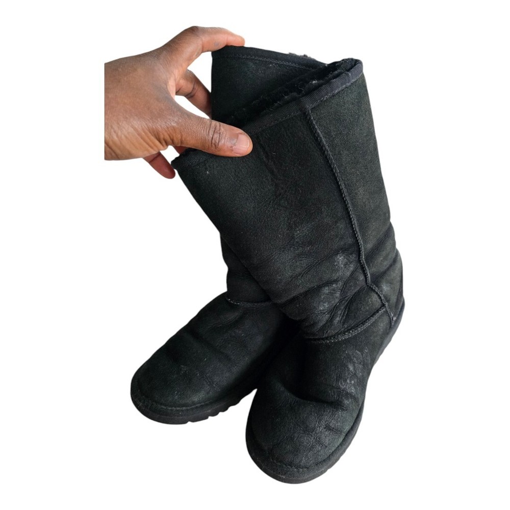 Experience ultimate comfort and warmth with these UGG Australia women's shearling boots in size 5. The black suede upper is accented with a faux fur insole and cushioned sole, making them perfect for winter, fall, and spring. The round toe and pull-on closure provide easy wear, while the mid-calf shaft style and flat heel add a touch of sophistication. Ideal for outdoor activities or casual wear, these boots feature a solid pattern and natural theme. The sheepskin lining and moderate cushioning level ensure your feet stay cozy and supported. Don't miss out on these stylish and functional boots from UGG Australia.