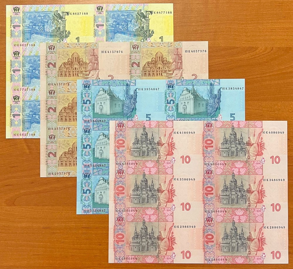 Complete SET (4 UNCUT SHEETS ) of HRYVNIA banknotes Bank sheets x 6 notes Years 2015 - 2018 ----------------------------------------------------------------------------------- List of Uncut Sheets in set : 1 Hryvnia 2018 x 60 PCS - sign. Smolii 2 Hryven 2018 x 60 PCS - sign. Smolii 5 Hryven 2015 x 60 PCS - sign. Hontareva 10 Hryven 2015 x 60 PCS - sign. Hontareva ----------------------------------------------------------- UNCIRCULATED condition !!! Uncut sheets may has a different serial number. It may not coincide with the serial number on the photo. _________________________________________________________________ SHIPPING DETAILS: We accept payment by PayPal. For other payment methods, please contact us. We use combine shipping. Buying some items - save on delivery!!! --------------------------------------------------------- Standard Shipping by Registered Air Package with tracking number . Estimated delivery time to Europe/Russia/ ----- 5~10 business days. Estimated delivery time to USA/Canada/China/Asia ------ 8~15 business days. Estimated delivery time to Australia/Africa/Central and South America --- 10~21 business days. 100% Satisfaction Guaranteed