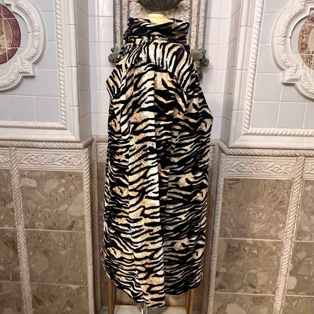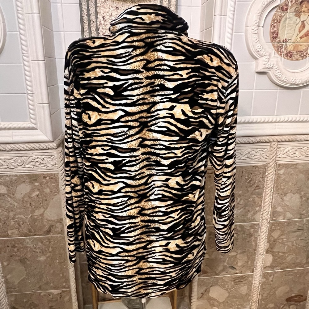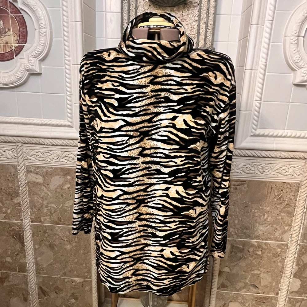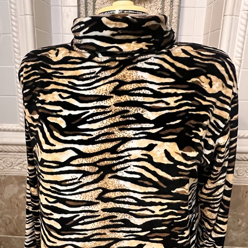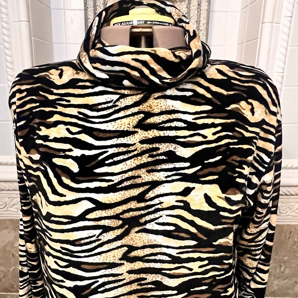 Unbranded. Size 1X. Tiger Animal Print Fleece Cowl/Turtle Neck. Top PJs. No tags so I don't know if it is a pajama top or a top. Probably polyester. Machine wash. Shoulder to hem 30". Sleeve 22". Bust 22/44". Stretch. Pullover. Soft turtle neck or cowl. I am a retired buyer for a quality boutique. I use Downey and Bounce in my laundry. Unless noted you are purchasing USED CLOTHING with normal signs of wear. Questions welcome. Color is a matter of opinion and monitors may show colors differently. Measurements are approximate using a tailor's tape. Bust measurements are taken armpit to armpit laying flat X two. Check measurements carefully with regard to your PREFERRED EASE.