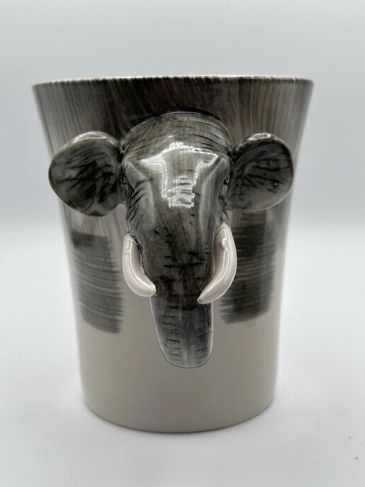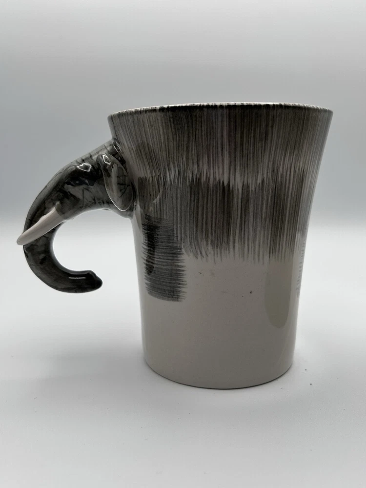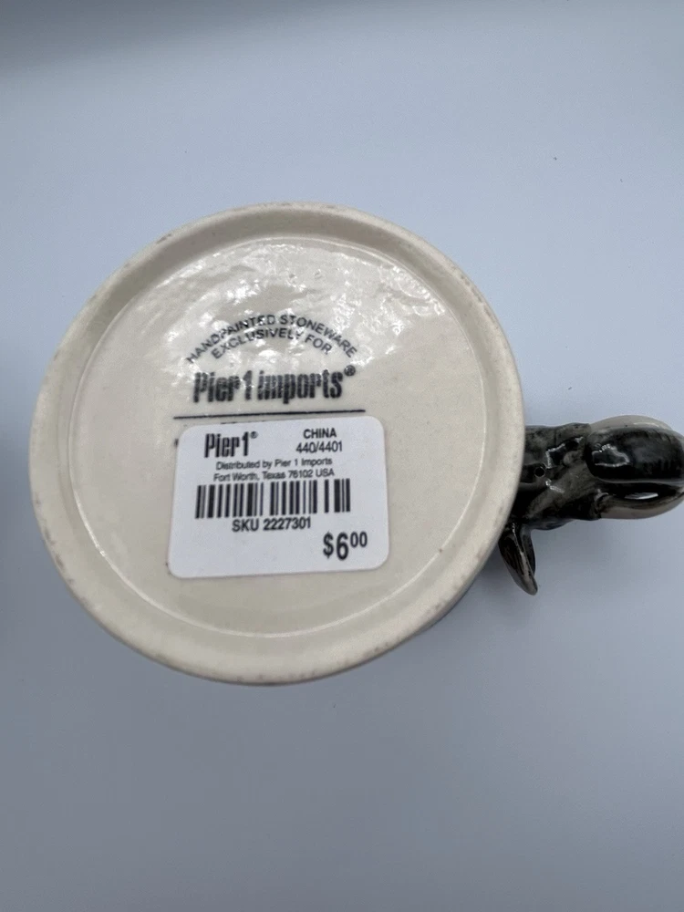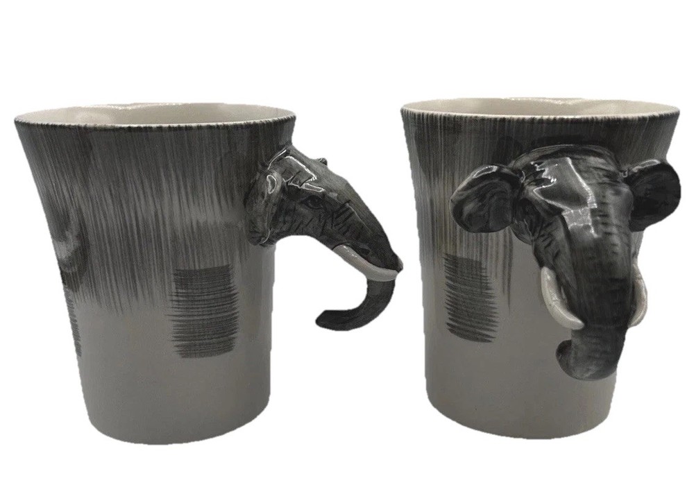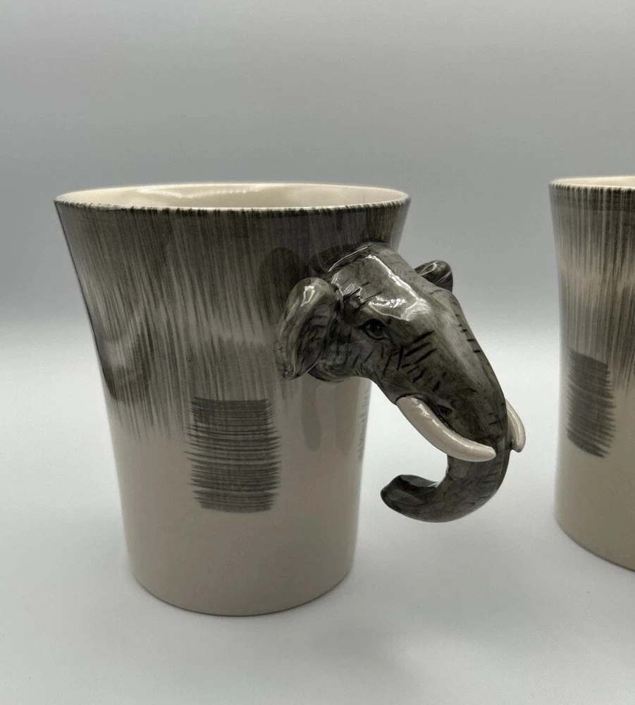This unique set of two Pier 1 Imports mugs features a hand-painted elephant design on a gray stoneware material. The mugs have a 16 oz. capacity and are suitable for hot or cold beverages. They are microwave and dishwasher safe, with a convenient handle for easy use. Perfect for all occasions, these African-themed mugs add a touch of charm to your kitchen collection.