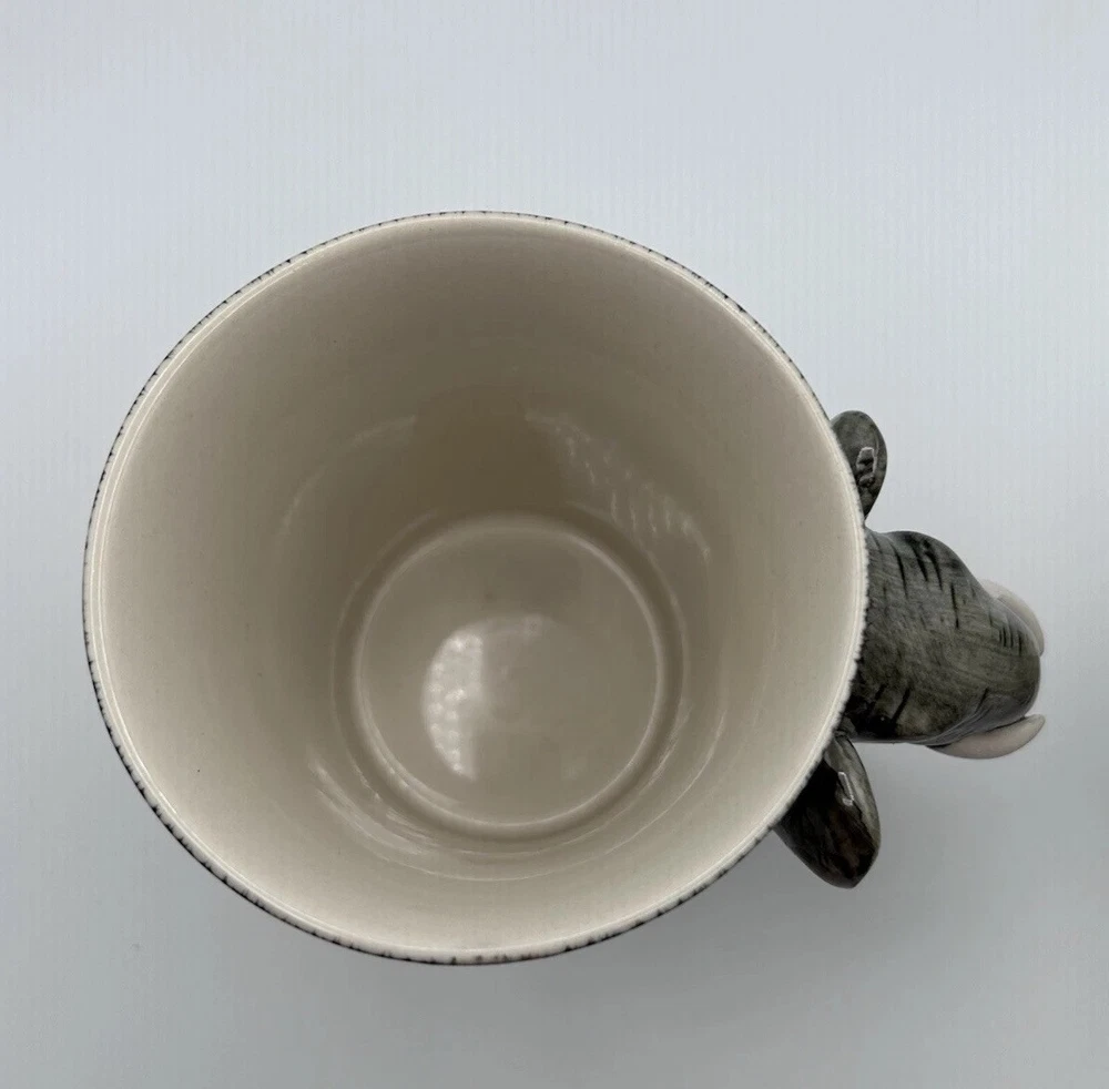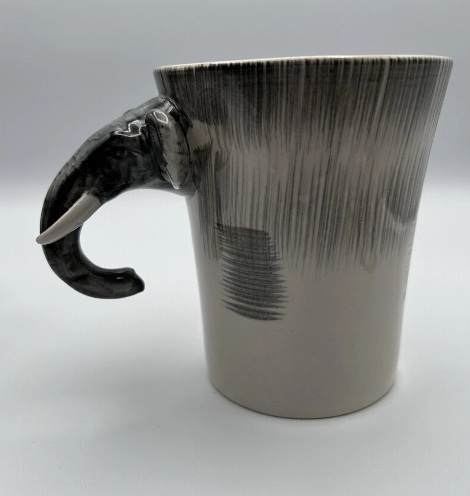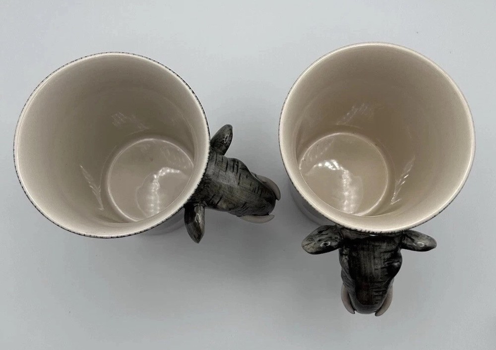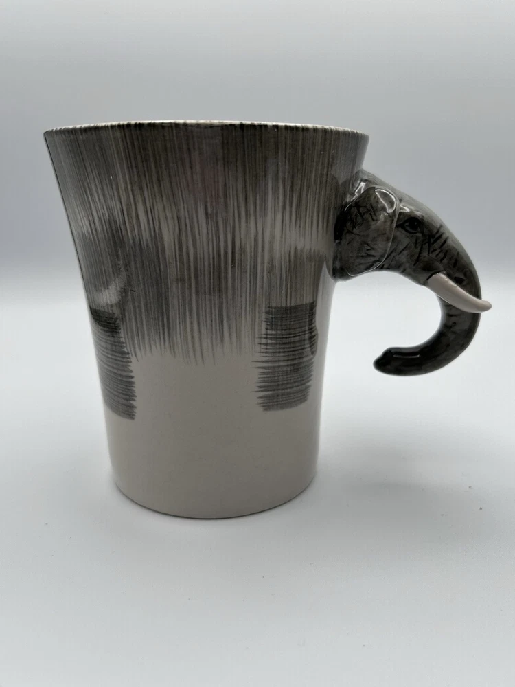 This unique set of two Pier 1 Imports mugs features a hand-painted elephant design on a gray stoneware material. The mugs have a 16 oz. capacity and are suitable for hot or cold beverages. They are microwave and dishwasher safe, with a convenient handle for easy use. Perfect for all occasions, these African-themed mugs add a touch of charm to your kitchen collection.
