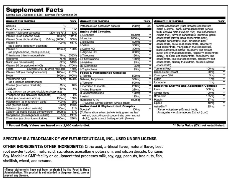 New Formula with 36% More Servings Providing 12 supplements in 1 and now delivering better performance with 85+ highly absorbable nutrients that enhances training sessions and boosts energy in daily life, now with 30 servings (60 scoops) per can Vitamins For Nutrition & Immunity Optimized nutritional values of to meet the daily vitamin, mineral and herb needs of athletes including Zinc, Vitamins C, B, D, plus EAA and BCAA Amino Acids, and more With Spectra® & Astragin™ Spectra® is an all-natural blend of 29 fruits, vegetables, and herbs to help increase blood flow to muscles and support cellular energy through improved oxygen and AstraginTM helps improve nutrient absorption and bioavailability† All in One Product More than a multivitamin, a comprehensive sports nutrition solution that costs less than buying individual supplements separately