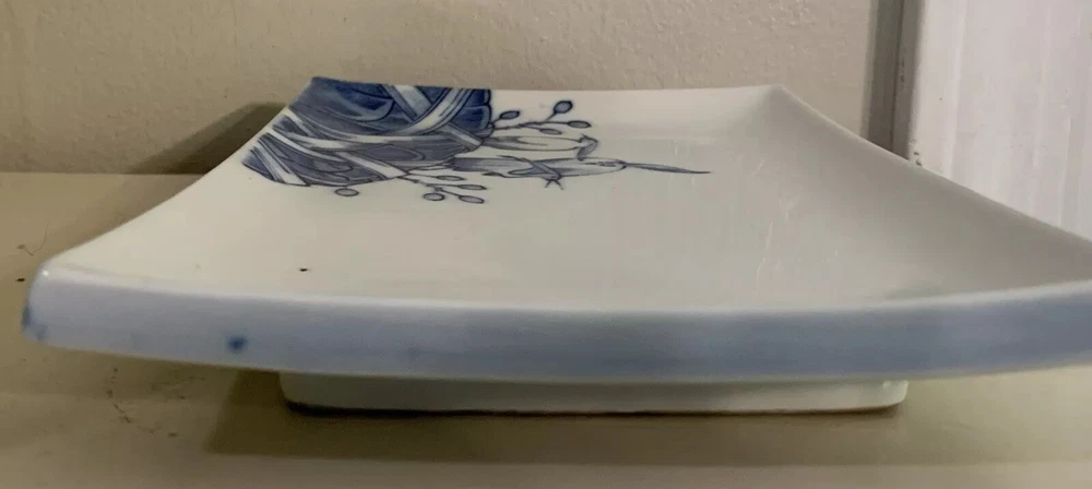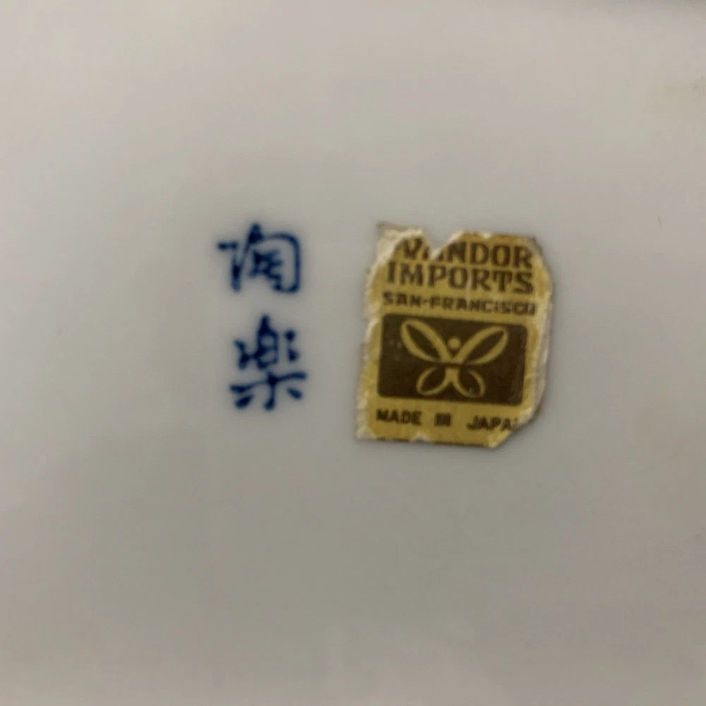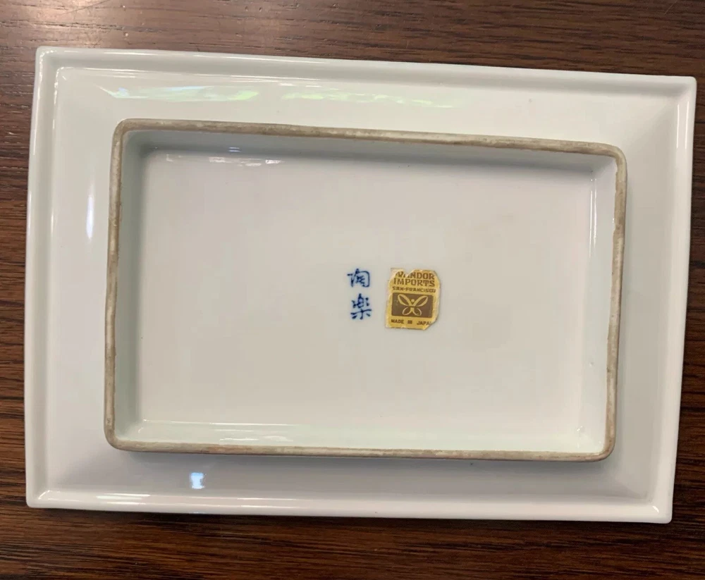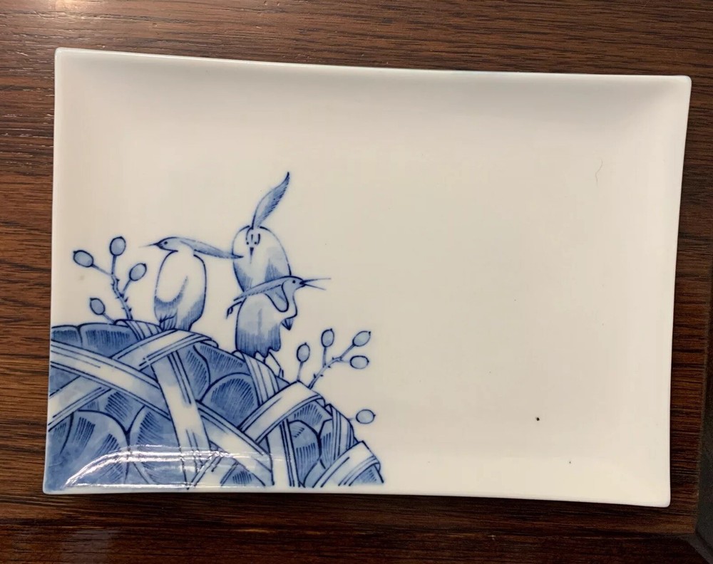 VANDOR IMPORTS Candy dish or trinket tray Made in Japan Vintage White w/ blue design Bird pattern Curved edges Measures 8" x 5.5" x 1" Good used condition. No chips, cracks, crazing, or repairs detected. There are two small "flea bites" (tiny divots) on the top bottom right. Otherwise, it's in great shape. Please send a message if you have any questions, and thanks for looking!