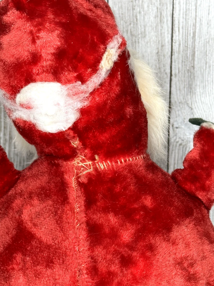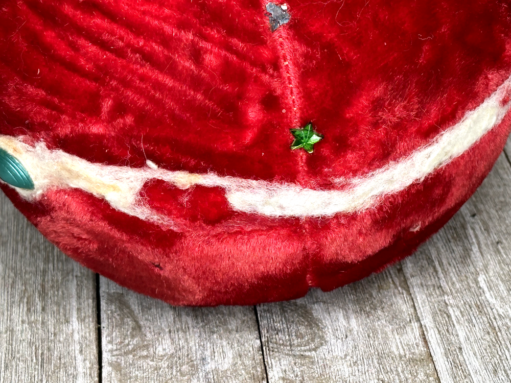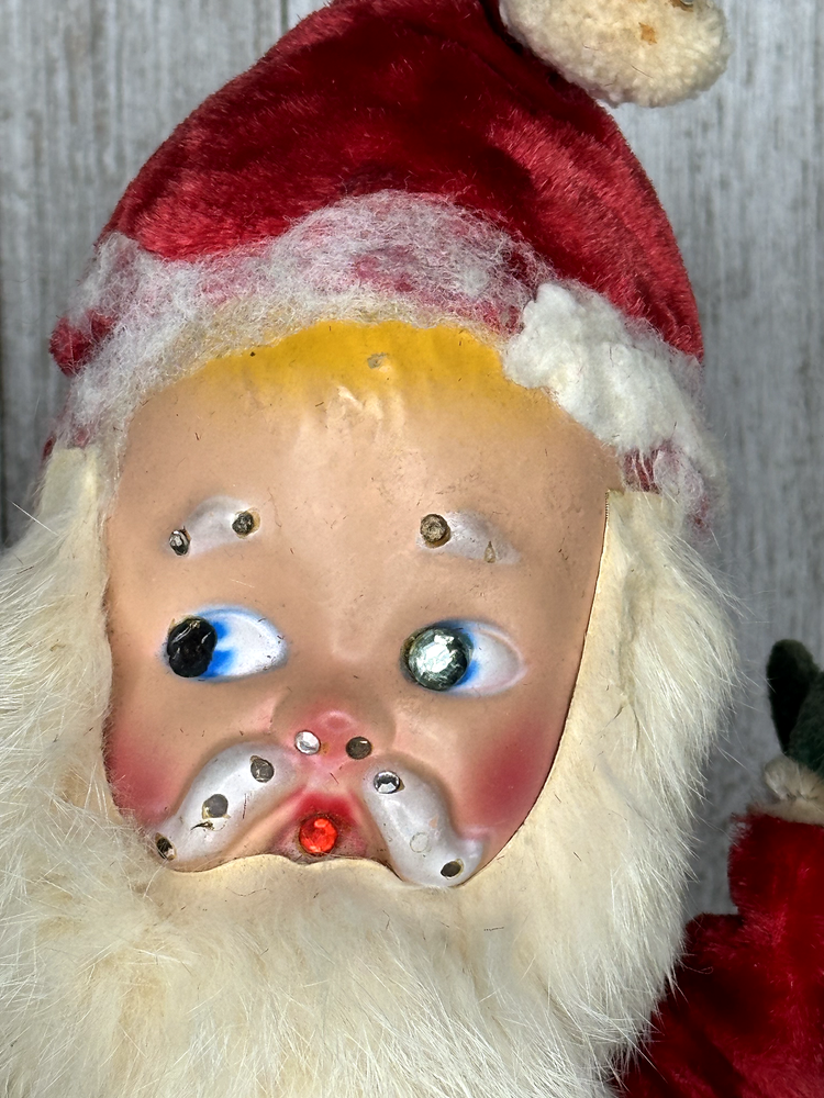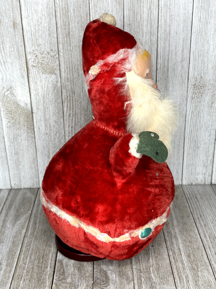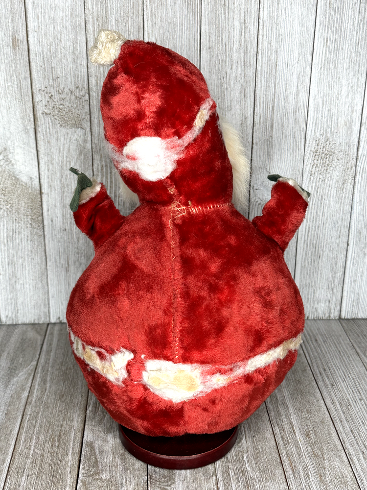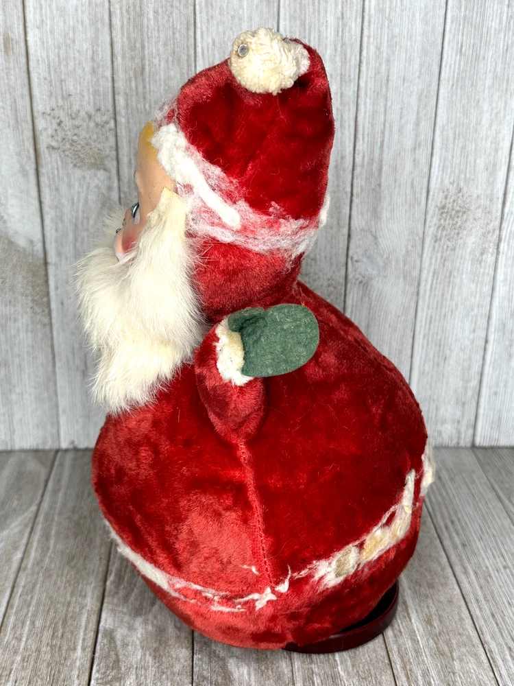 Vintage Roly-Poly Wind-up Music Box Santa. WORKS! When wound, plays "Jingle Bells" and rotates. Has FUR beard. I believe this to have a celluloid face, The trim on Santa's outfit is missing in areas. There are sequin accents on the body and face. (Some of the baubles are missing) There is a rhinestone missing from one eye. There are some discoloration marks. Santa leans on base but still stands without support and rotates freely on wooden base. This is a vintage item and may have age appropriate wear and tear. Please refer to all photos and the description above for closer details of condition. I will gladly combine shipping for multiple purchases.