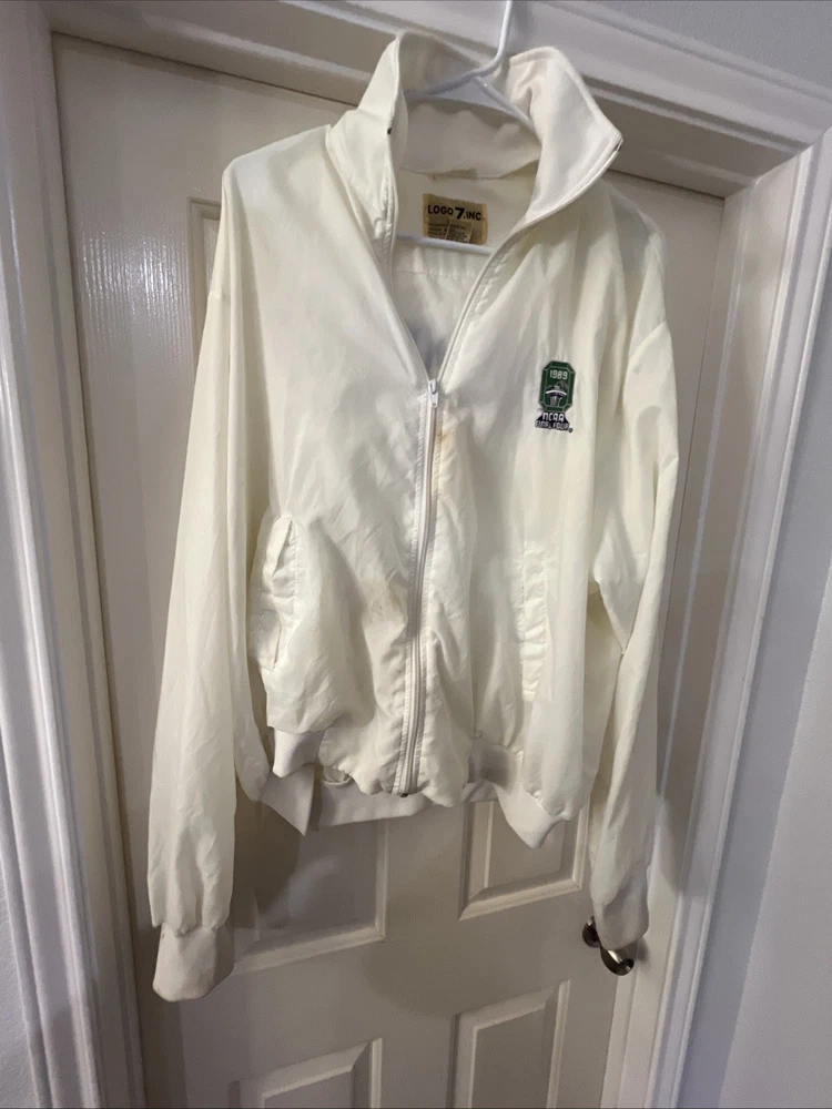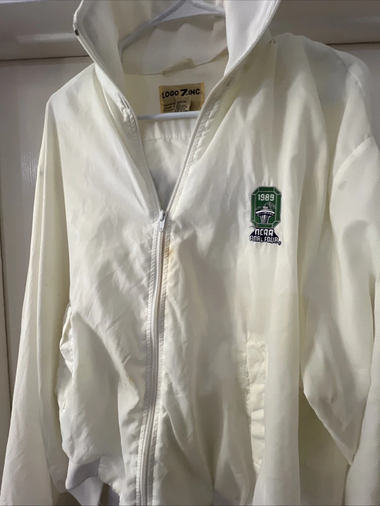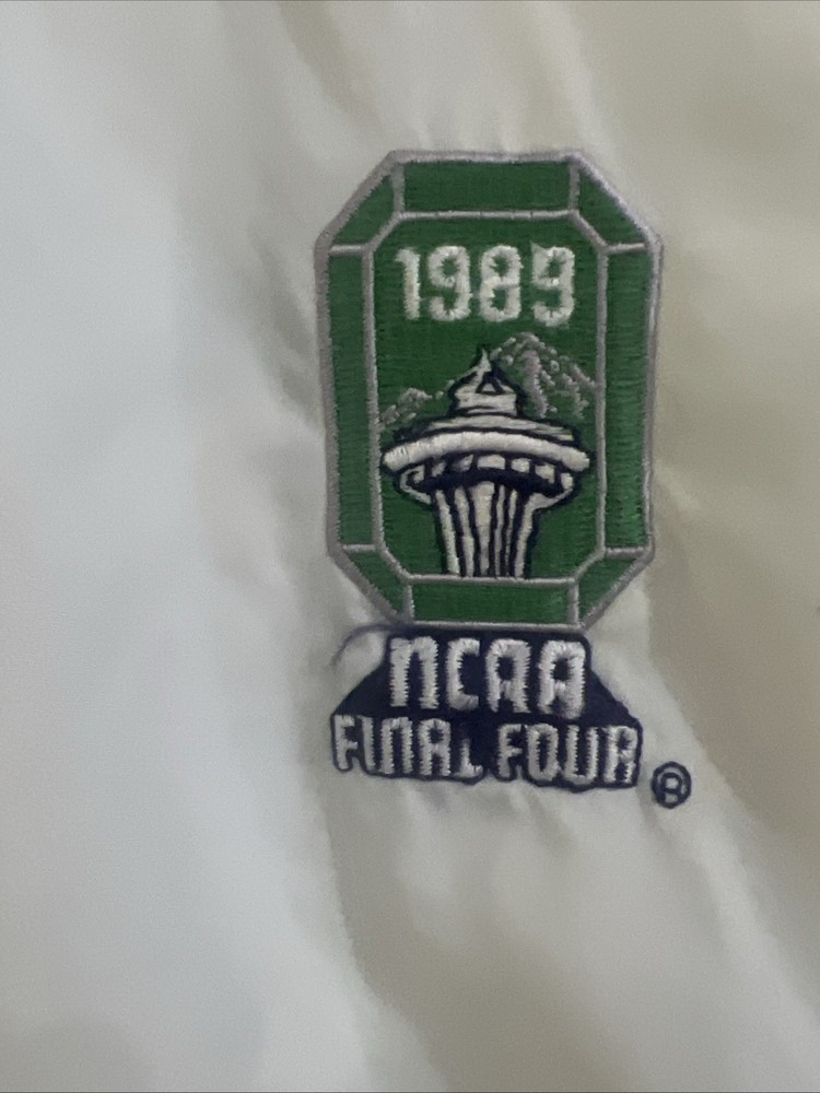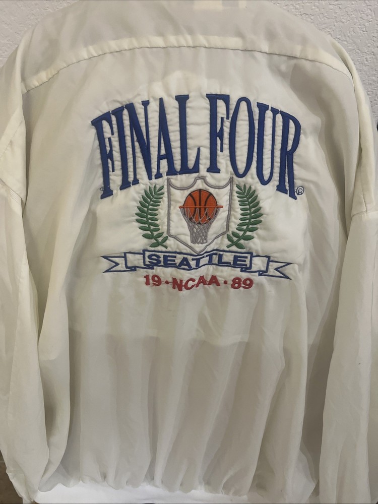 This vintage 1989 NCAA Final Four Windbreaker Jacket in XL size is made of nylon outer shell material with a zip closure. The classic white jacket features the 1989 Final 4 logo with the Space Needle! With a wind-resistant design, this limited edition jacket is perfect for casual occasions during the winter, fall, and spring seasons. It includes pockets, a collared neckline, and is lightweight, making it ideal for walking and outdoor activities. Some small stains on the front (see photos). This NCAA branded jacket captures the college and 80s theme, adding a touch of nostalgia to any outfit.