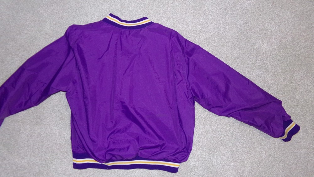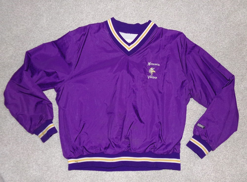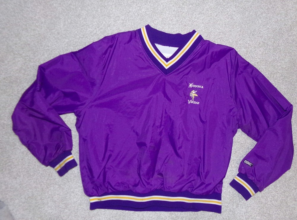 VINTAGE --WELL PRESERVED MINNESOTA VIKINGS PULLOVER--LINED WINDBREACKER JACKET WITH KNIT CUFFS, WAISTBAND AND V-NECK. 1970's?? 1980's ??? RARE FIND IN EXCETIONALL GOOD ORIGINAL COND. --------------- "...