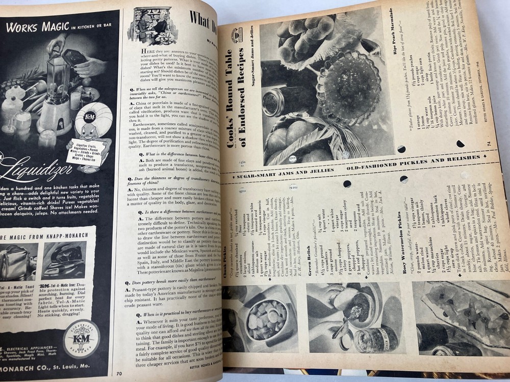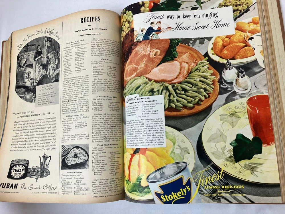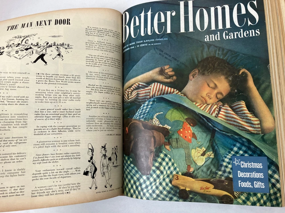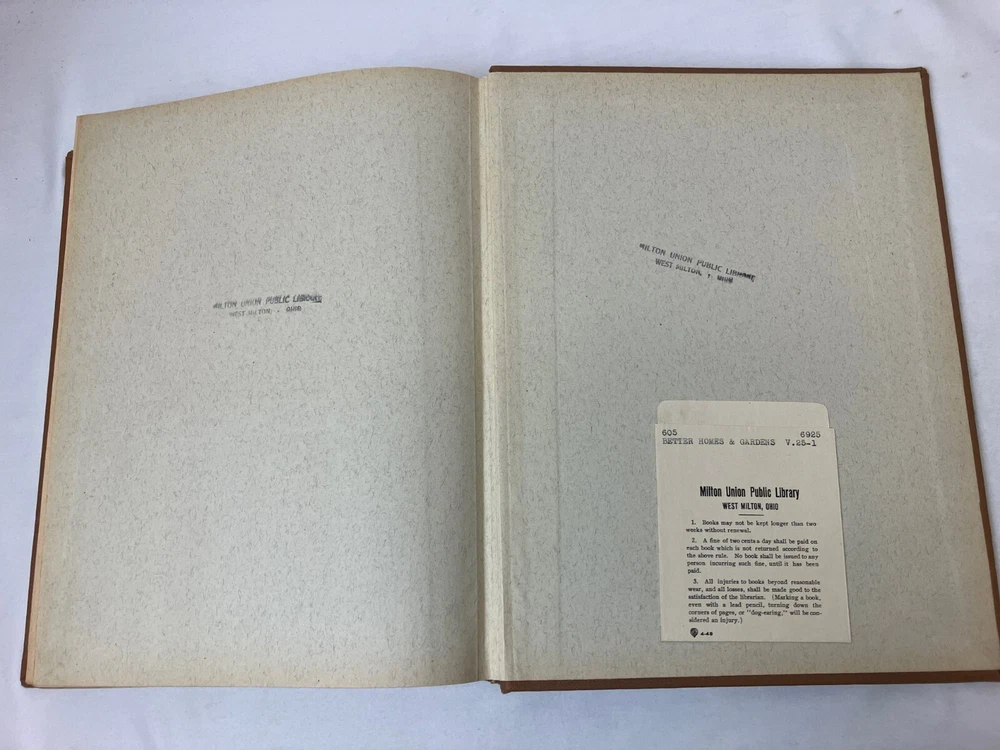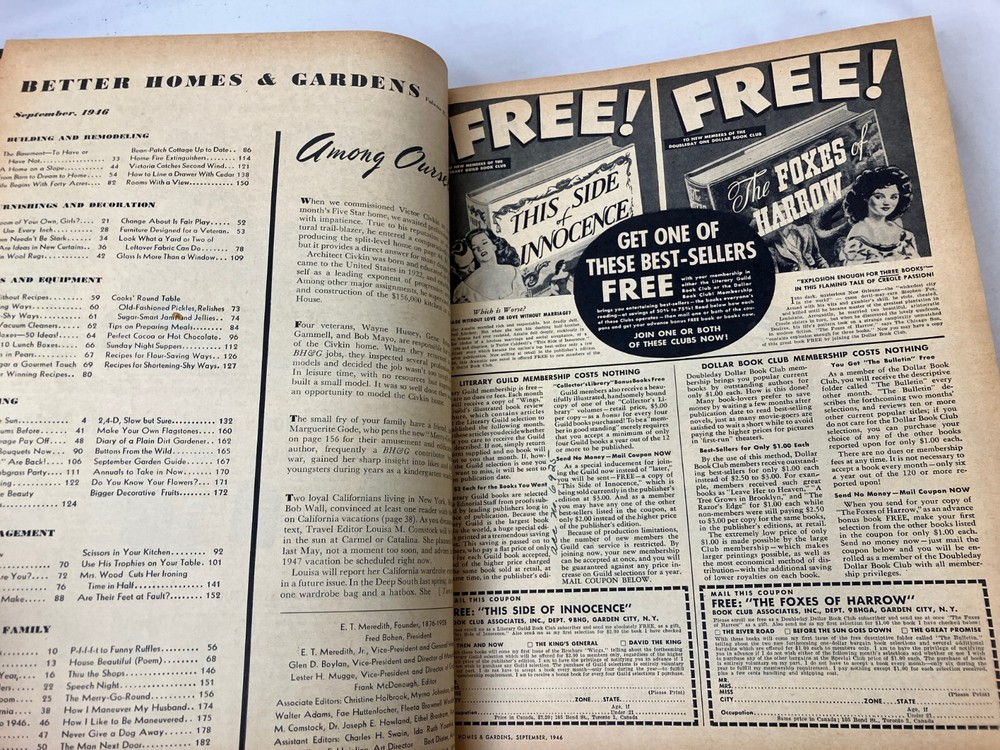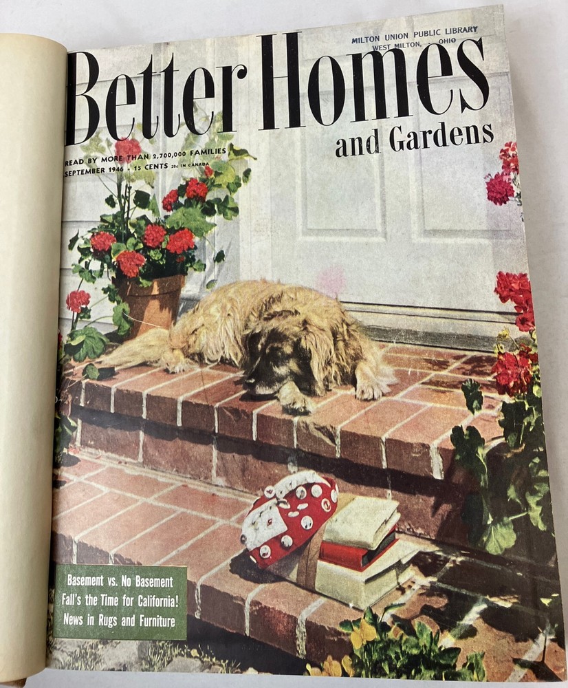 Better Homes and Gardens September-February 1946-1947 This listing includes several issues of this vintage magazine bound into one hardcover volume for library use. Great old ads. Front covers of issues are included, but the back covers are NOT included. Light wear/staining to cover. Book is ex-library: has the usual stamps, notations and a card pocket. There may be a few taped repairs. See photos. [AMF]