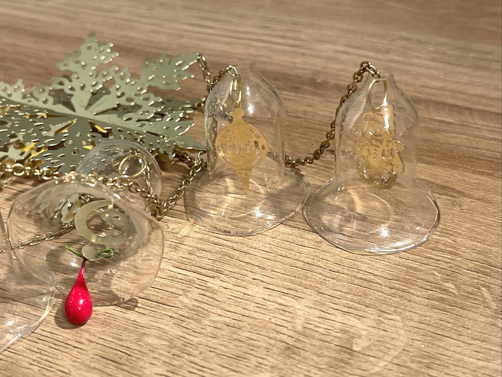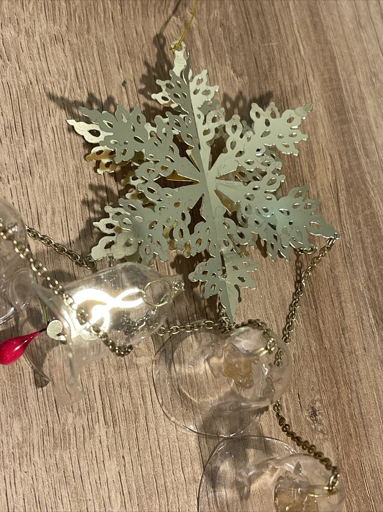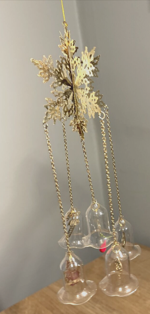Add a touch of vintage charm to your Christmas decor with this beautiful Snowflake Hanging Glass Bells Ornament Wind Chime. Crafted from glass and metal, this medium-sized ornament features an embellished design with a gold color and a unique windchime shape. It's perfect for any Christmas occasion and will make a great addition to your ornament collection. This original Mid-Century Modern style ornament is an attached item that measures 12 inches in height and 3 inches in width. It's suitable for adults over 18 years old and is a great way to personalize your Christmas decor. Whether you're a collector of vintage ornaments or just looking for a unique decoration, this piece is sure to impress.