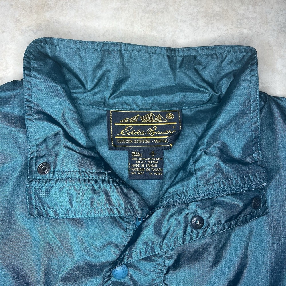 Eddie Bauer Vintage 90s Pullover Windbreaker Jacket Blue Design Features: Ripstop, Rain Wind Resistant, Snap Button Zipper Henley, Zip Pocket, Long Sleeve, Lightweight, Packable, Loose Relaxed Fit, Retro Mens Size Medium Material: 100% Nylon Condition: Pre-Owned Good No stains, holes or tears