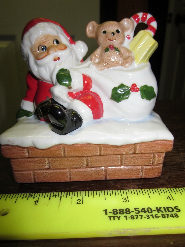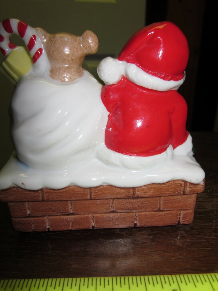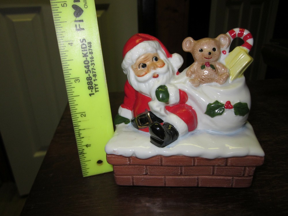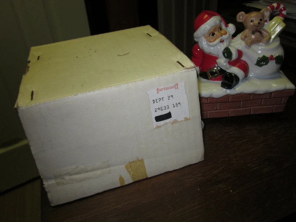 VINTAGE HAND PAINTED CERAMIC SANTA ON CHIMNEY WIND UP FIGURINE- IT SPINS AND PLAYS MUSIC. NEW IN ORIGINAL BOX FROM FORTUNOFF DEPT. STORE. 4" WIDE BY 4" TALL. MADE IN JAPAN