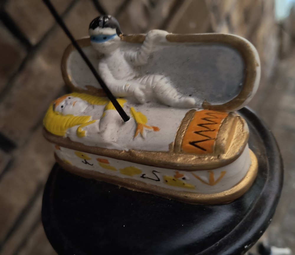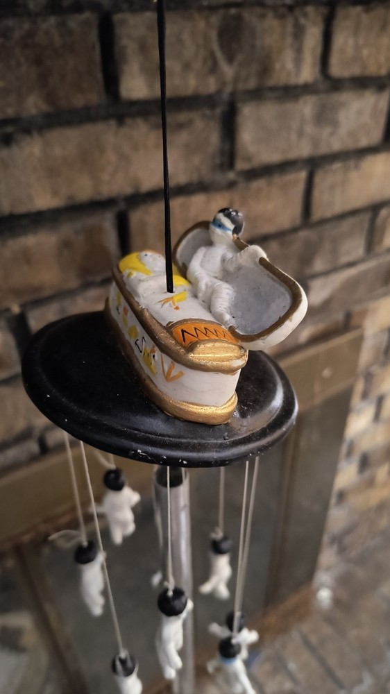The Vintage Halloween Ceramic Wind Chime Coffin from the 90s with 8 Hanging Mummy Chimes by C. R. Seasons is a medium-sized outdoor décor piece perfect for Halloween. Made with mixed materials and ceramic, this multicolored wind chime features a spooky Halloween theme with a glossy finish. The coffin shape and mummy chimes add an eerie, fun, eye-catching touch to your Halloween decor. With a length of 14 inches, this wind chime is sure to bring a festive and creepy vibe to your yard or garden. Used in good condition with original box. ____________________________________ **Important** Please read the following and only bid or buy if you agree to these terms. Payment is due within 3 days of the end of auction or date of purchase. I will ship the item within 3 business days after payment has cleared. Ask questions before bidding or buying. If you are unsure about the description or need further information, do not hesitate to email me. Communication is key! If you are unhappy with your item when you receive it, please contact me before leaving feedback or opening a case so we can resolve any issues. I want everyone that shops with me to be happy with their purchase. Shipping within the Continental U.S. to CONFIRMED address on eBay account only. Thanks for looking, and thanks for supporting the small sellers of eBay!