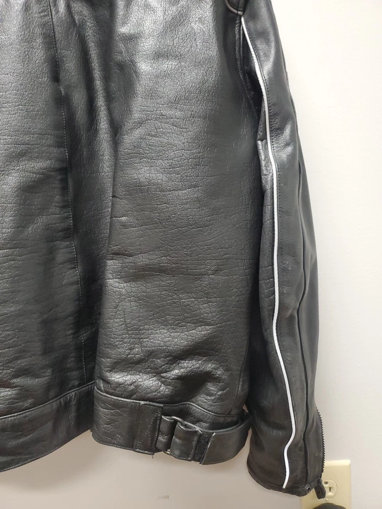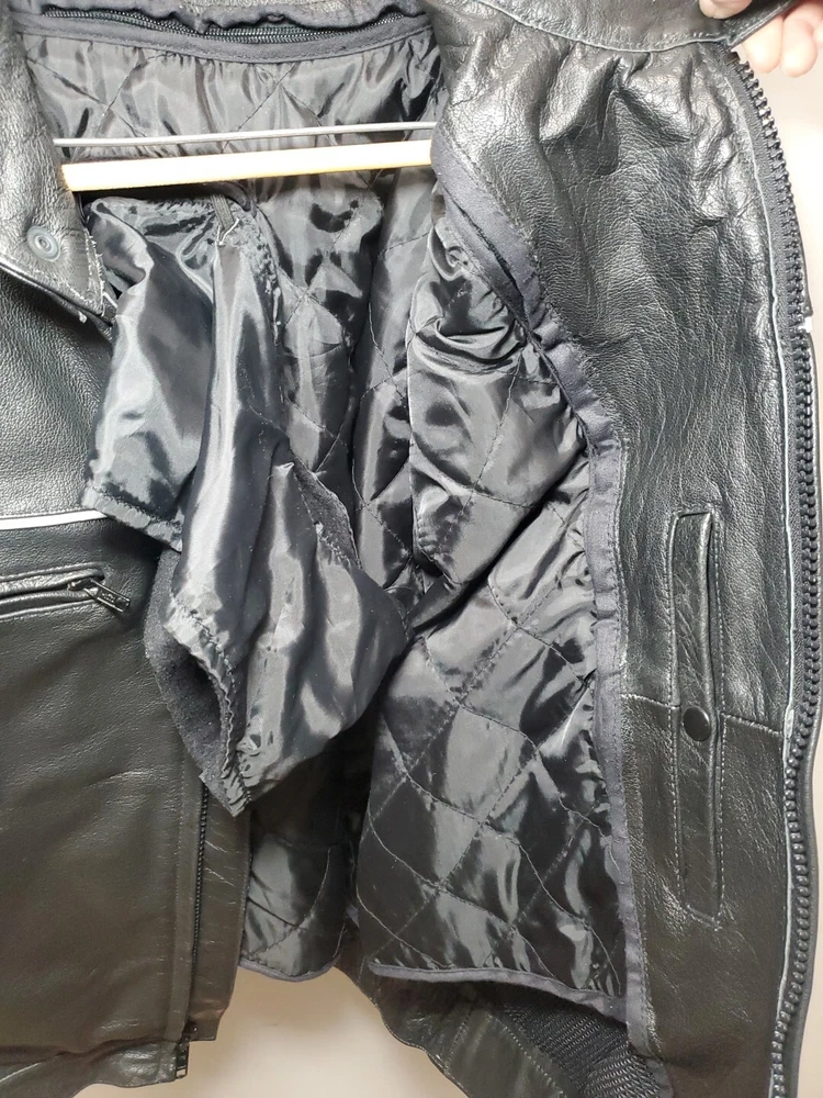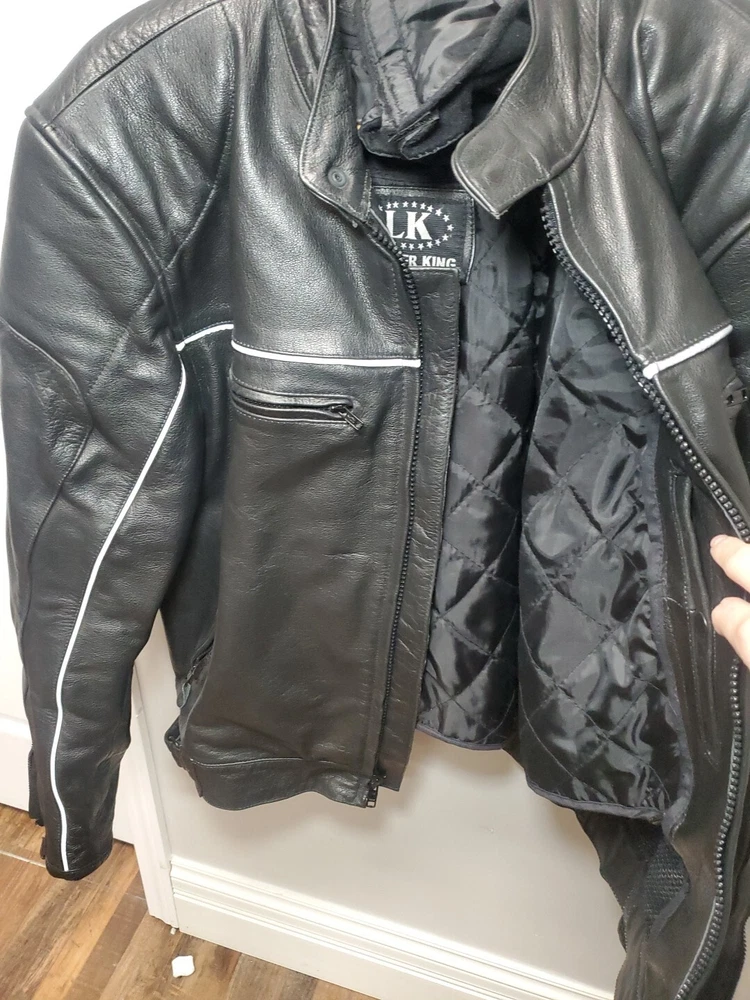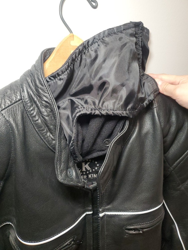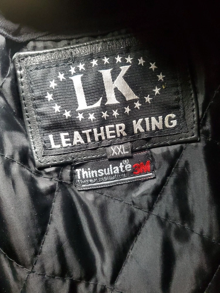 This Vintage Leather King Motorcycle Jacket is the perfect addition to any biker's wardrobe. Made of high-quality cowhide leather, this jacket is both water and wind-resistant, making it ideal for all seasons. With a full zipup front, belted design, and 4 outside zipper pockets, 1 long zipper along backside, 2 inside snap pockets, & zipper sleeves...it's not only stylish but practical too! This German Leather jacket features 3M Thinsulate insulation and a removable lining, making it the perfect jacket for those who want to stay warm in colder weather. The jacket also comes with a host of features, including a collarless design, padded and thermal lining, and removable collar. This jacket is a must-have for all motorcycle enthusiasts! 3M scotchlite on outside leather. Includes a detachable fleece neck cover. **Thank you for supporting Jefferson County Habitat for Humanity and helping us fulfill our mission to help families in need!!! ♡♡♡
