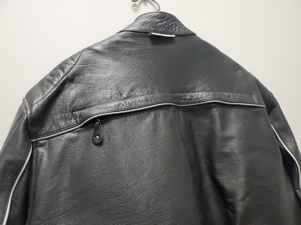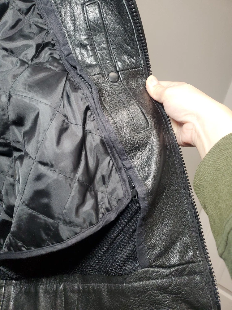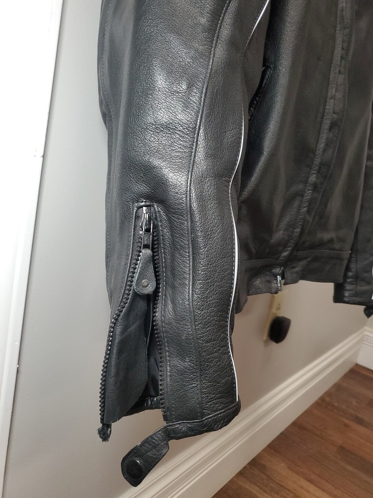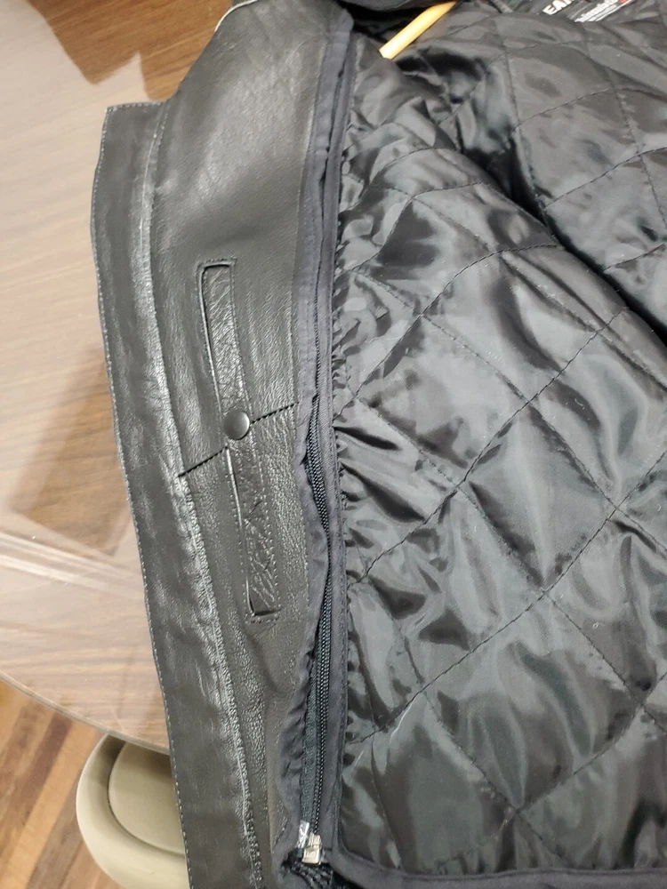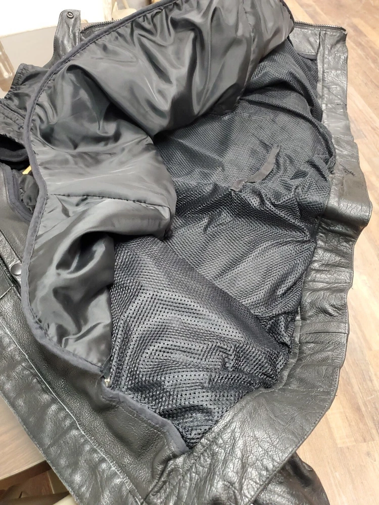 This Vintage Leather King Motorcycle Jacket is the perfect addition to any biker's wardrobe. Made of high-quality cowhide leather, this jacket is both water and wind-resistant, making it ideal for all seasons. With a full zipup front, belted design, and 4 outside zipper pockets, 1 long zipper along backside, 2 inside snap pockets, & zipper sleeves...it's not only stylish but practical too! This German Leather jacket features 3M Thinsulate insulation and a removable lining, making it the perfect jacket for those who want to stay warm in colder weather. The jacket also comes with a host of features, including a collarless design, padded and thermal lining, and removable collar. This jacket is a must-have for all motorcycle enthusiasts! 3M scotchlite on outside leather. Includes a detachable fleece neck cover. **Thank you for supporting Jefferson County Habitat for Humanity and helping us fulfill our mission to help families in need!!! ♡♡♡