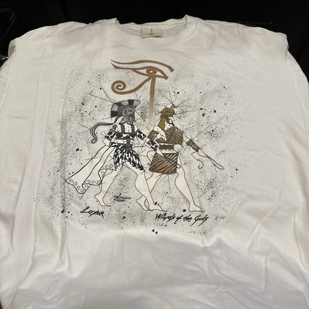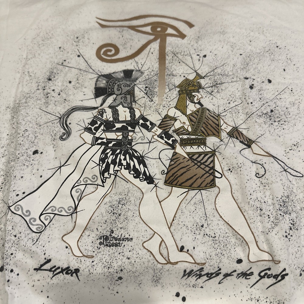 This vintage Luxor Winds of the gods T-Shirt is a unique addition to any collection. The shirt features a graphic print of Frederic Jinear Art and is made of comfortable cotton material. It has short sleeves and a regular fit, making it suitable for all seasons. The white shirt is a size XL and is perfect for men who appreciate art and casino-themed clothing. It is a regular size type and was made in the United States by Pyramid creations. This T-Shirt is a great choice for those who want to stand out with a unique style. 2-033024A11