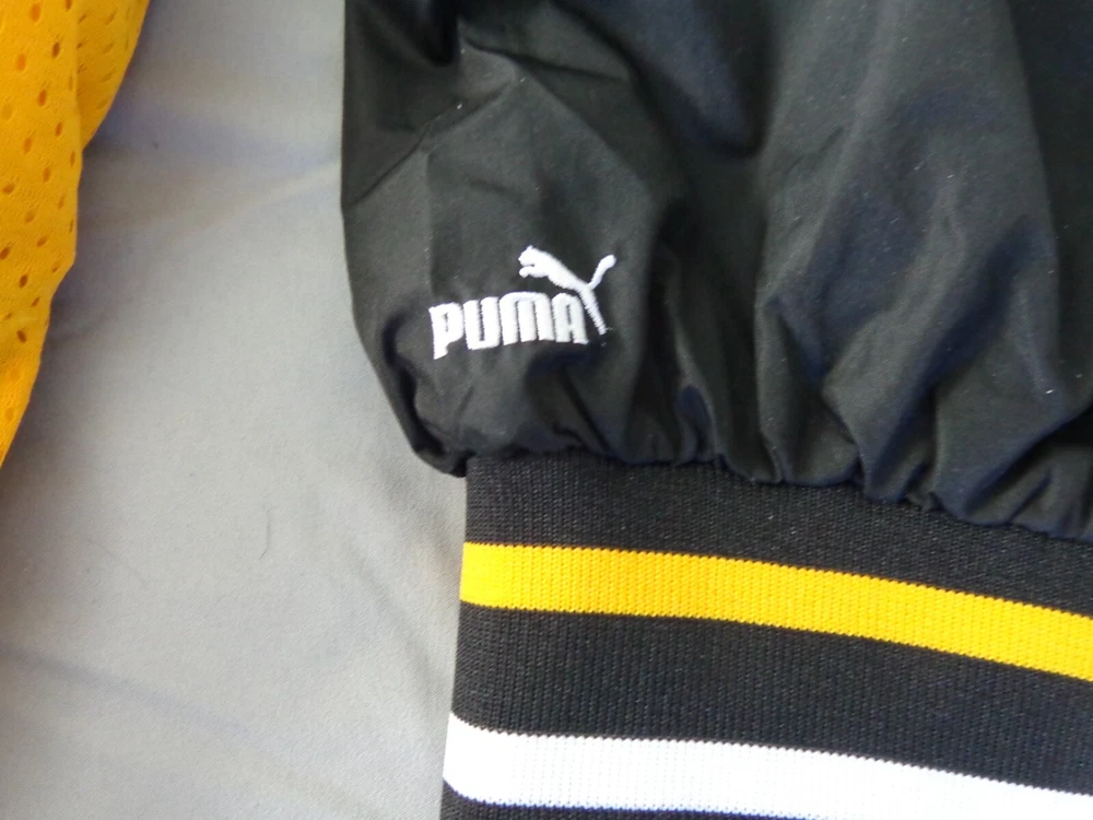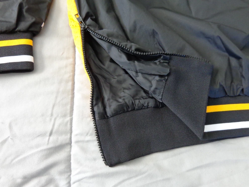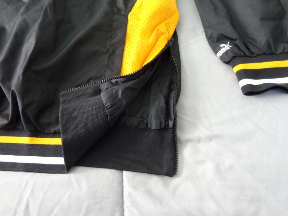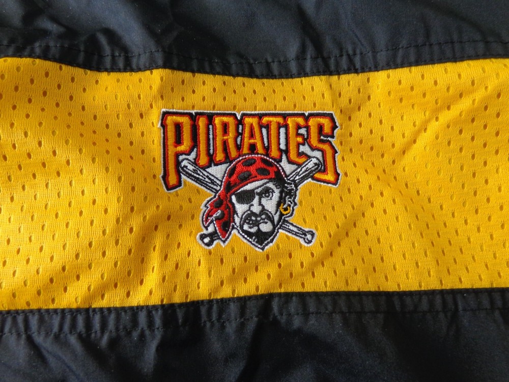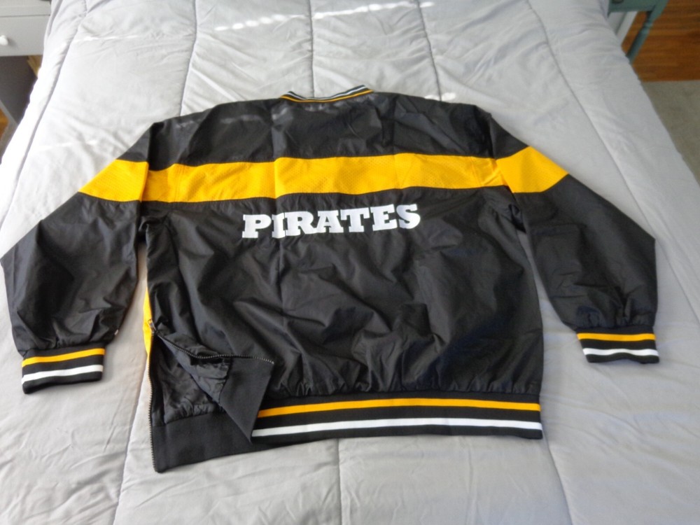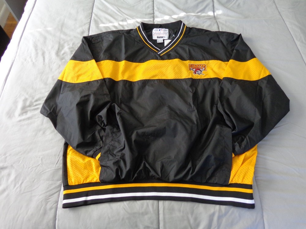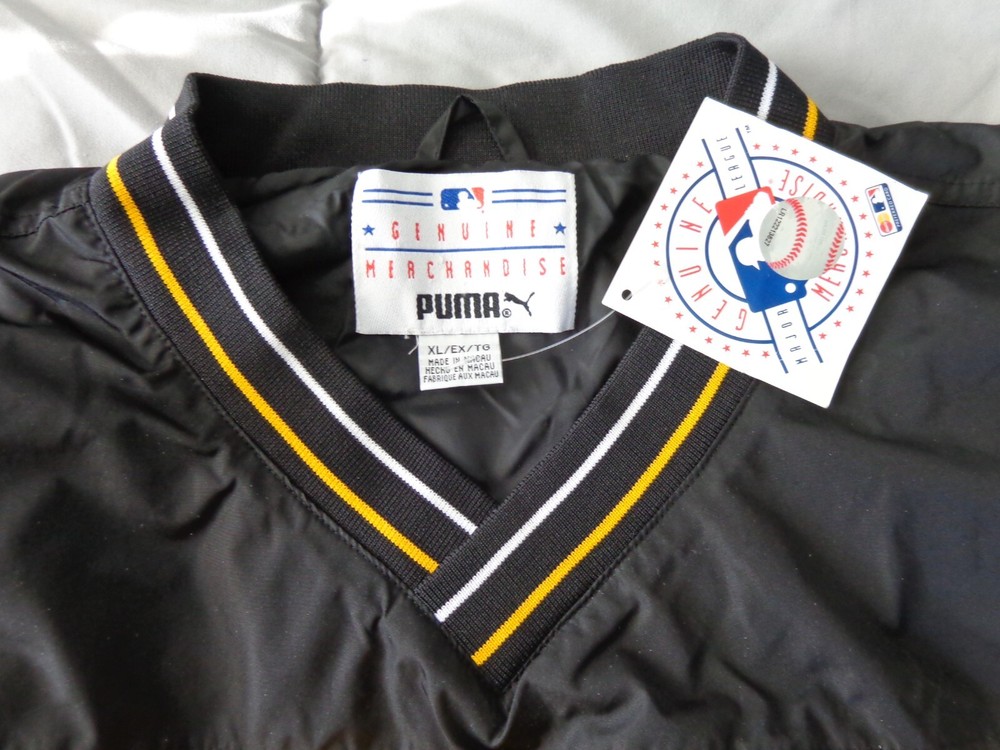 VINTAGE MLB Pittsburgh Pirates Black Wind Breaker Heavy Duty by Puma 2- Pocket V- Neck Outer Shell 100% Poly. Fully Lined 100 % Nylon 1/4 Zip Side 28 in. Chest 30 in. Shoulder to Waist 70 in. Cuff to Cuff Size - XL Brand new with tags. BUY IT NOW $74.50 FREE SHIPPING !!!