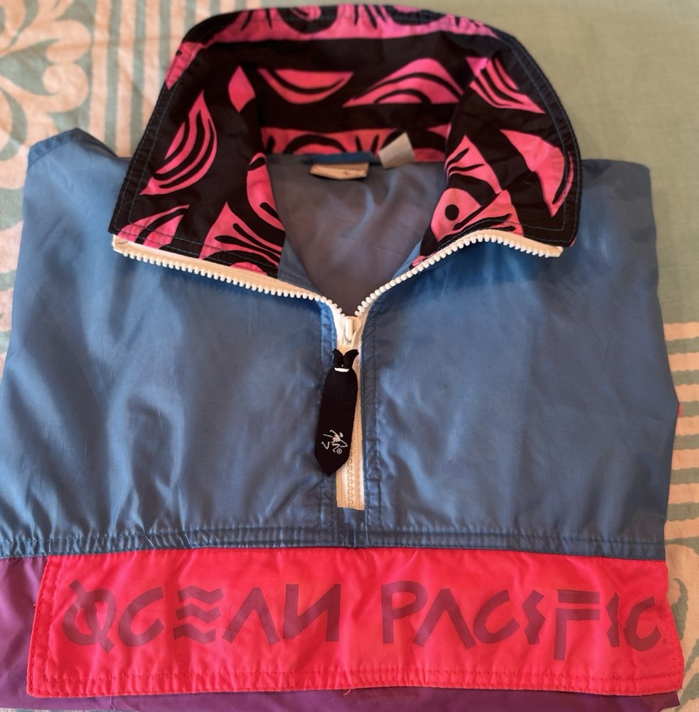The Vintage Neon Ocean Pacific OP windbreaker jacket from the 80s-90s is a stylish and versatile piece perfect for surf and casual wear. Made of nylon with a color block pattern, this short-length windbreaker features a pullover style with a zipper closure and pockets for added convenience. The classic fit, stand-up collar, and lightweight design make it suitable for various activities like walking, tennis, golf, skiing, skateboarding, and running. With its retro logo accents and vibrant multicolor design, this Ocean Pacific windbreaker is a must-have for any vintage fashion enthusiast.