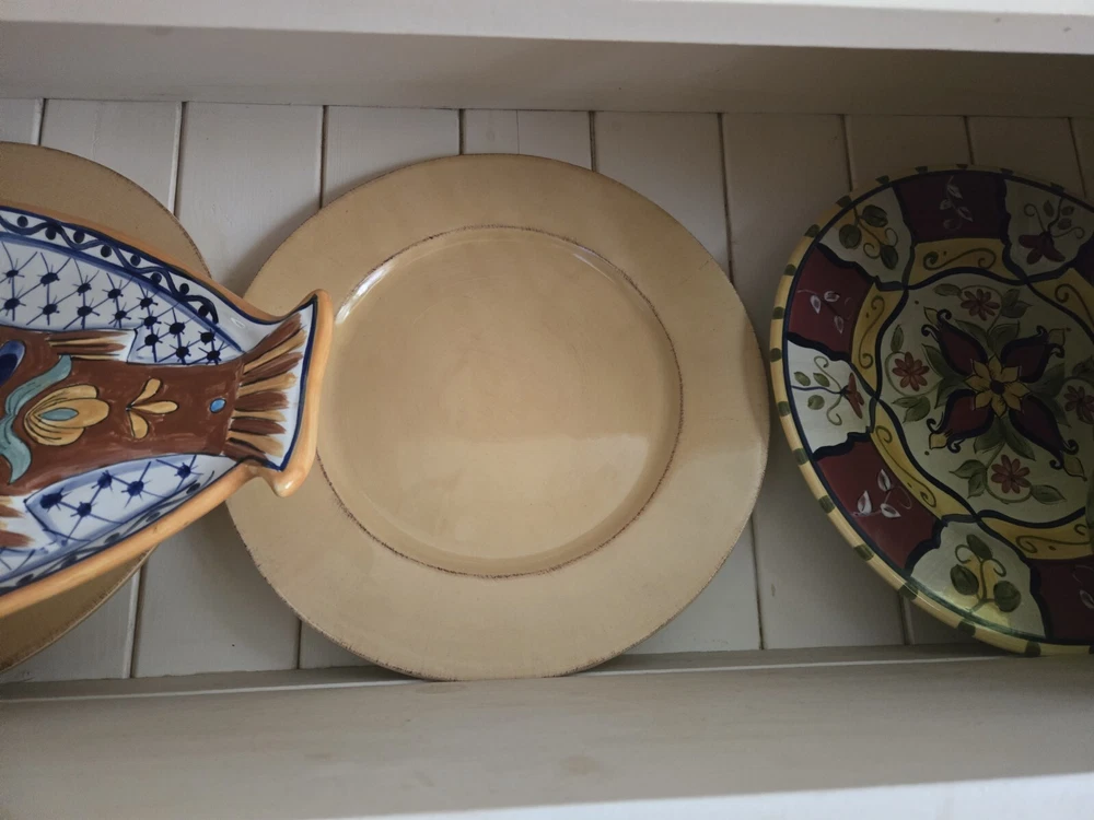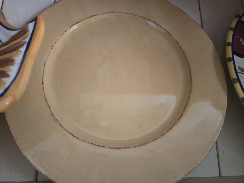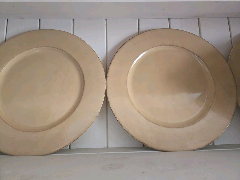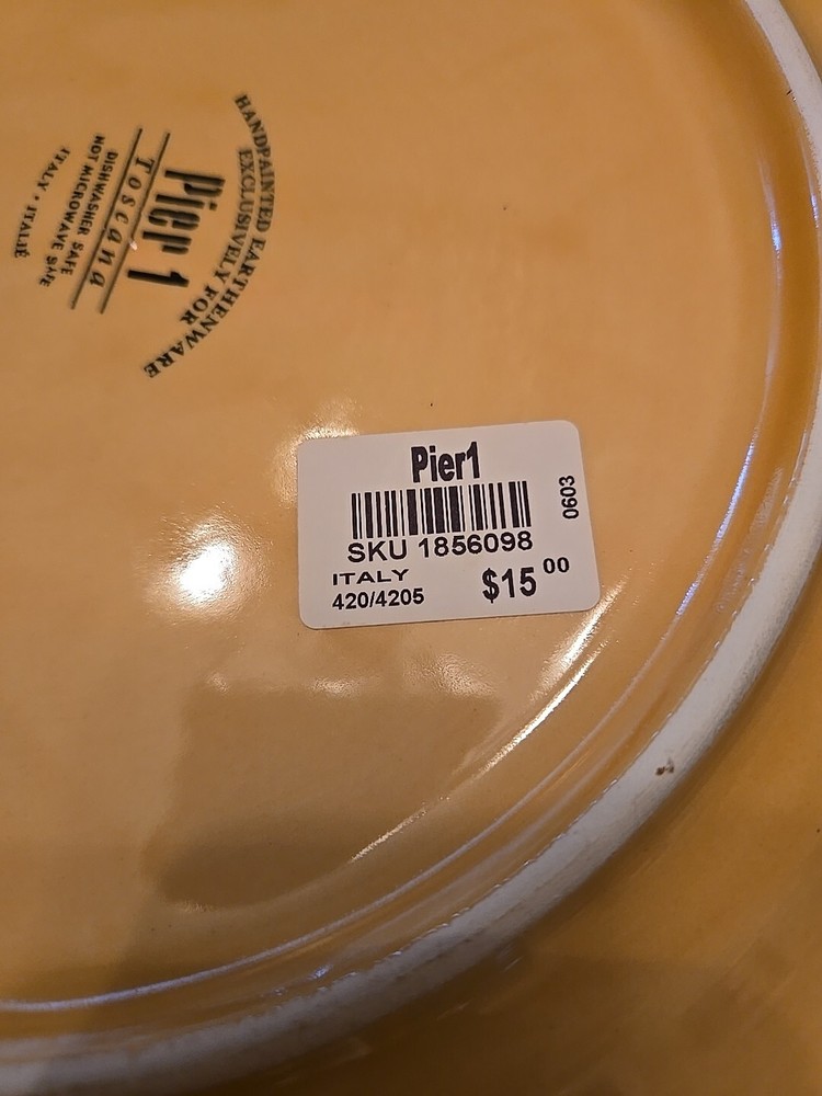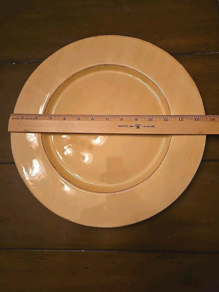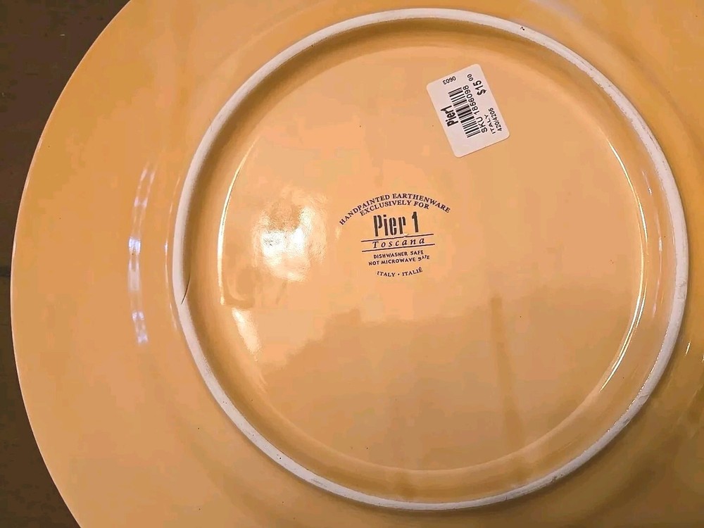 This listing is for one Vintage TOSCANA Gold Earthenware Charger Plate by Pier 1. Width: 13 5/8 in Earthenware Crafted In Italy Discontinued Piece Made in Italy, the incredible generous size of 13 5/8"makes th i s plate extremely versatile as either a primary dinner plate or as a charger to frame a complimentary color pattern. Original & ONLY owner. I purchased these plates brand new circa 2005 from my local Pier1 store. This plate is pre-owned but in "new other" condition. It was only used for primary hutch display and stored carefully when not displayed. Please see photos . Please contact me with any questions. Thanks for looking 💙 These plates are heavy ~3.5lbs each! I've selected the most reasonable carrier flat rate price and option. Note that the shipping fee shown is for ONE PLATE ONLY. If two or more are purchased, shipping will need to be adjusted accordingly.