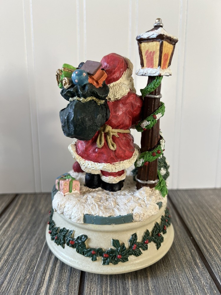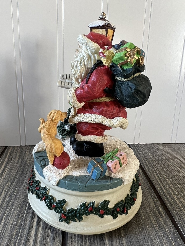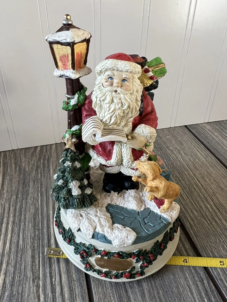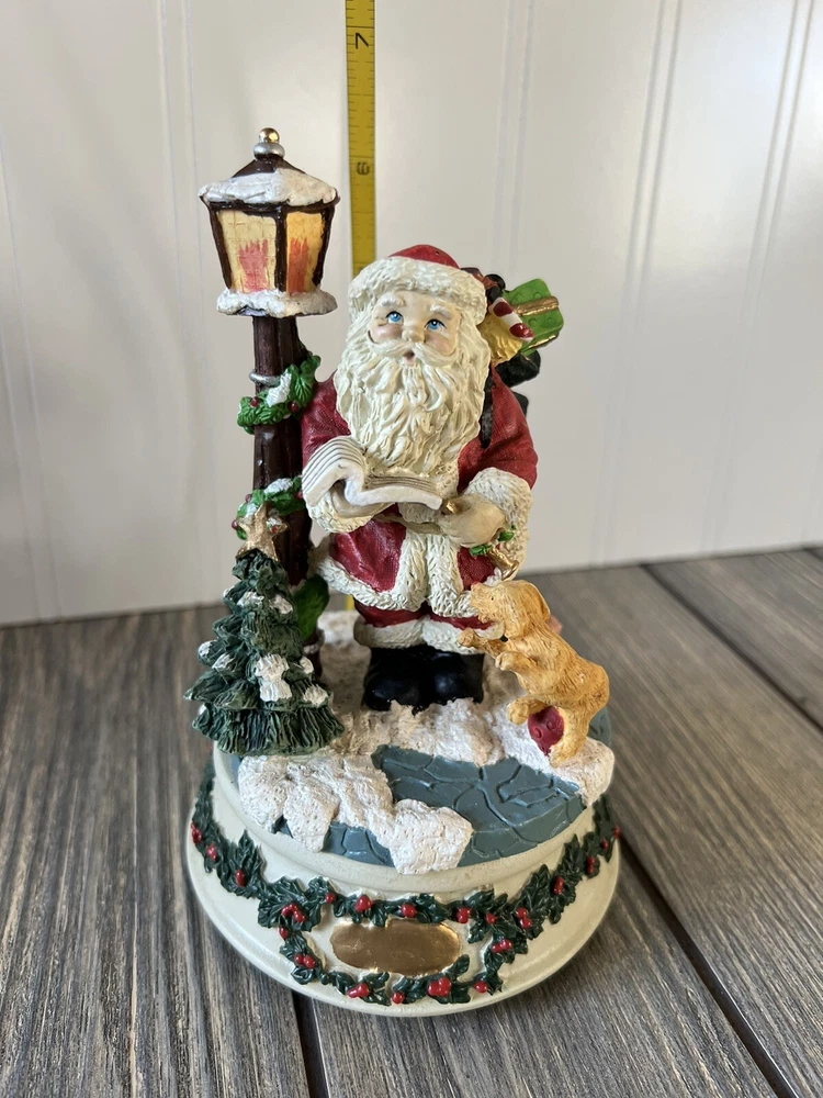VINTAGE Santa Wind Up Music Plays "SANTA CLAUS IS COMING TO TOWN” Dog Tree Lamp. Excellent condition with cracks or chips. Tested and works great. Very cute vintage wind up. Not branded but possibly Enesco. See pictures for details and measurements.