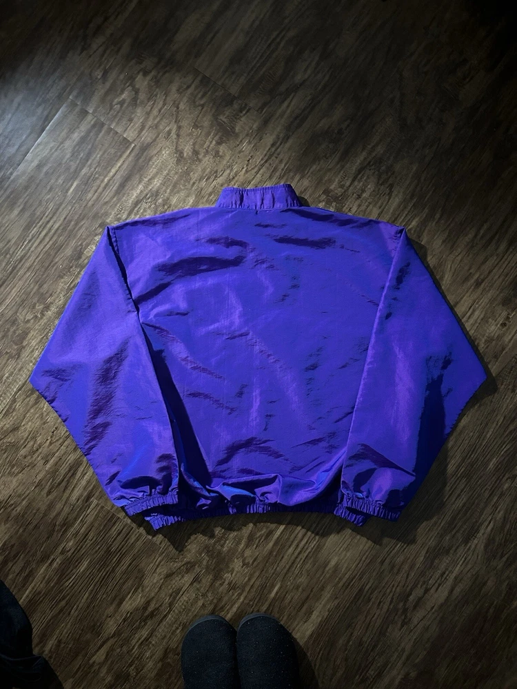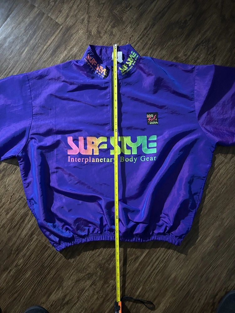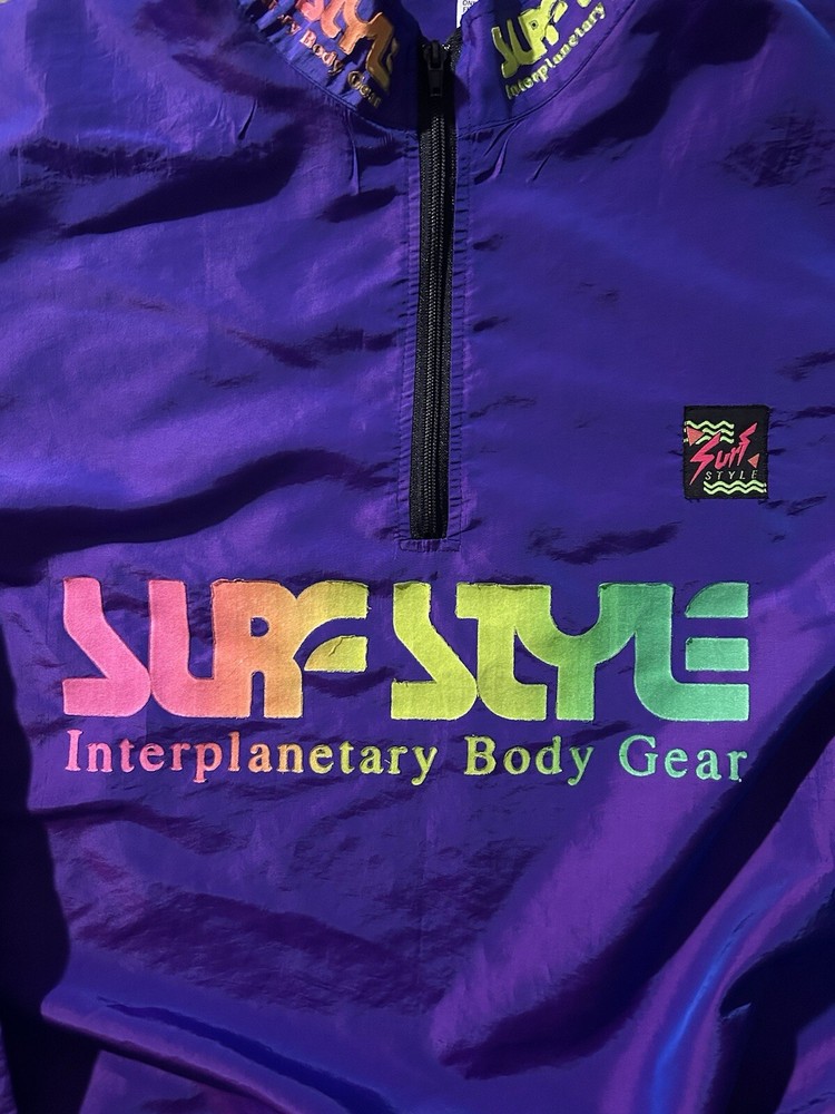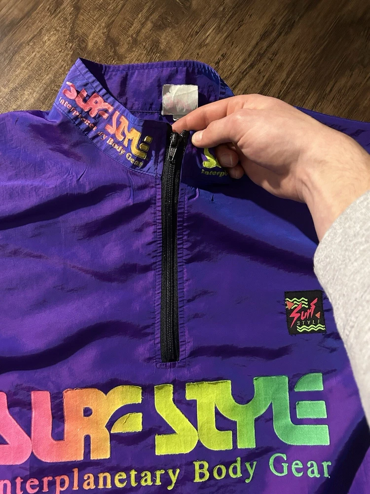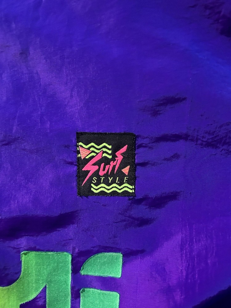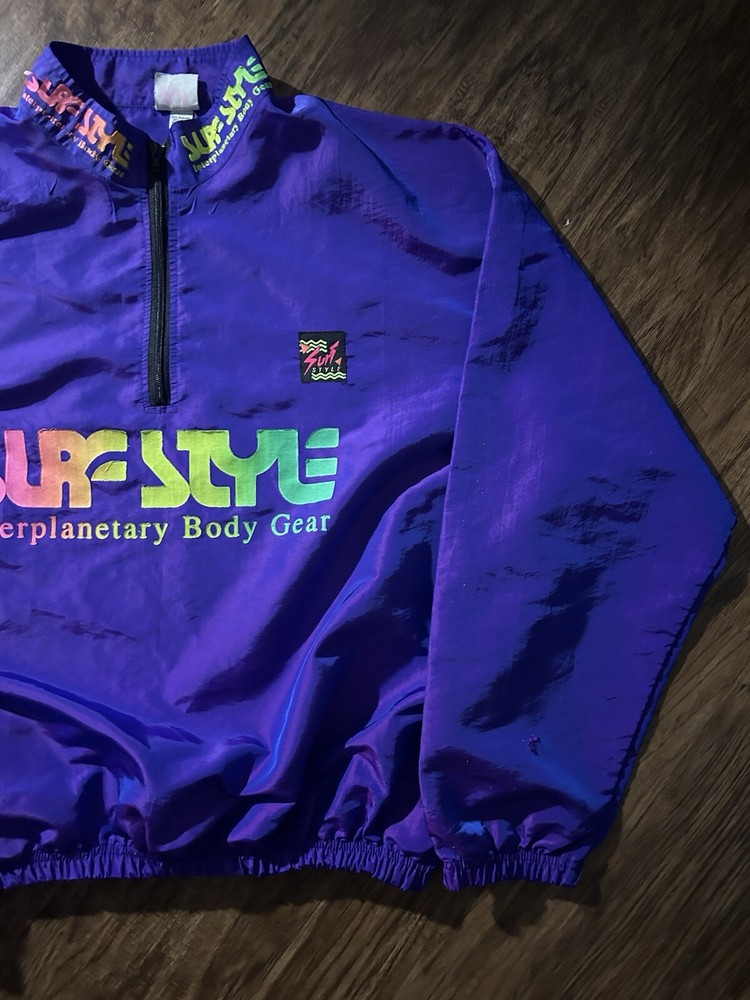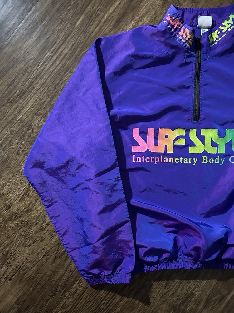 This vintage Surf Style windbreaker jacket features an iridescent purple color with a half-zip closure and a mid-length design. Made of nylon with a softshell fabric type, it has a retro 90s theme and reflective accents. The jacket is oversized and has an elastic waist for a comfortable fit, making it suitable for all seasons. With water-resistant and wind-resistant properties, it is ideal for travel, casual wear, walking, running, and jogging activities. Add a touch of nostalgia to your wardrobe with this limited edition piece from Surf Style.