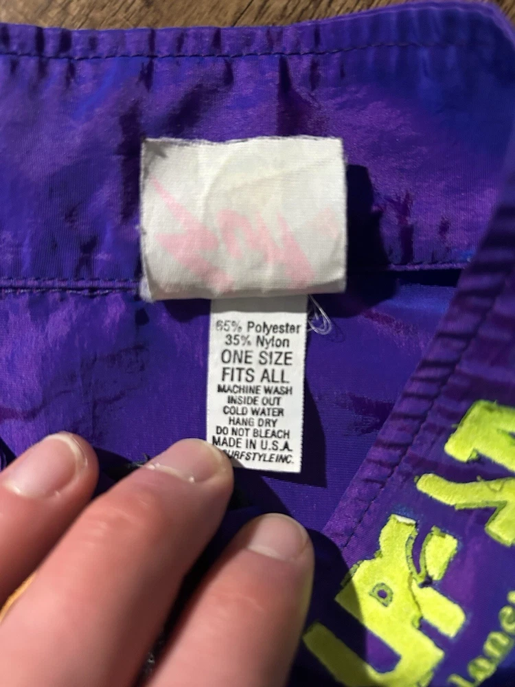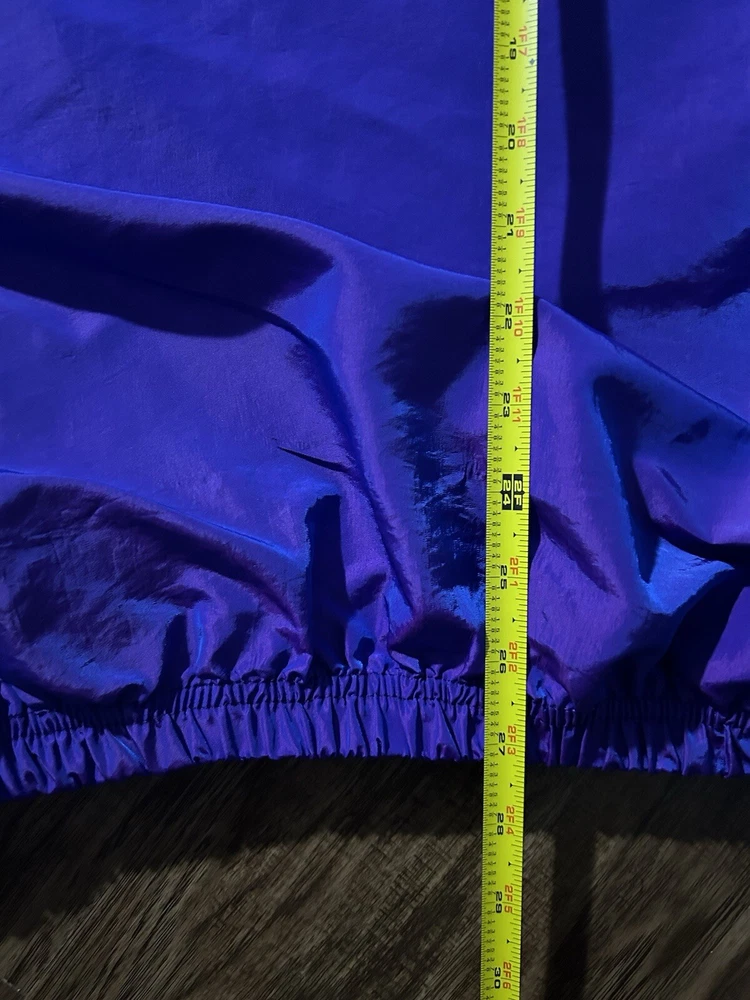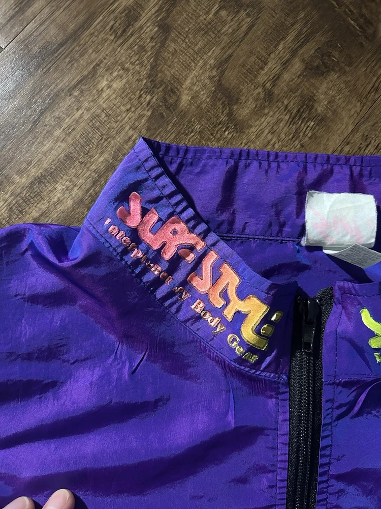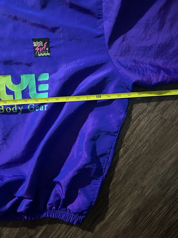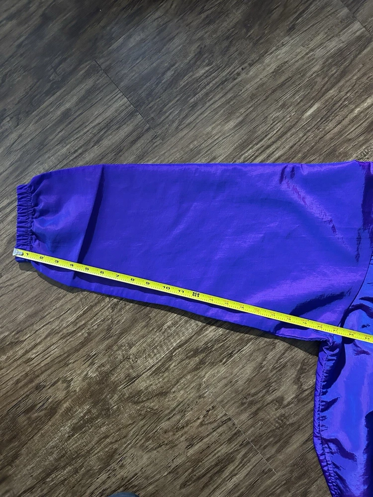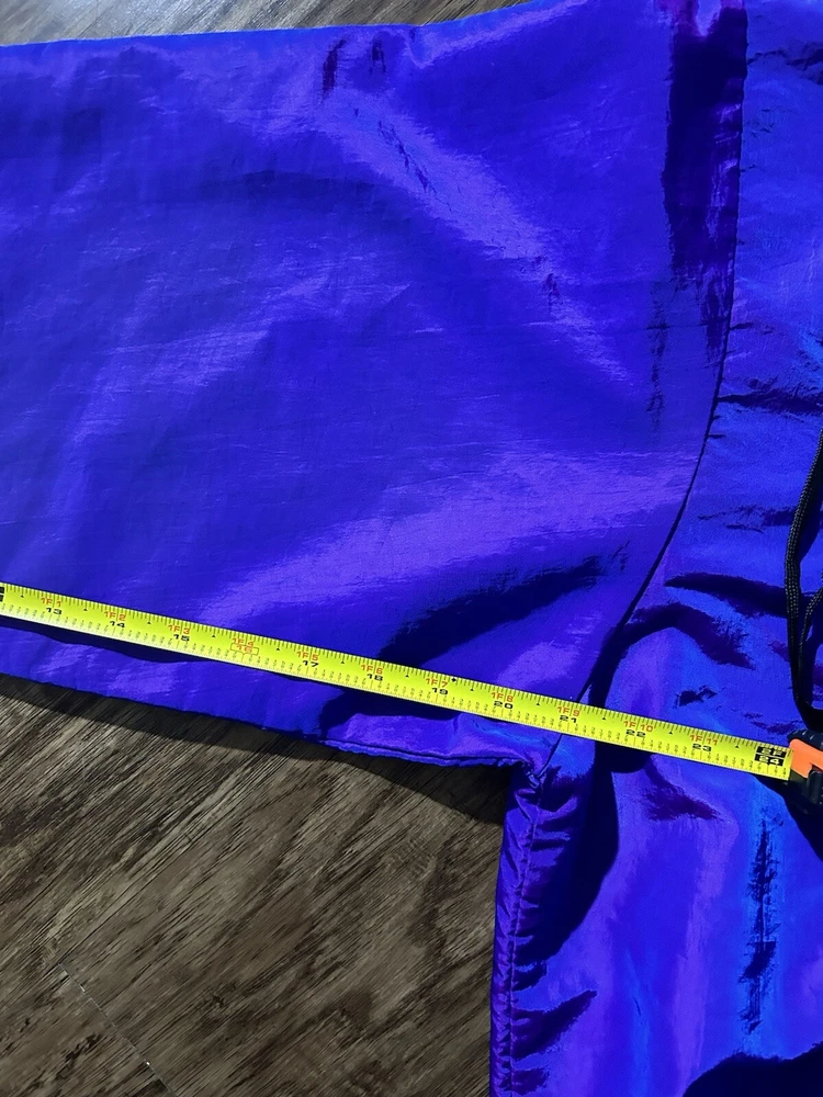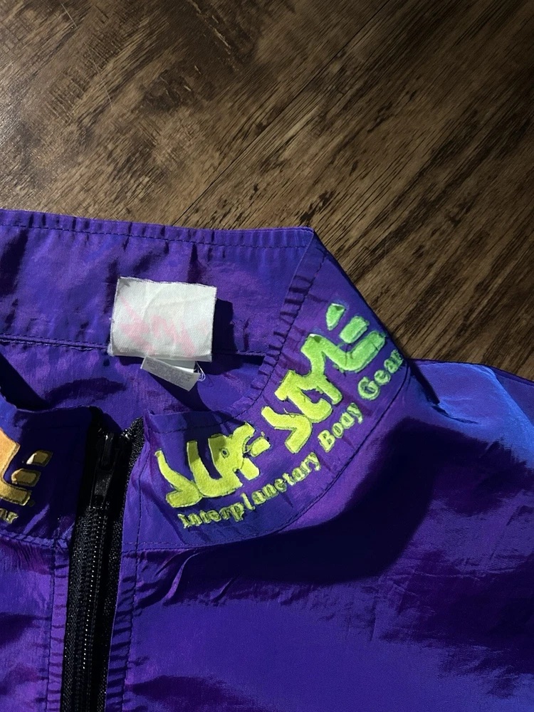 This vintage Surf Style windbreaker jacket features an iridescent purple color with a half-zip closure and a mid-length design. Made of nylon with a softshell fabric type, it has a retro 90s theme and reflective accents. The jacket is oversized and has an elastic waist for a comfortable fit, making it suitable for all seasons. With water-resistant and wind-resistant properties, it is ideal for travel, casual wear, walking, running, and jogging activities. Add a touch of nostalgia to your wardrobe with this limited edition piece from Surf Style.