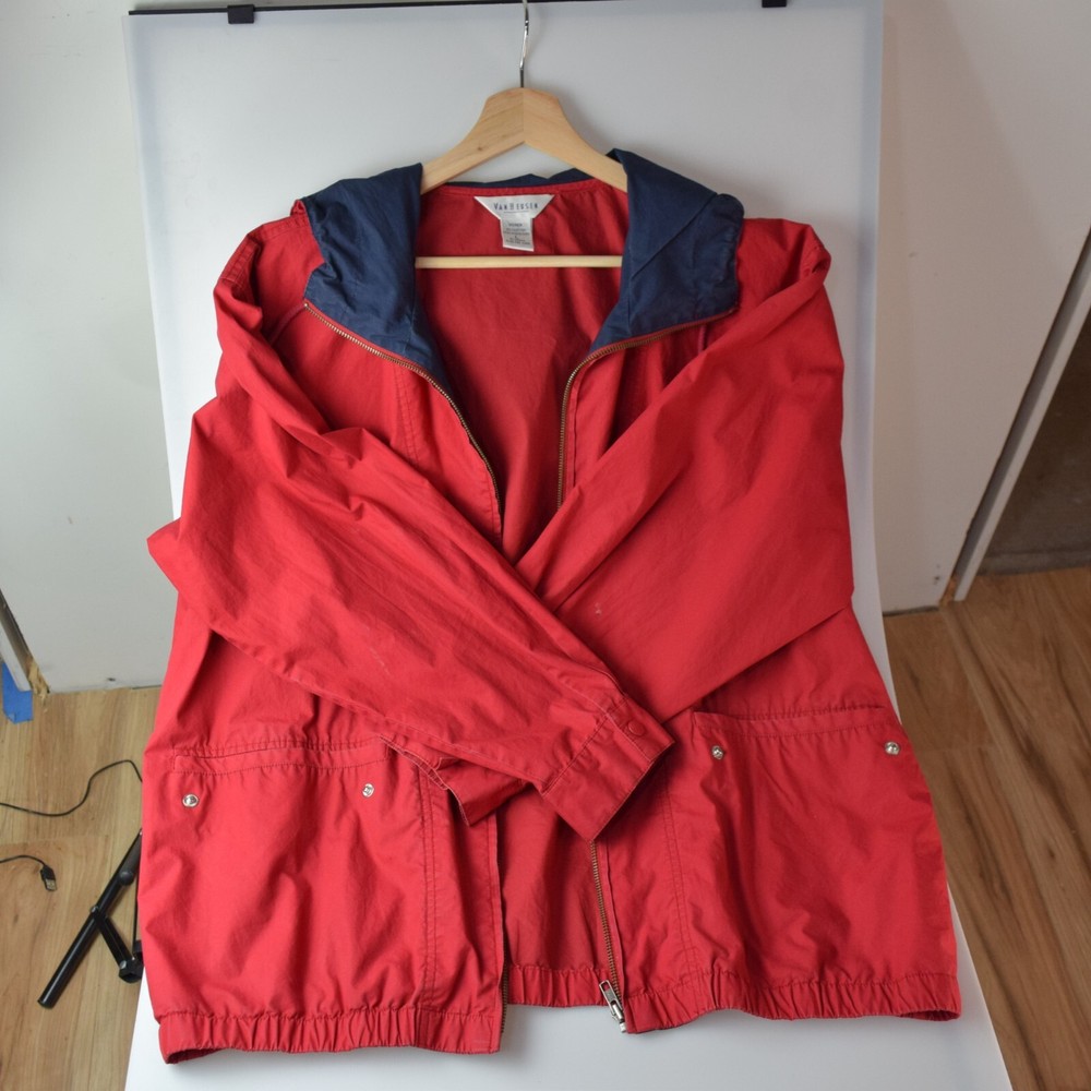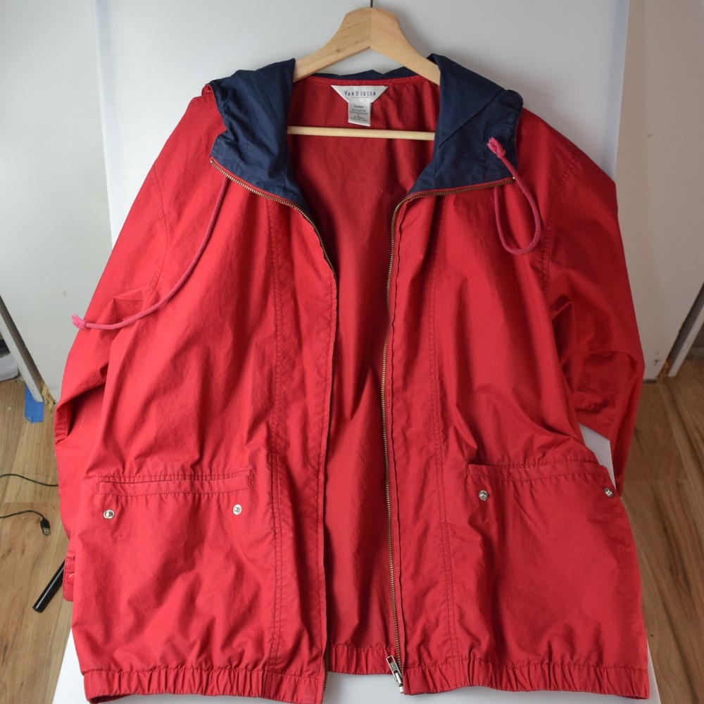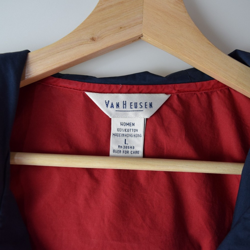 This vintage Van Heusen jacket/windbreaker in red features a blue collar and is designed for both men and women in size M. Made of polyester with synthetic insulation, it offers water-resistant and wind-resistant properties, making it suitable for all seasons. The jacket is styled with a retro 80s and 90s vibe, ideal for those who appreciate classic and hip-hop fashion influences. It includes features like a collared neckline, full zip closure, pockets for storage, and a soft shell lining for added comfort. Perfect for adding a touch of sports-inspired flair to your outfit. -TLDR: Very high quality, has an old and retro feel to it, tag says for women but it's honestly a unisex piece.