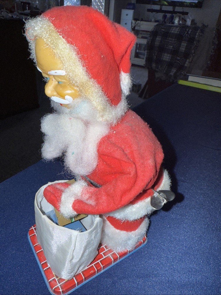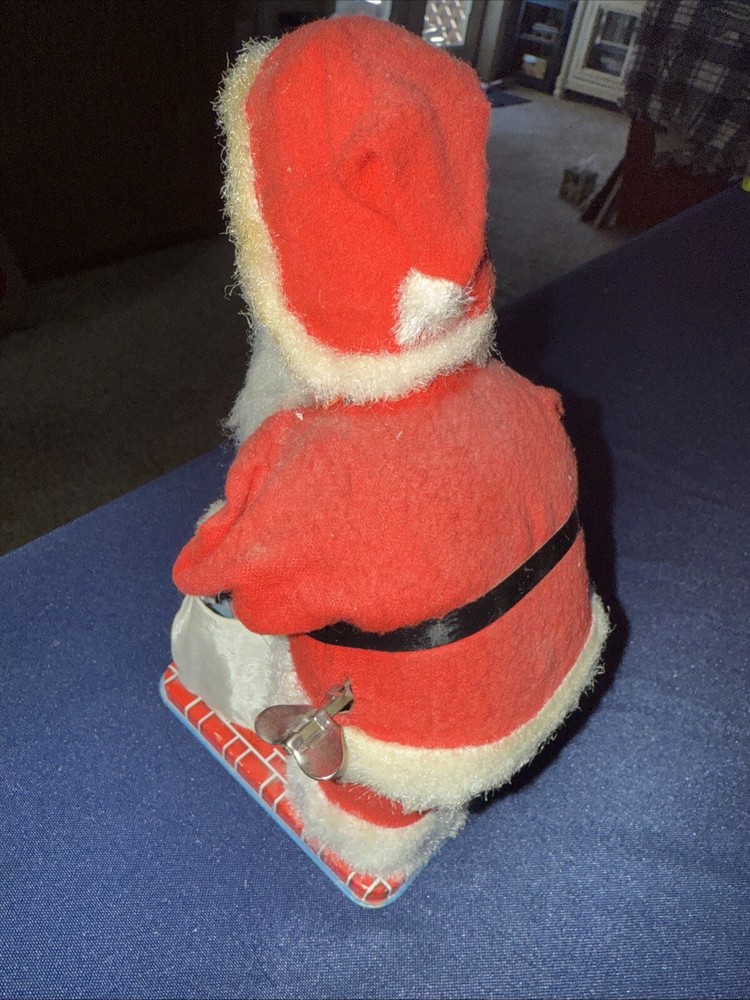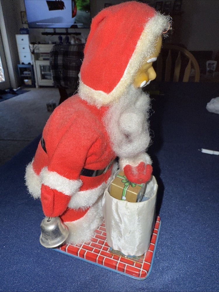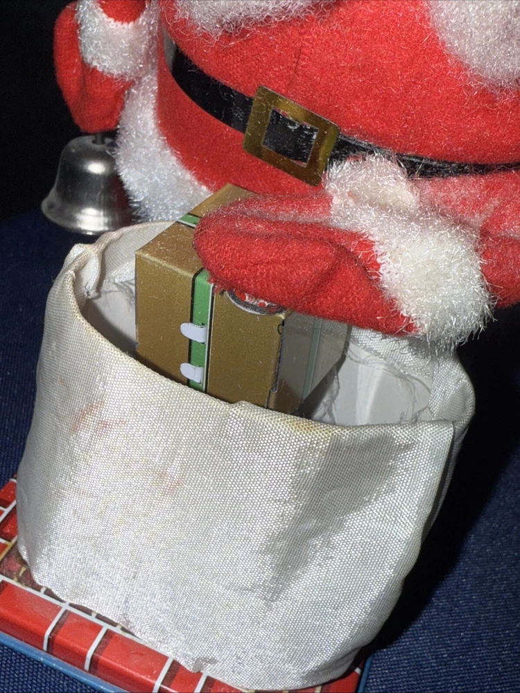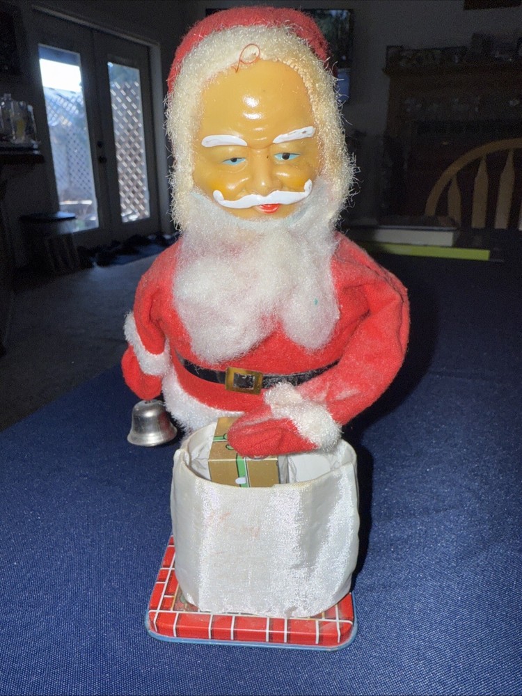 This wind up Santa is in working condition. He rings his bell. He leans forward and picks up the magnetic gift with his hand. He does not pick it up very far. I’m not sure if that is the way it was made or if he needs some repair. He is about 8 1/2 inches tall. His beard is falling off some. Please look at the photos carefully as they are part of the description. I do not cancel bids or auctions so please make sure you want the item before bidding or buying. Thank you for looking and good luck bidding!