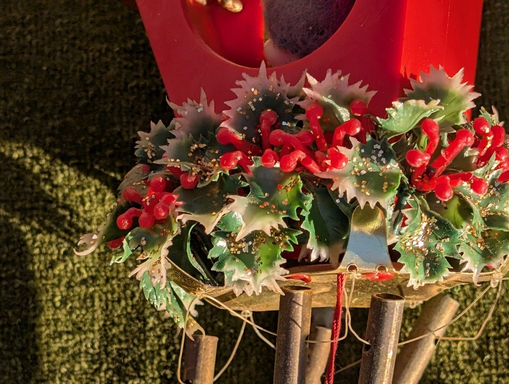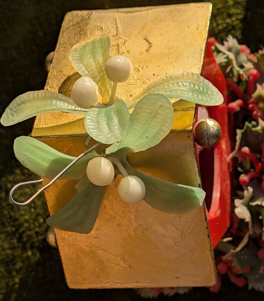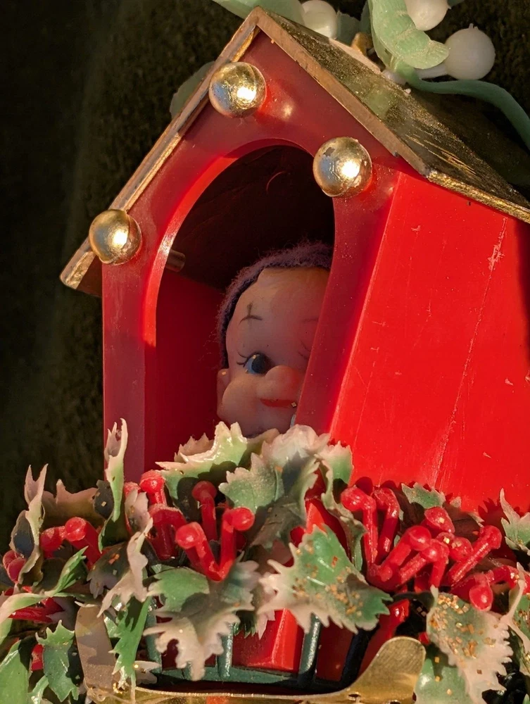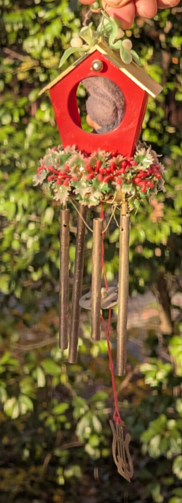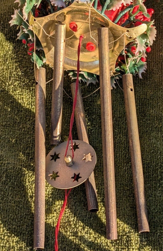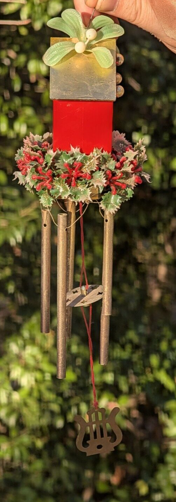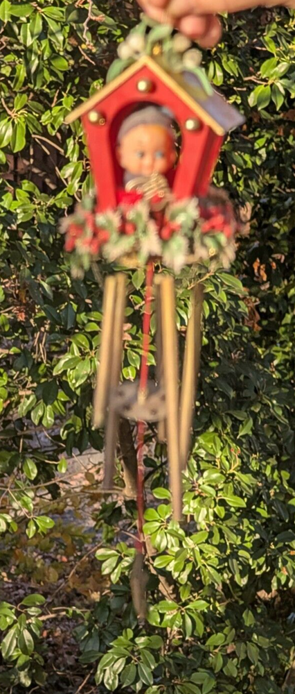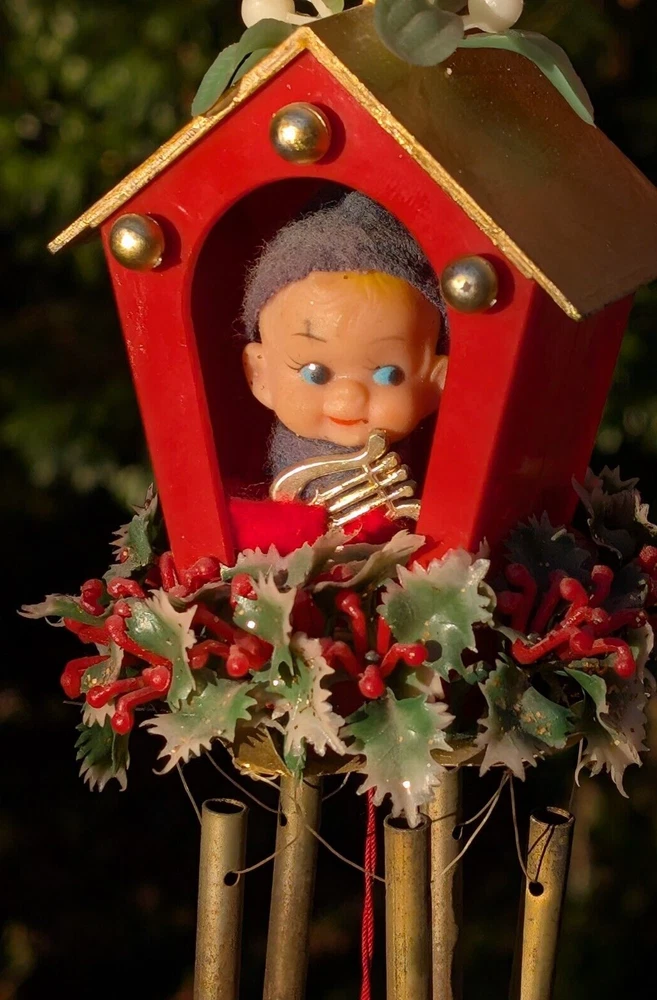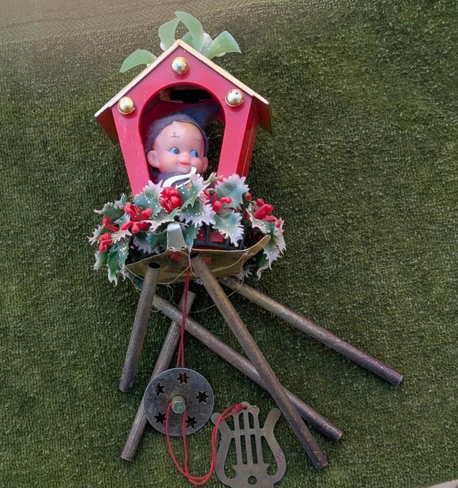 VTG 1963 CHRISTMAS PIXIE ELF SENTRY WIND CHIMES HARP HOLLY MISTLETOE HONG KONG Very nice condition for the age. The brass wind chimes have a lovely tone. Please see all photos and ask if in doubt. Passed down in the family, this has been in storage for a long time...probably the reason it is in such good condition. Stored in a pet and smoke free home Dimensions: ~14" from top of roof when hanging...will be longer depending upon what hanger you use....the old hanger on it will be included. Thanks for stopping by! BINF