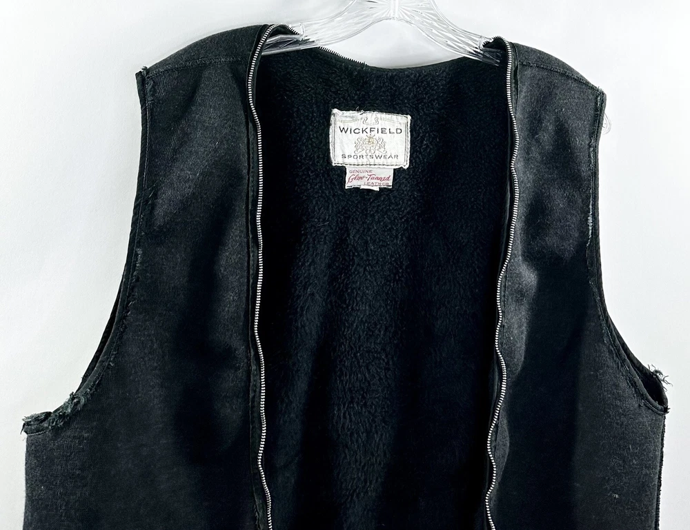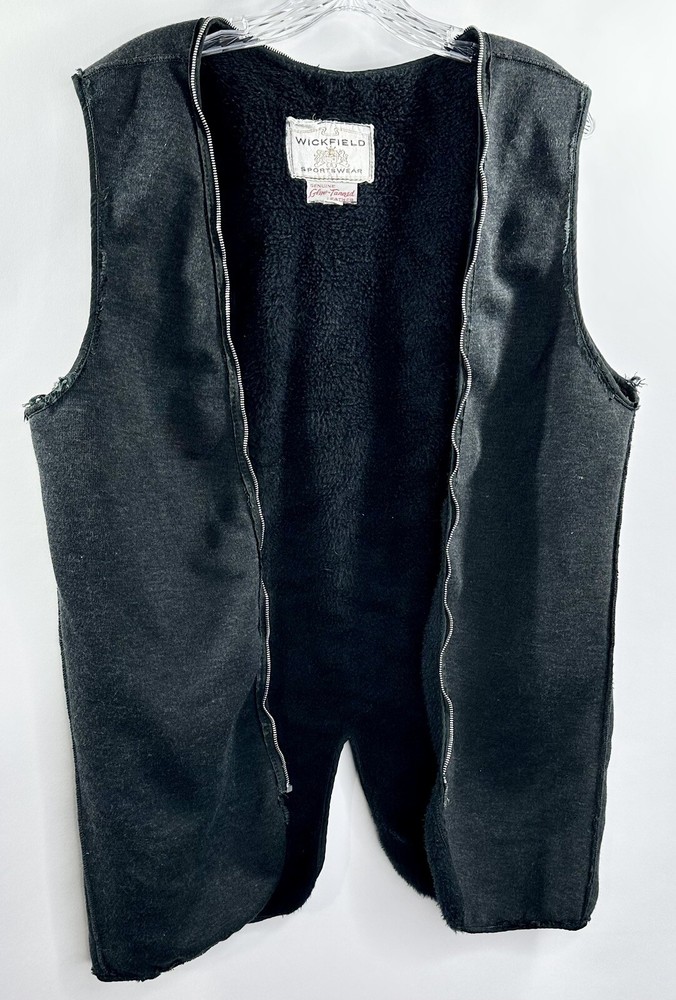 VTG 80s Mens Wickfield Sportswear Motorcycle Riding Jacket Vest Zip Liner Sz 40 (M). In very good gently worn condition. Soft fuzzy lined inner jacket vest. Solid black color sleeveless vest with full zip around for inside jacket. Adds extra layer of comfort and warmth for riding. Wickfield Sportswear men’s size 40. Fits like a medium. Made in USA. Measures 30” long.