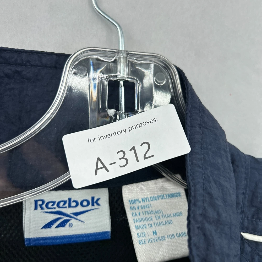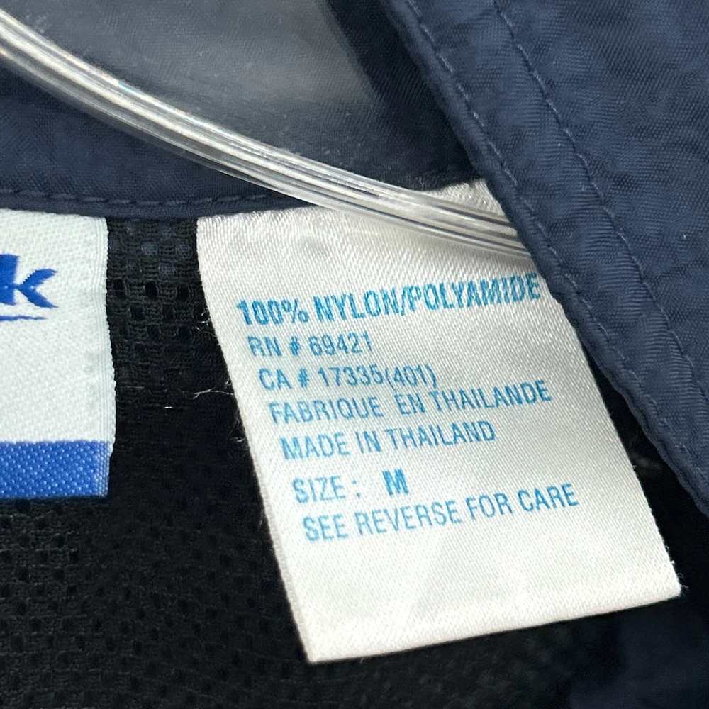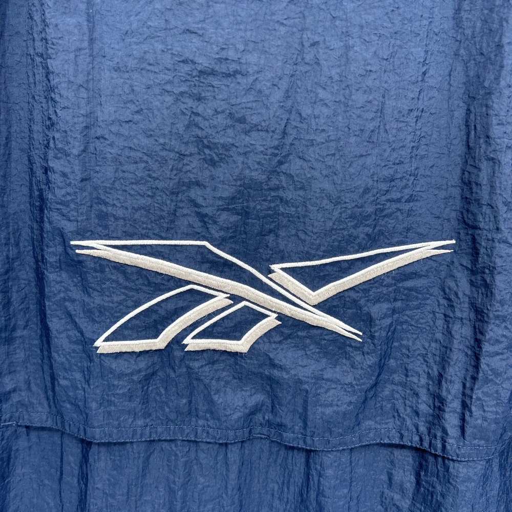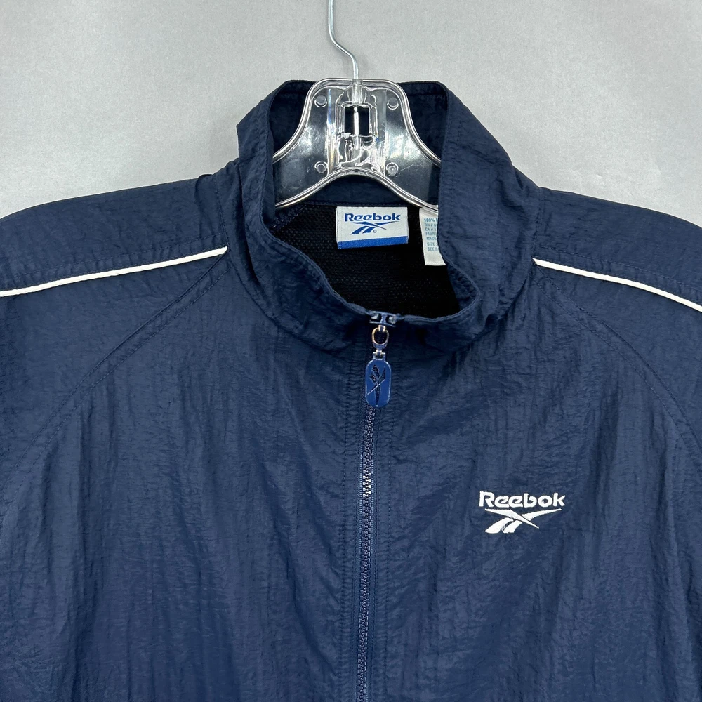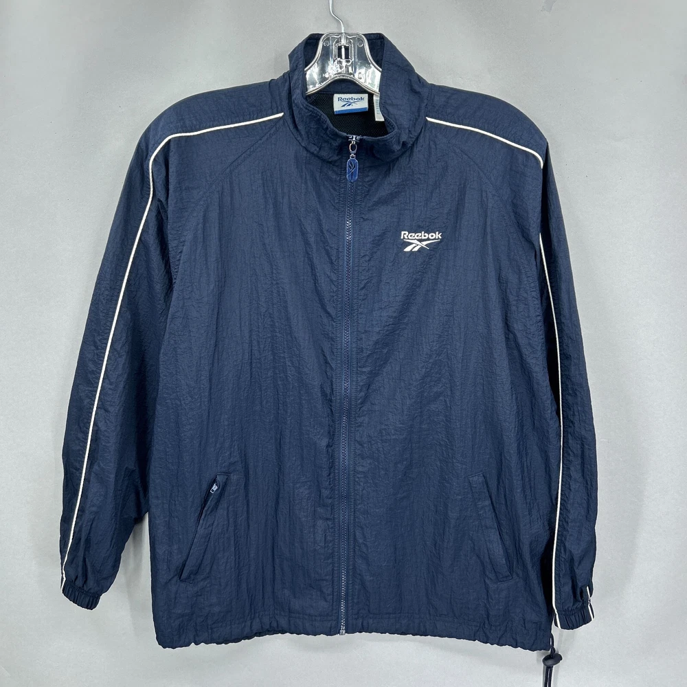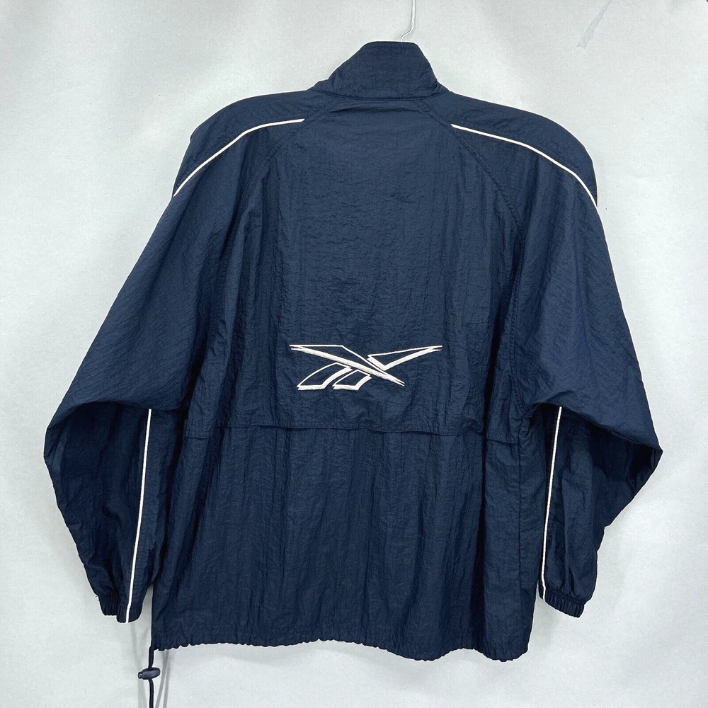VTG 90s Reebok Jacket Mens Medium Navy Blue Windbreaker Zip Embroidered Big Logo Great vintage condition with no rips, tears, holes, or snags!!! Light wear/fading throughout. Please compare our measurements shown in the pictures to your favorite garments to ensure fit. Please note, item measurements are approximate. Previous washings may change the sizing. We offer 60 day free returns - no questions asked. Items ship next business day! THANK YOU SO MUCH!!!