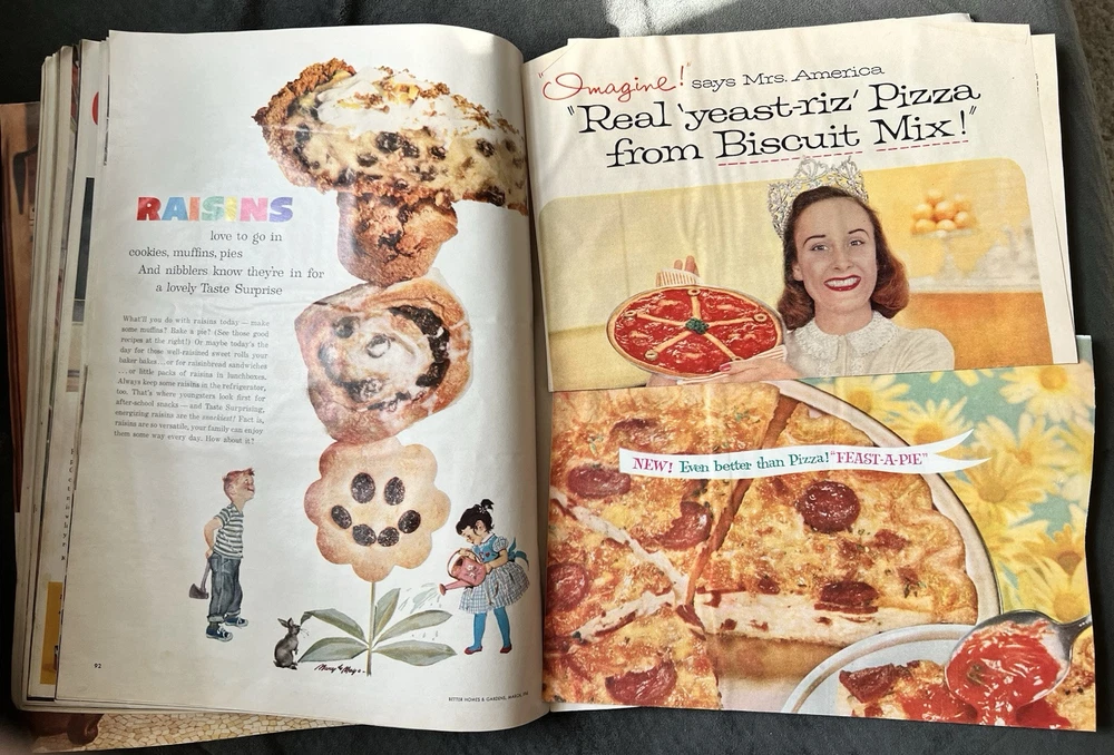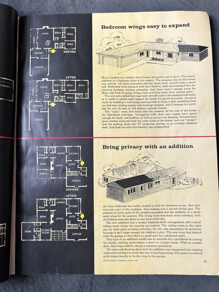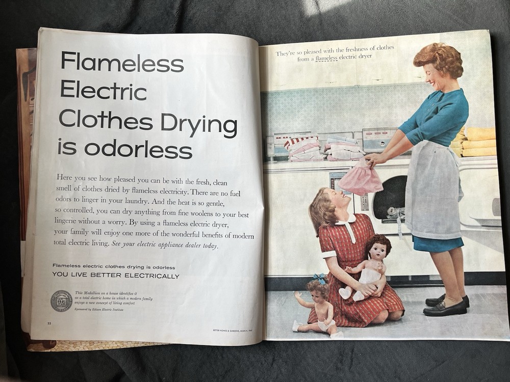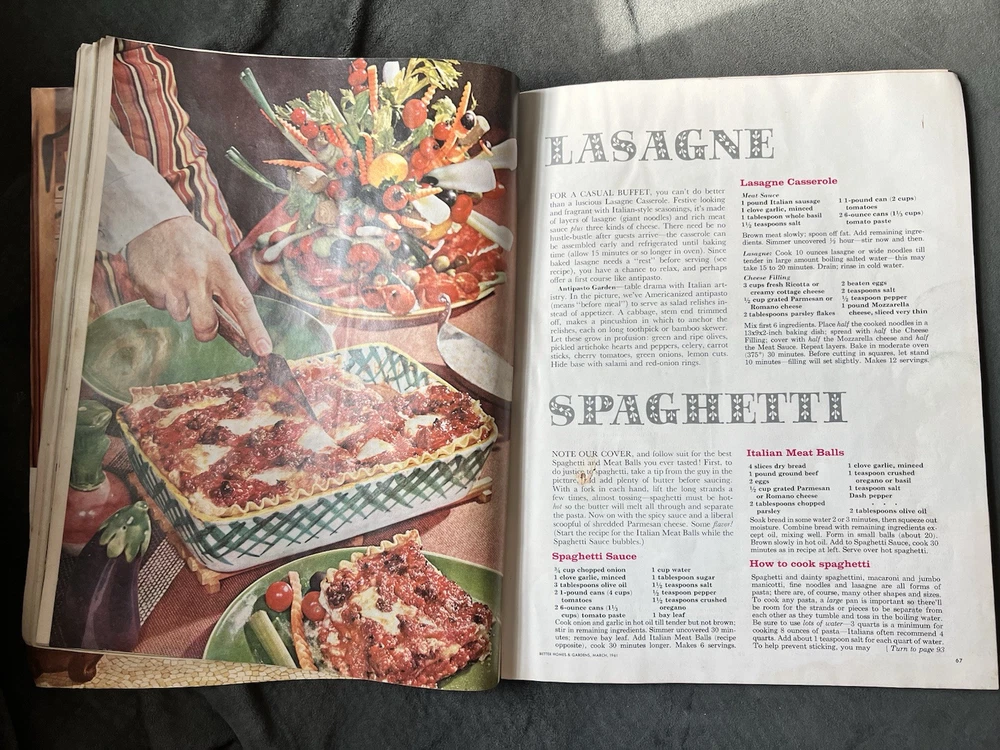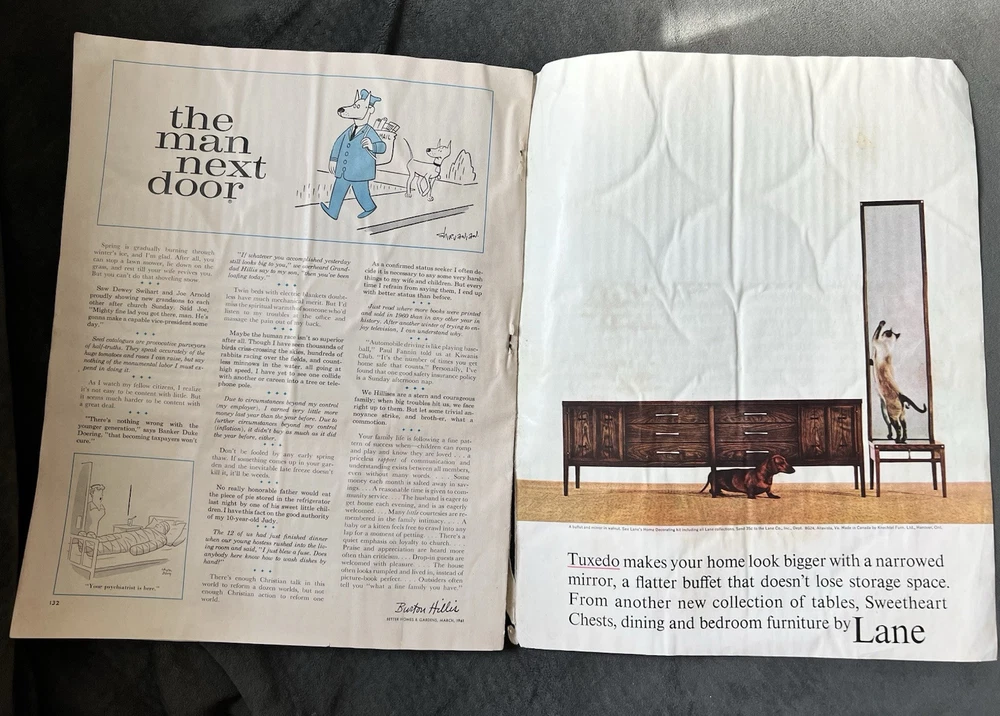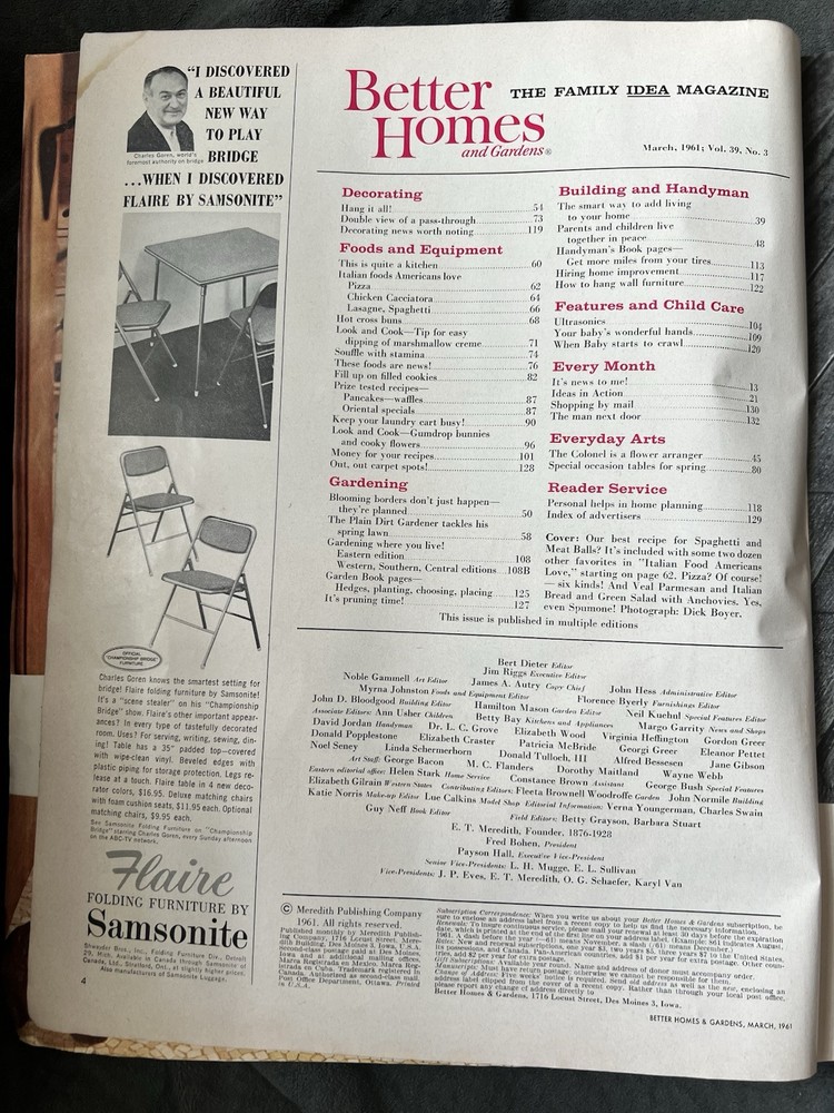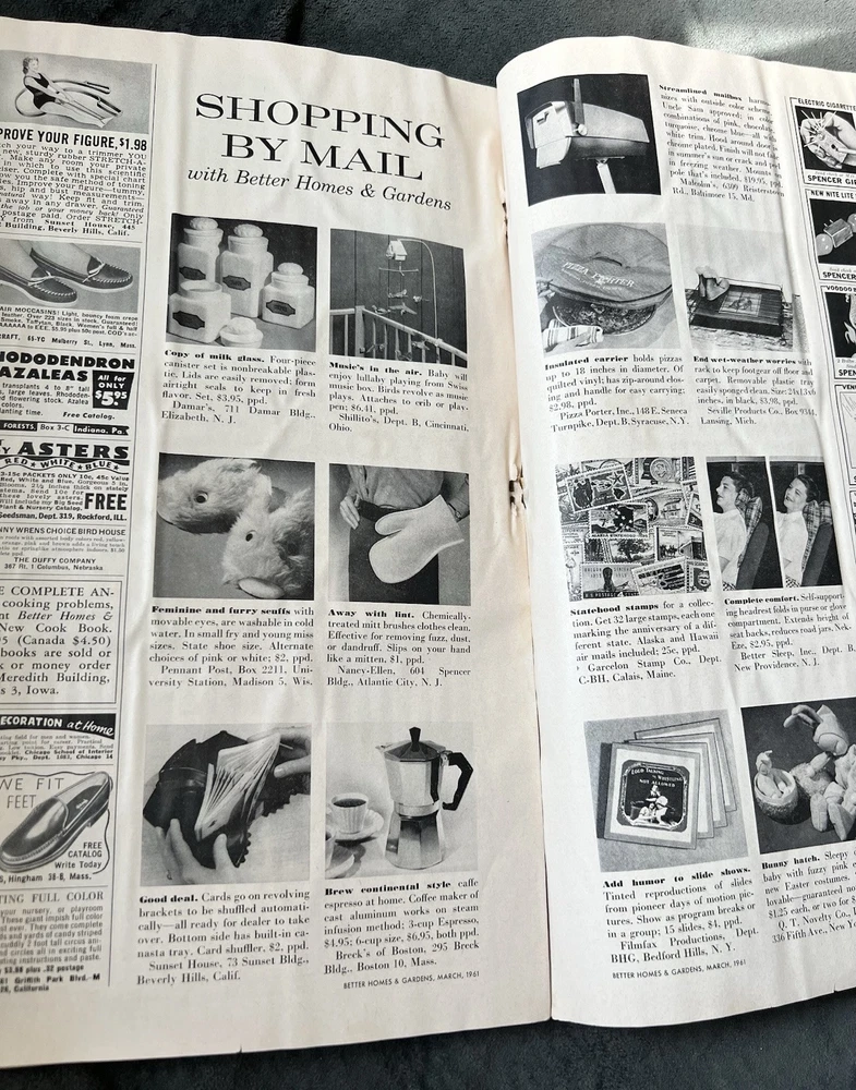 Better Homes and Gardens Magazine March 1961 Has some wear. Cover is in very good condition for age. Side is a little torn and back has some water damage/wrinkles. Binding is torn at the bottom but fully held together. Approximately the back half has some wrinkled pages seemingly from being wet. Has some spots/stains inside but is fully legible. Also has two pages from different magazines tucked inside that I will leave. Fully legible.