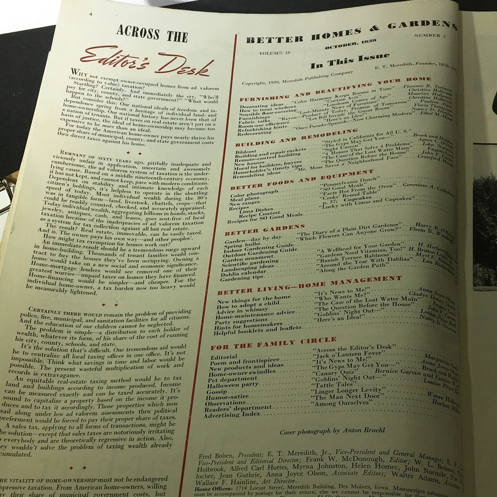 VTG Better Homes & Gardens October 1939 Fall Furnishing and Color Schemes Good and used. Edges may have very minor wear. There may be minor marks and/or rips. Overall in good shape. Address label on front. Comes with plastic, protective covering.
