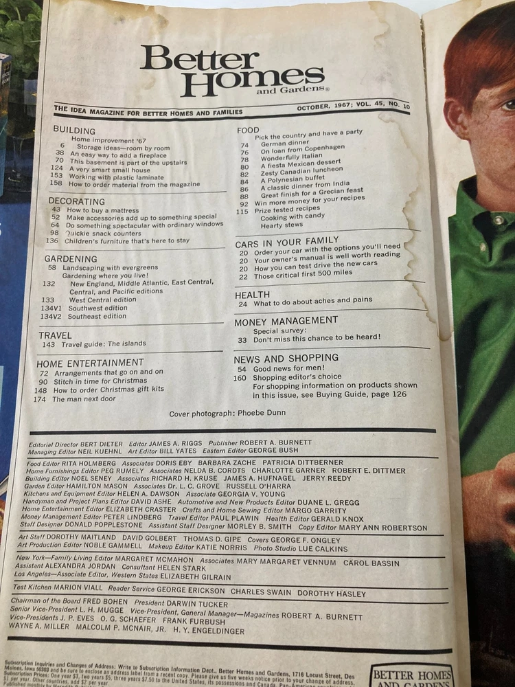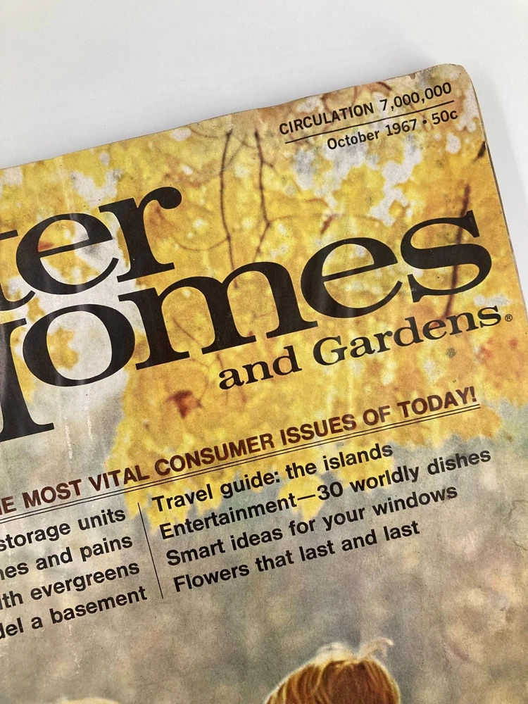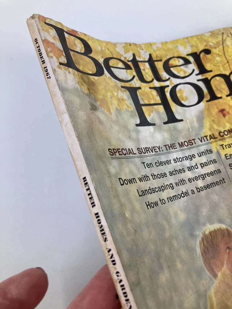 VTG Better Homes and Gardens Magazine October 1967 Landscaping with Evergreens Acceptable condition Has address label on front. Magazine has wear. See photos. Comes with plastic protective covering. Some marks. See photos. Wear on binding. See photos. Creases on front corner(s). See photos. Water damage. See photos.