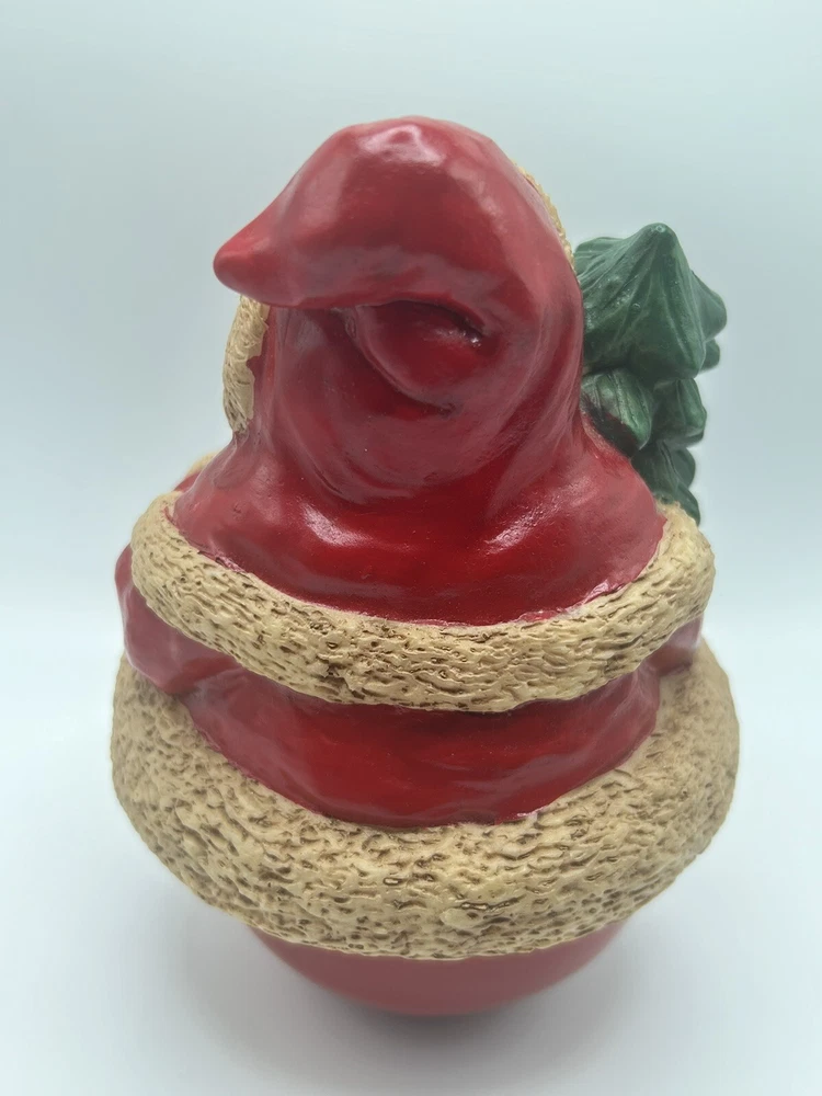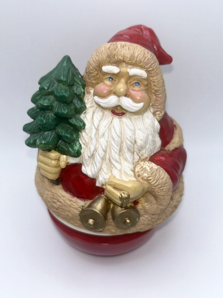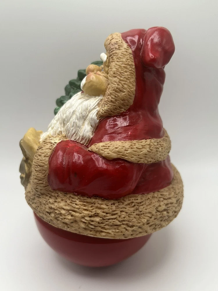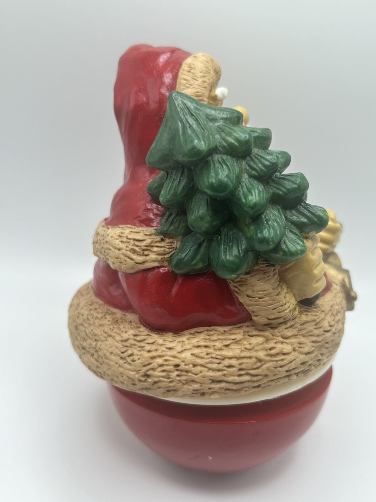 This vintage Christmas musical figurine features Santa Claus coming to town, accompanied by a wind-up Weeble Santa. The red and white design is perfect for the holiday season and will make a great addition to any collection. The mixed materials and musical features make it a unique and charming piece. Whether you're a collector or just looking for a festive decoration, this Santa Claus figurine is sure to bring joy to your home. Its classic design and timeless theme make it a perfect gift for any occasion. Add it to your collection today and enjoy the magic of Christmas music box.