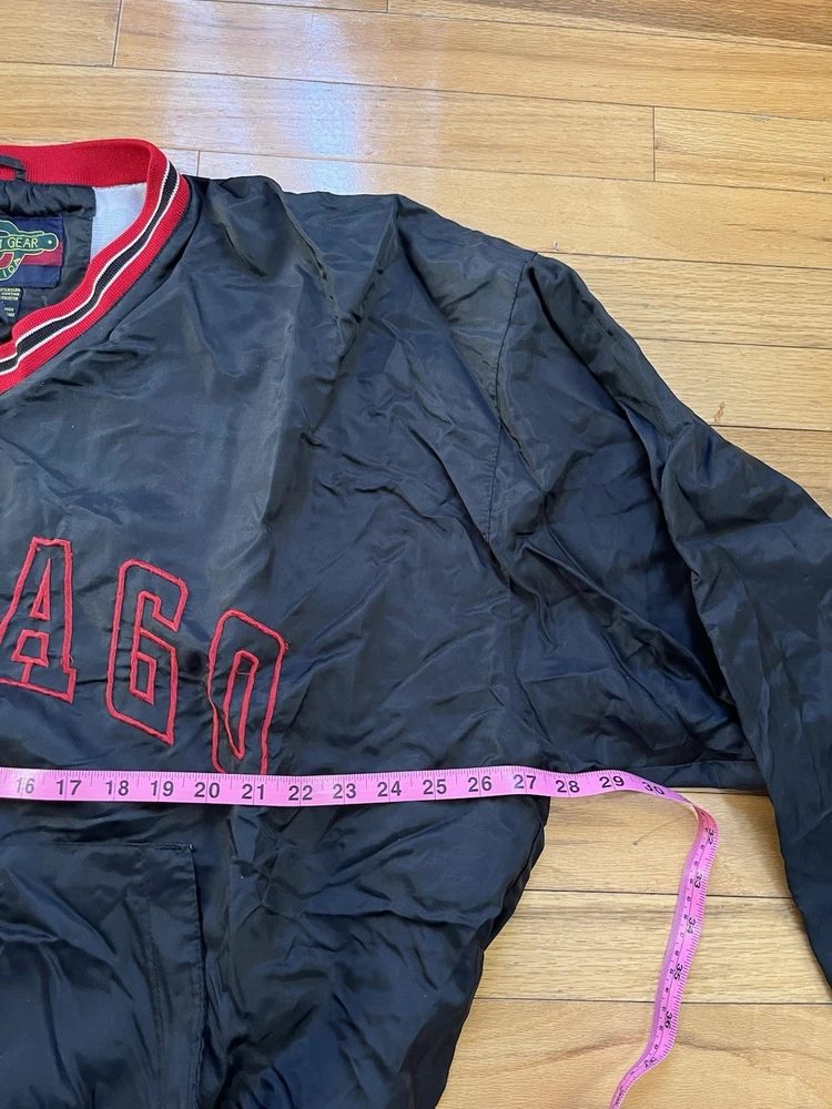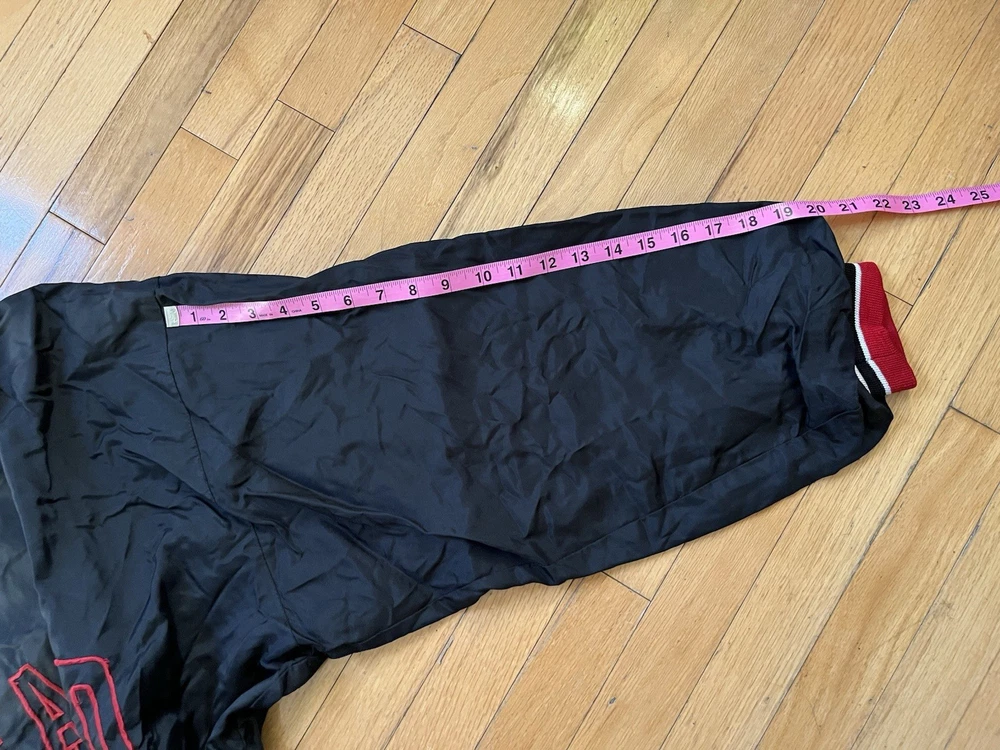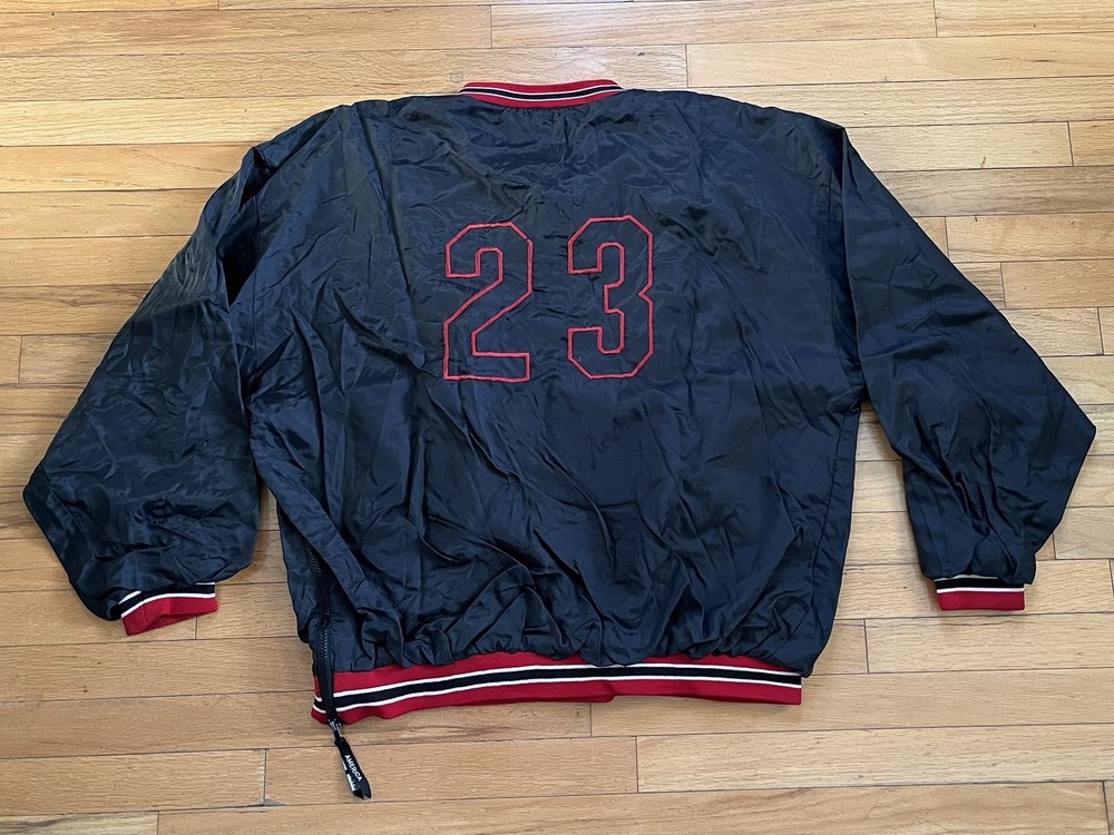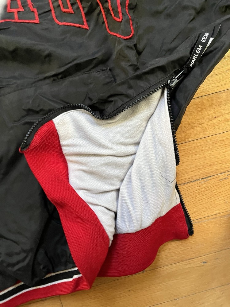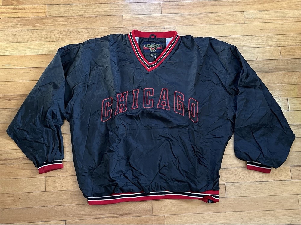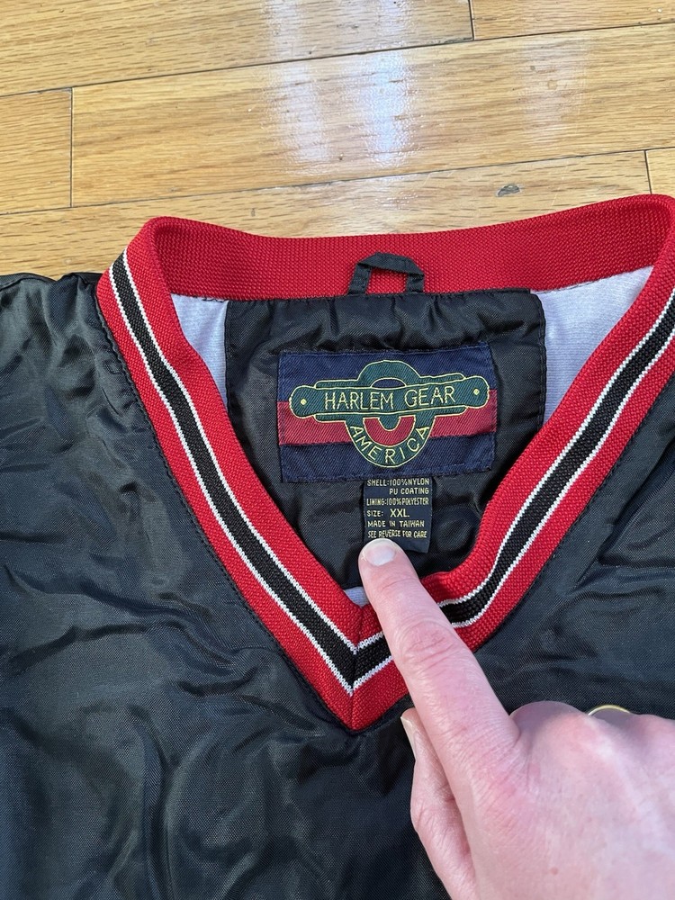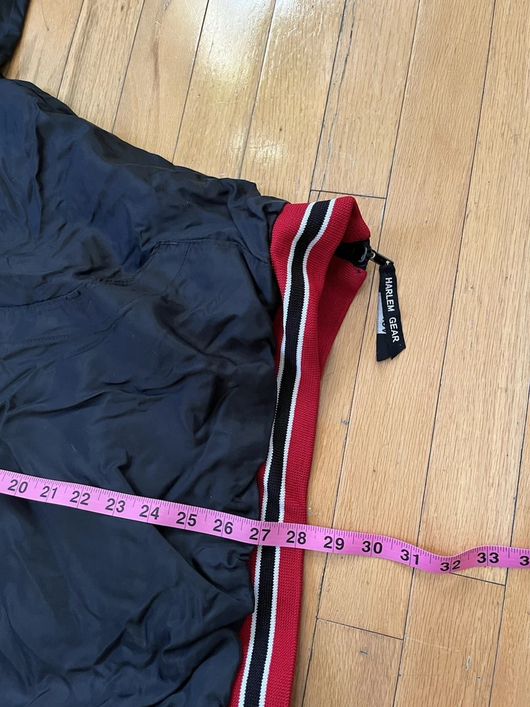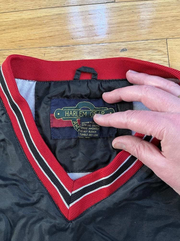 Rare Nineties Harlem Gear streetwear pull over wind breaker. Chicago Bulls black and red colorway with Chicago spellout stitched on the front and Michael Jordan’s #23 embroidered on the back. Fully lined. Excellent condition. Approx. measurements: Chest: 27.5” Length: 28” Sleeve: 22”