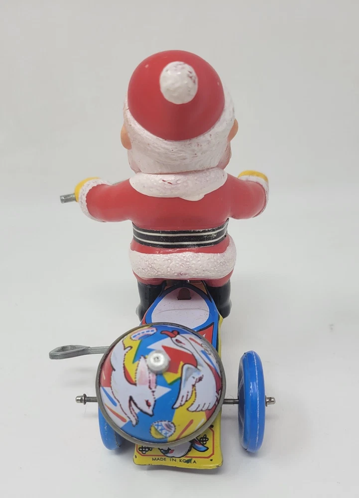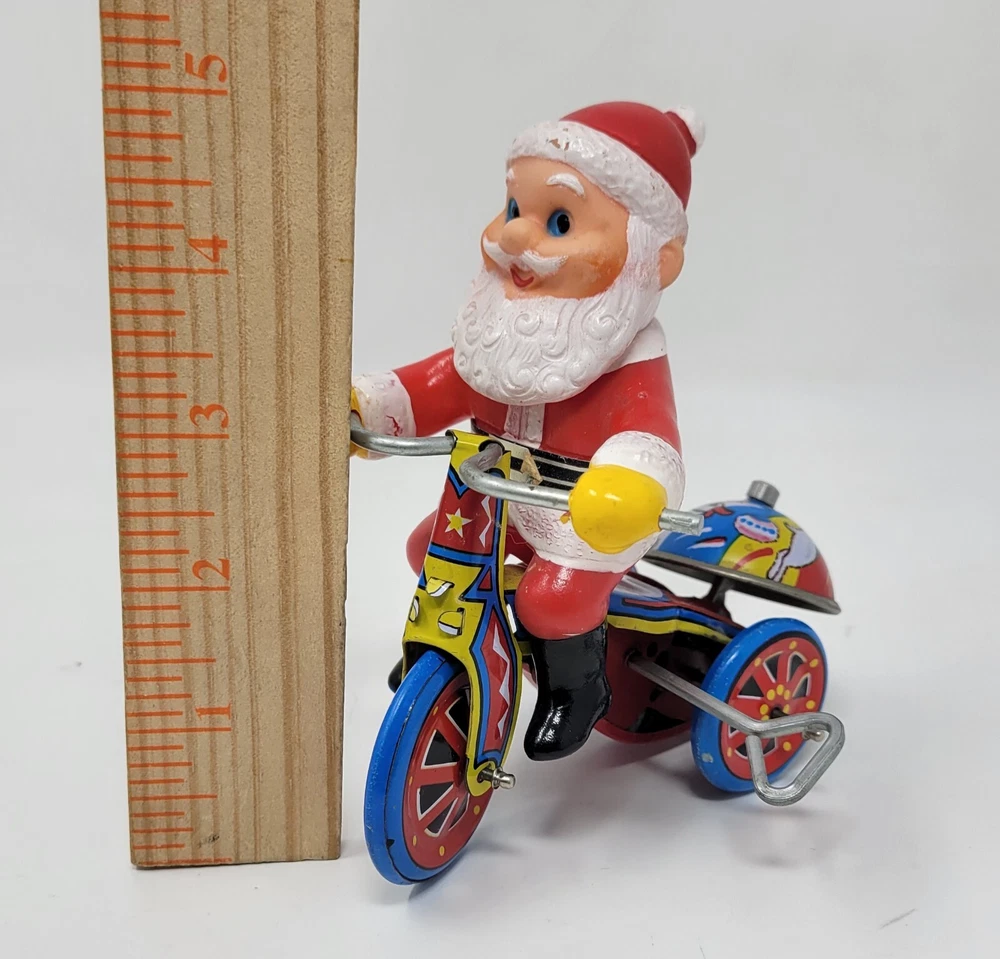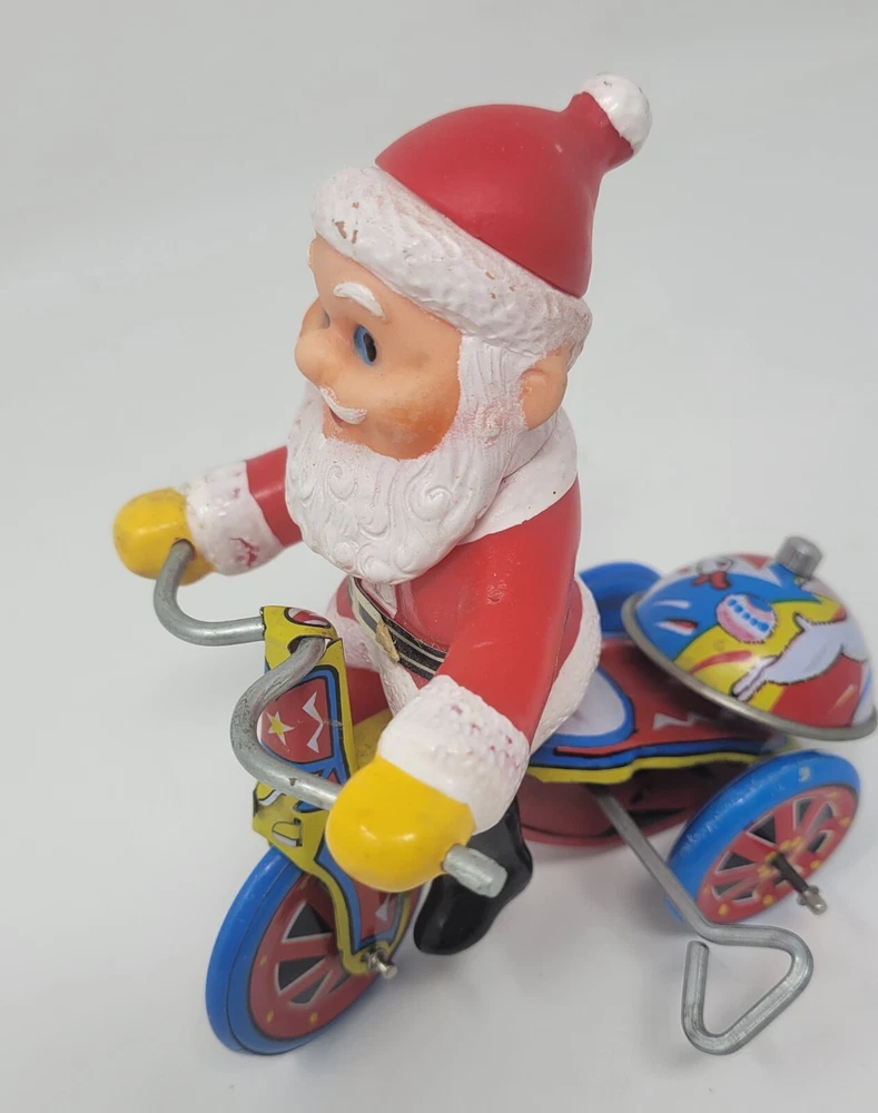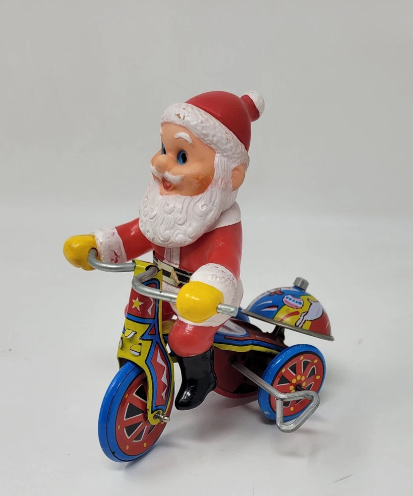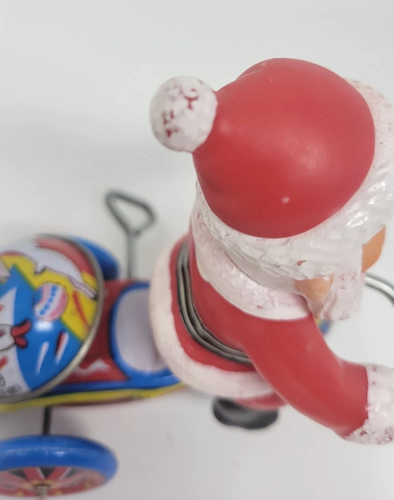 Wind up santa. Does wind up, however, the toy rolls around in a circle about a foot or so in diameter. The handle bar was bent at some point. I did not try to bend back into place. This is a good display but if you wanted to roll straight this is for repair. Shows scratches scuffs etc. Weighs 3.4 oz. Will ship this USPS ground advantage Thanks