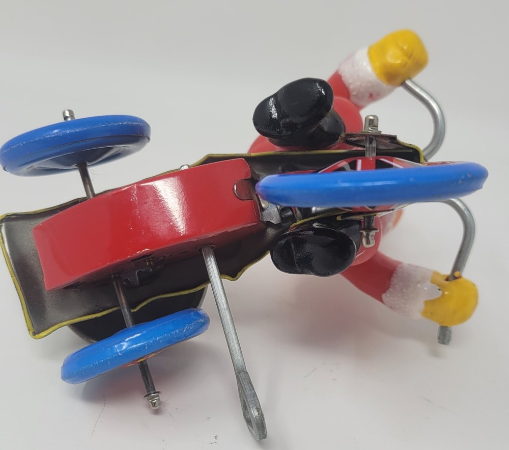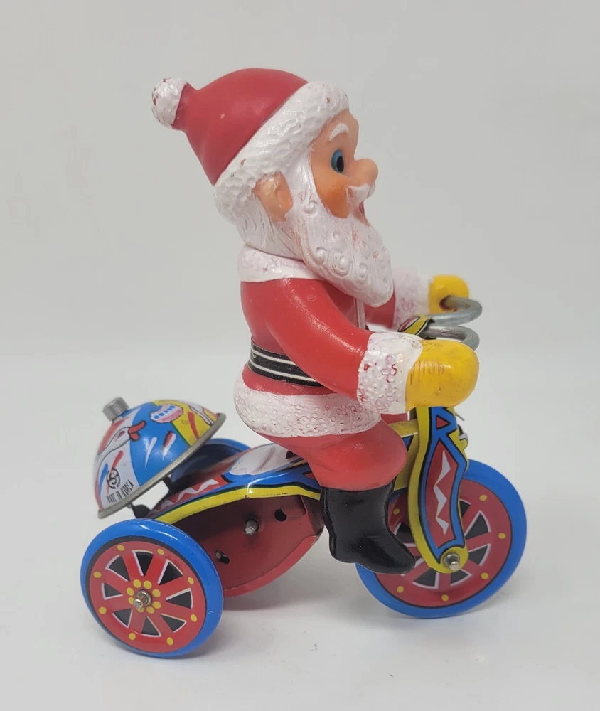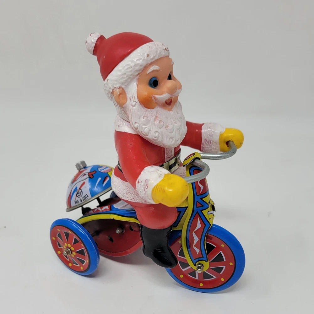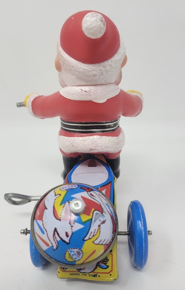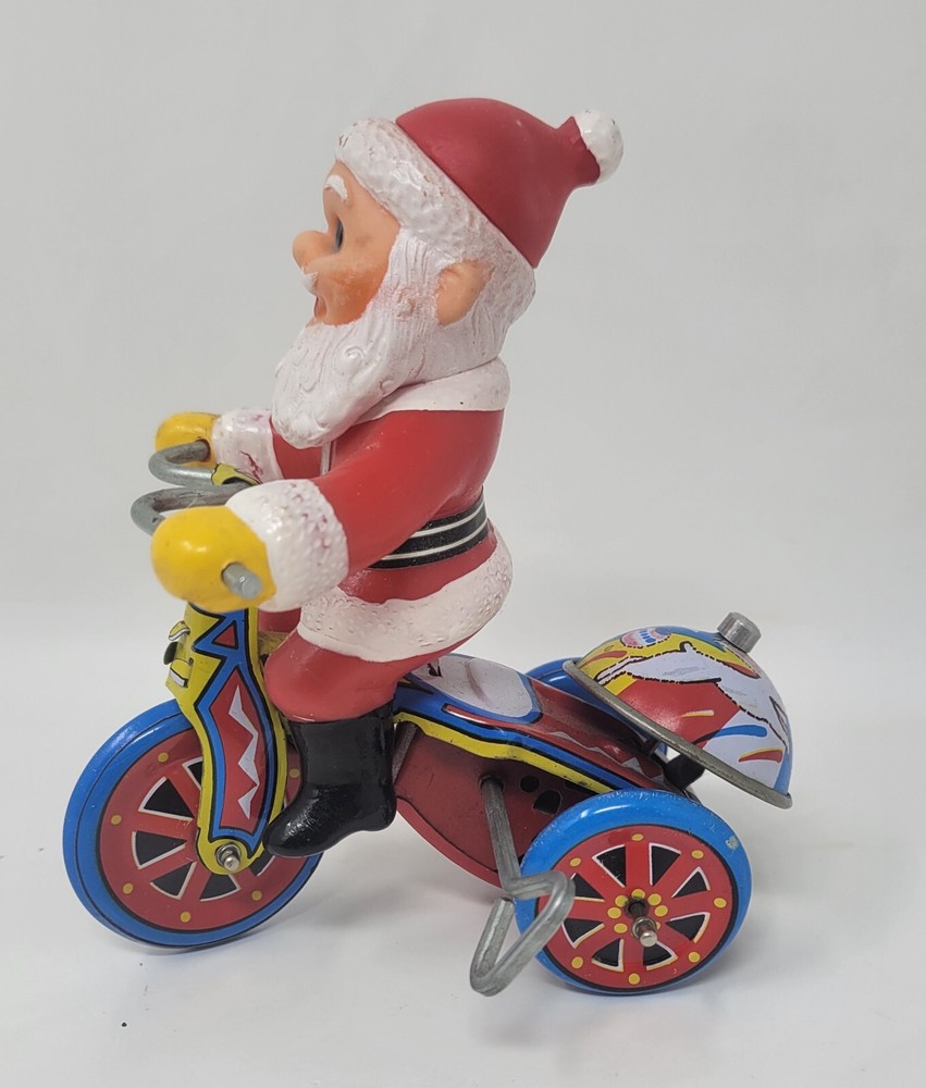Wind up santa. Does wind up, however, the toy rolls around in a circle about a foot or so in diameter. The handle bar was bent at some point. I did not try to bend back into place. This is a good display but if you wanted to roll straight this is for repair. Shows scratches scuffs etc. Weighs 3.4 oz. Will ship this USPS ground advantage Thanks