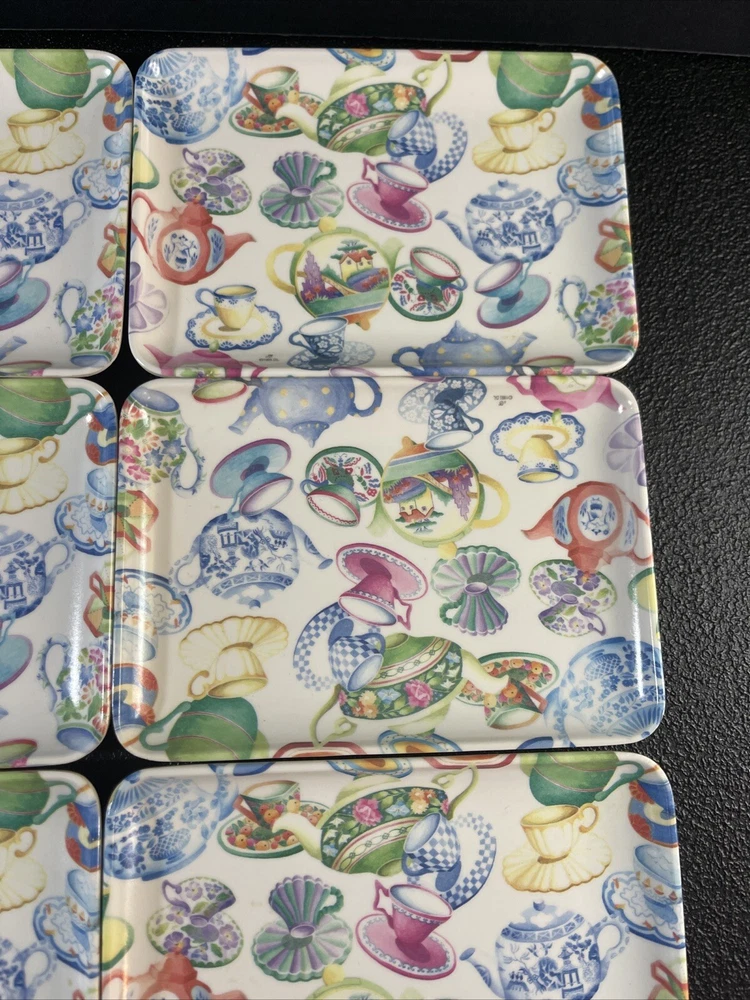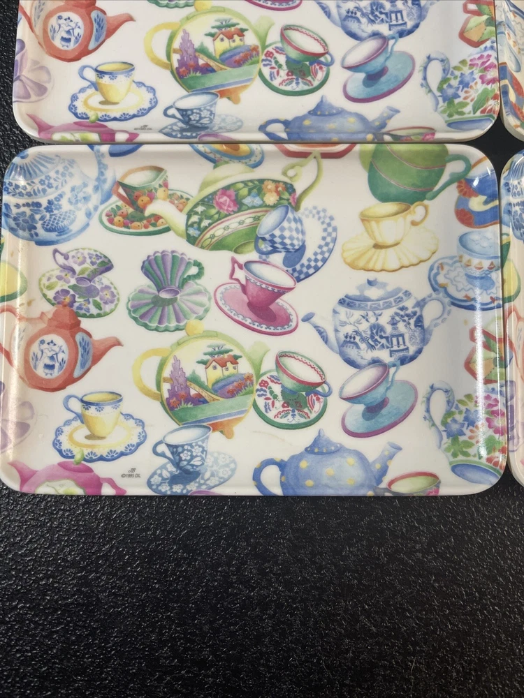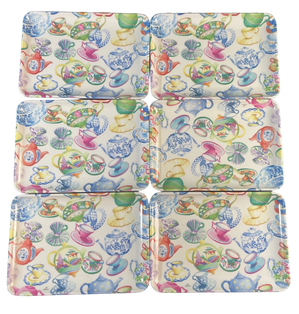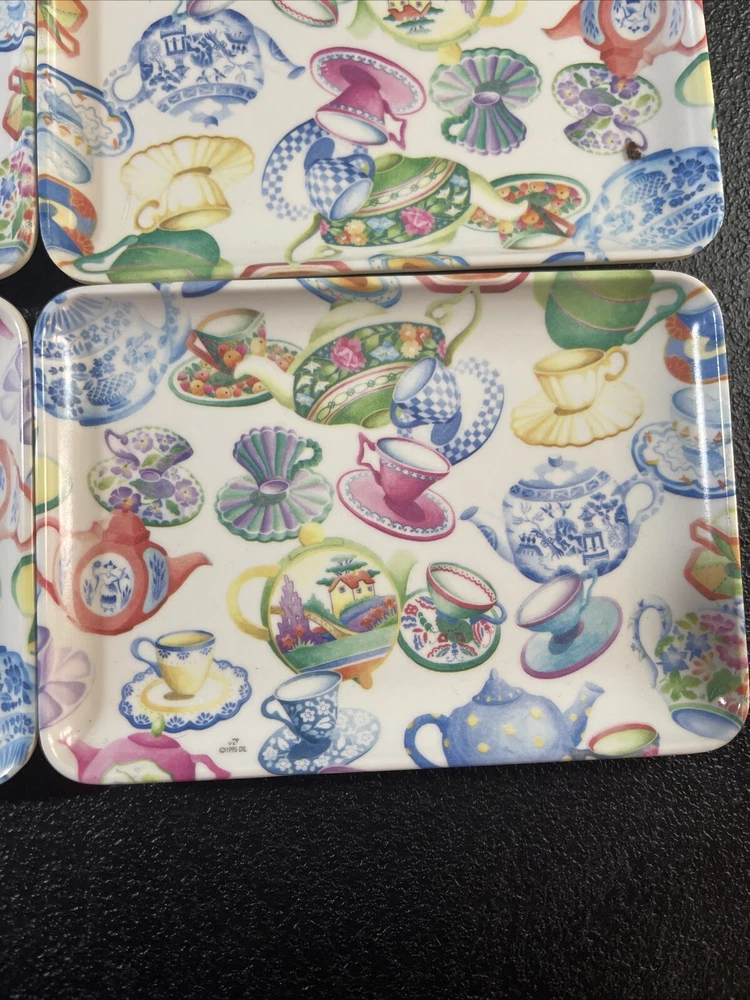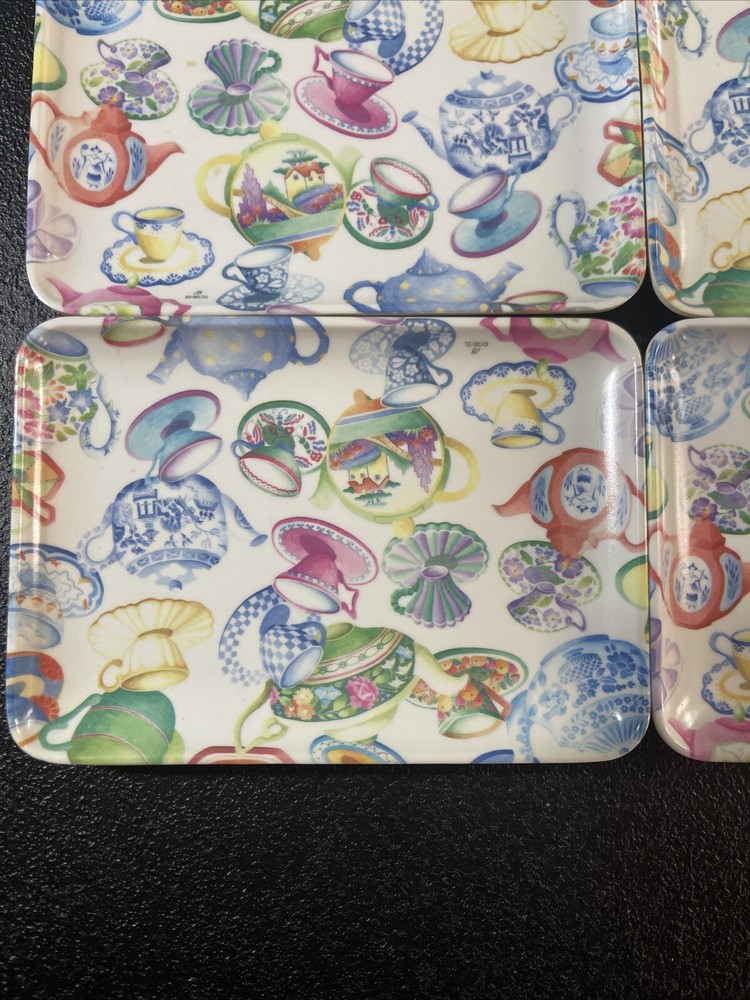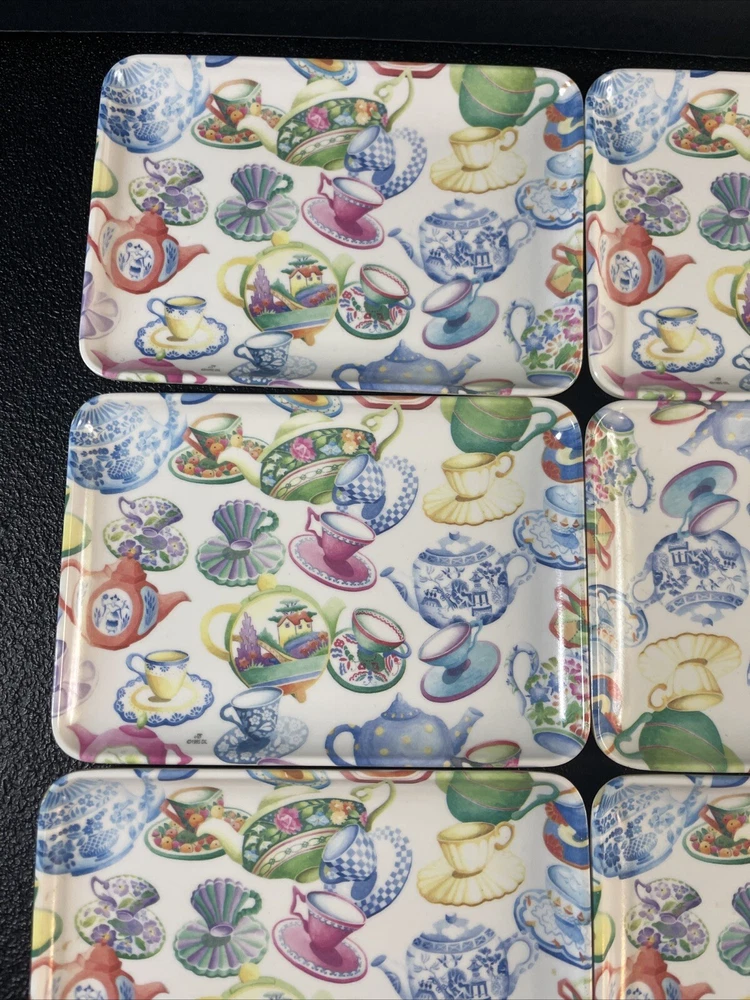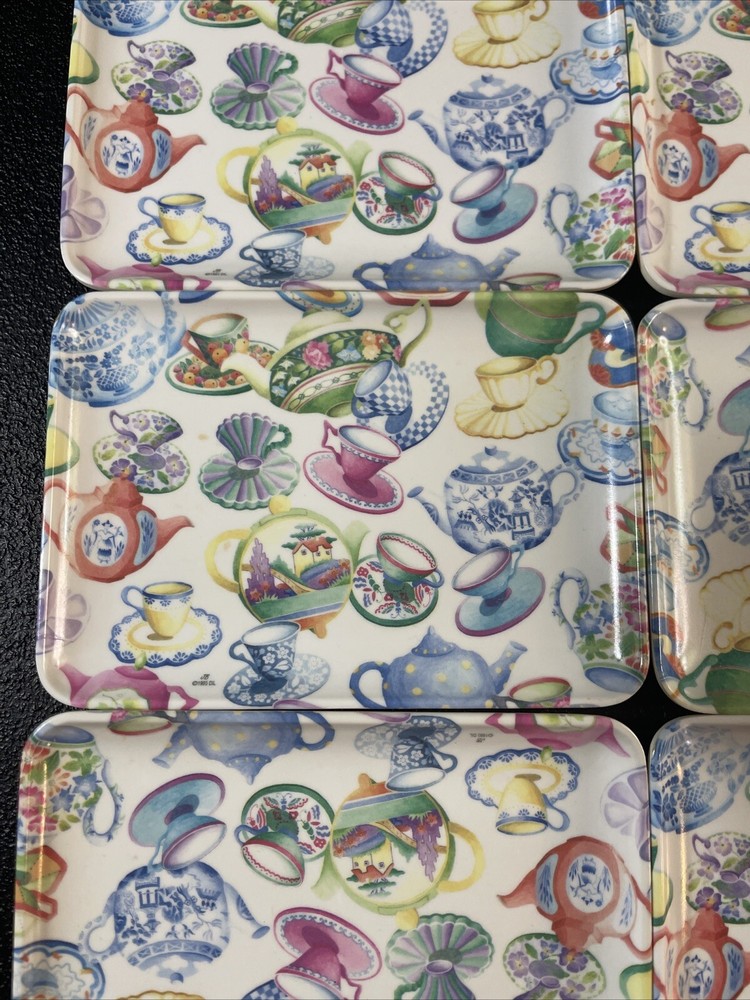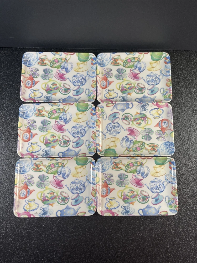 This vintage-inspired tea time set from Design Imports, Limited Italy is the perfect addition to your dining collection. The set includes six small melamine trays, each measuring 6 inches in long and 4 inches in width. The colorful multicolor tea time pattern adds a touch of whimsy to any occasion, making it suitable for all occasions. The set features a rectangular shape and is perfect for serving tea or other small beverages. The trays are made in Italy and are of high quality, ensuring that they will last for years to come. The set is perfect for collectors of vintage-inspired items or those who are looking to add a touch of elegance to their home. These in great pre-owed condition these are VTG from what I read on other listings these came from an estate sale and very cute plates for serving appetizers are teatime sandwiches . I also seen they carry a larger tray you could buy and have the whole set!!