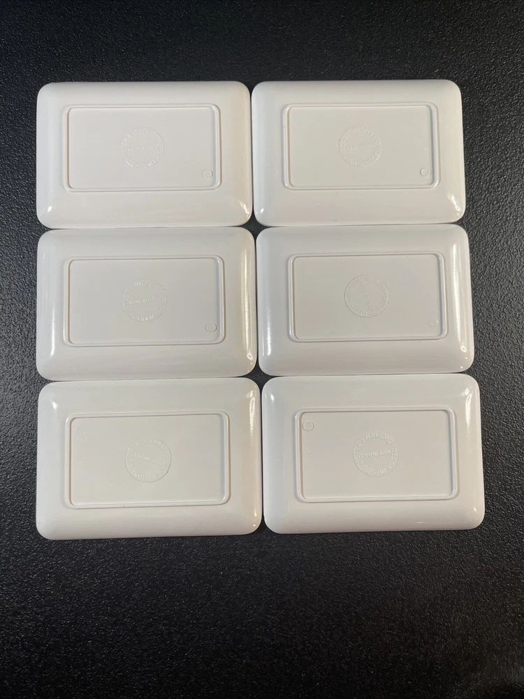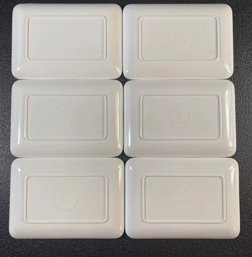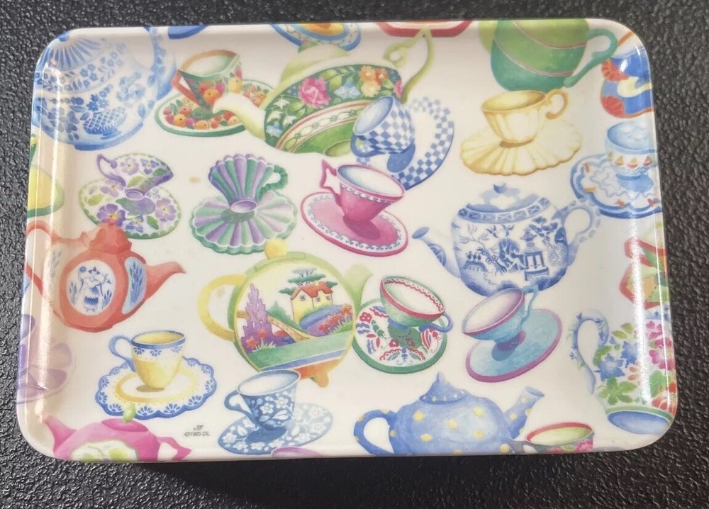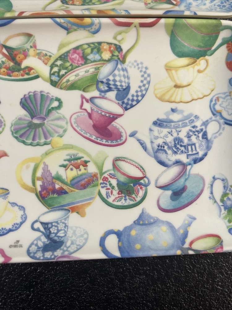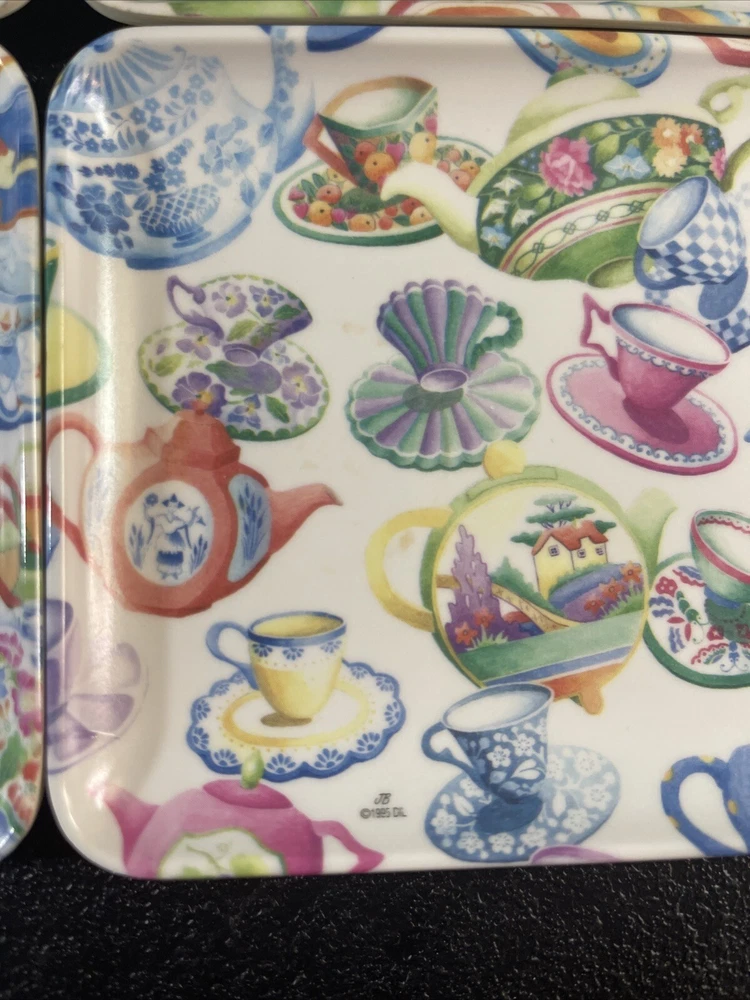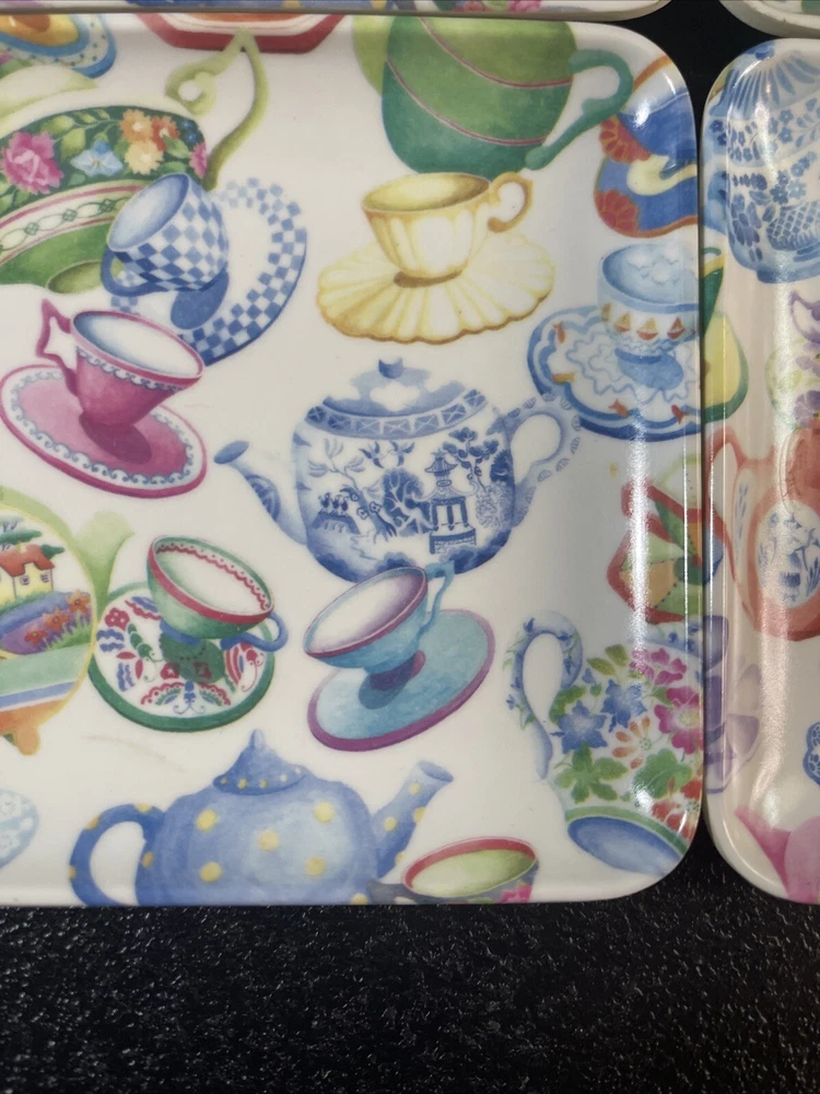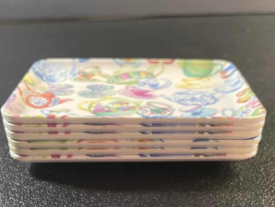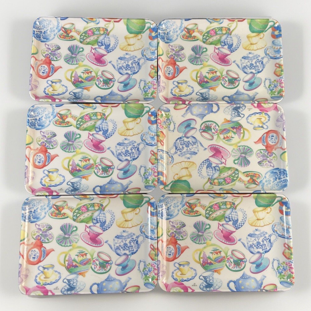 This vintage-inspired tea time set from Design Imports, Limited Italy is the perfect addition to your dining collection. The set includes six small melamine trays, each measuring 6 inches in long and 4 inches in width. The colorful multicolor tea time pattern adds a touch of whimsy to any occasion, making it suitable for all occasions. The set features a rectangular shape and is perfect for serving tea or other small beverages. The trays are made in Italy and are of high quality, ensuring that they will last for years to come. The set is perfect for collectors of vintage-inspired items or those who are looking to add a touch of elegance to their home. These in great pre-owed condition these are VTG from what I read on other listings these came from an estate sale and very cute plates for serving appetizers are teatime sandwiches . I also seen they carry a larger tray you could buy and have the whole set!!
