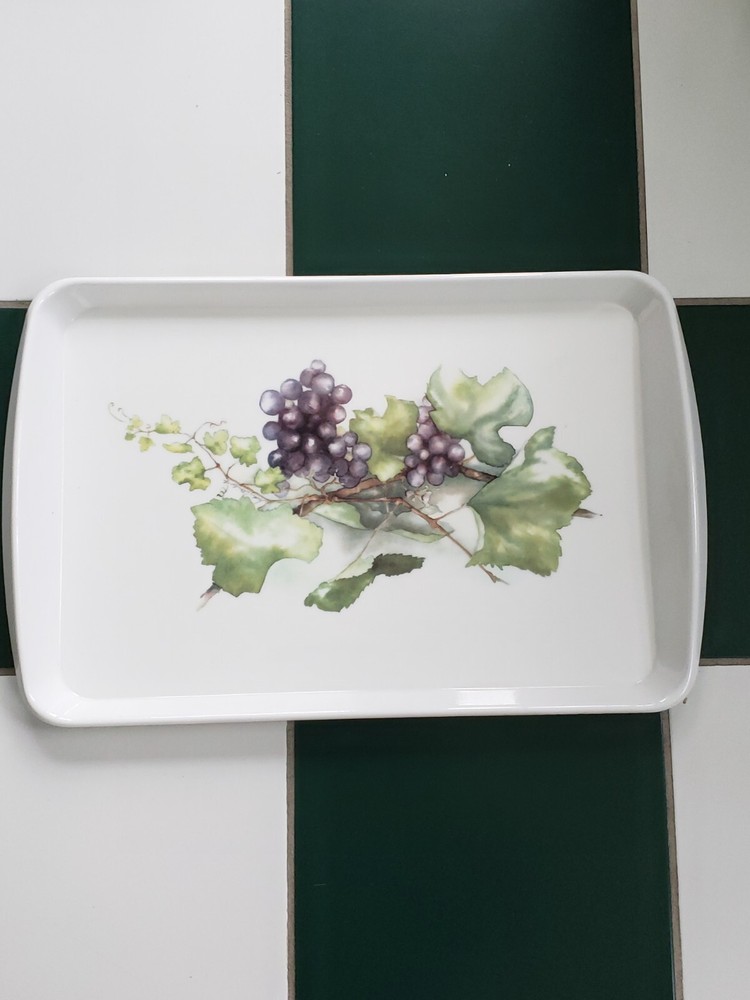 This vintage Design Imports LTD. serving tray, designed by Judy Lambert, features a beautiful white, purple, and green grape pattern on a rectangular 22-inch melamine surface. The glossy finish and sturdy material make it perfect for all occasions, whether for serving food or displaying decorative items. The tray is a true gem for collectors and admirers of vintage kitchenware, with its Italian craftsmanship and timeless design. It is a must-have for those who appreciate artistry and practicality in their home decor.