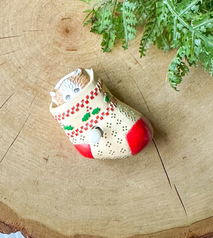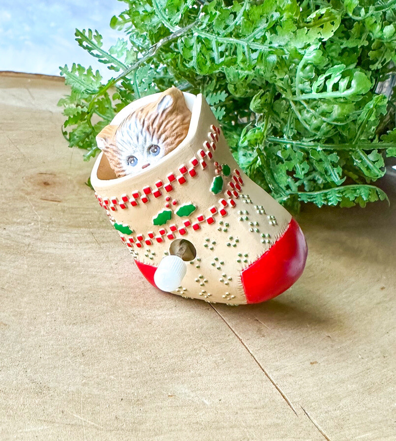 Adorable cat pin! Winds up & the cat pops in & out of the stocking Excellent condition Approx 2" tall