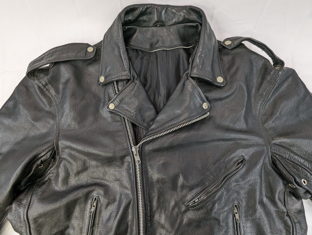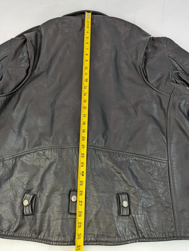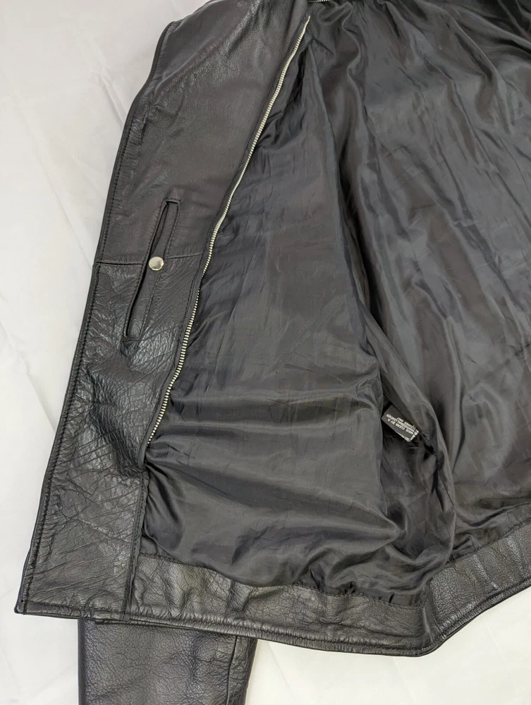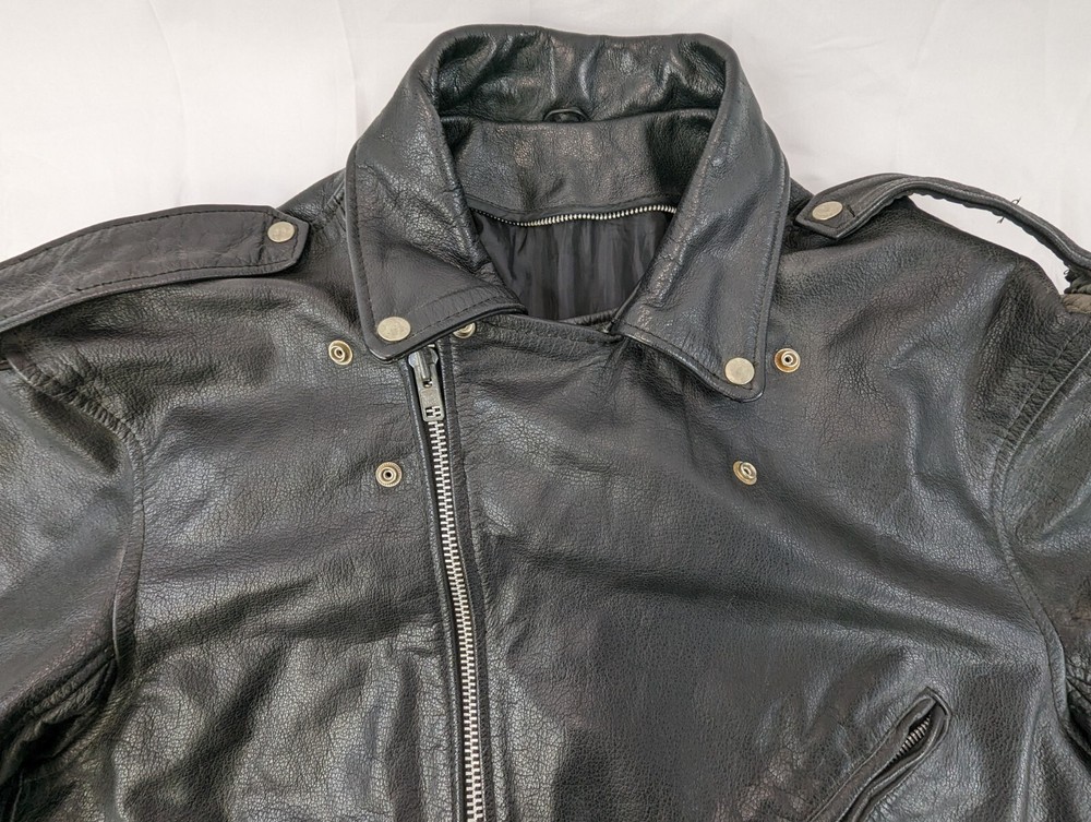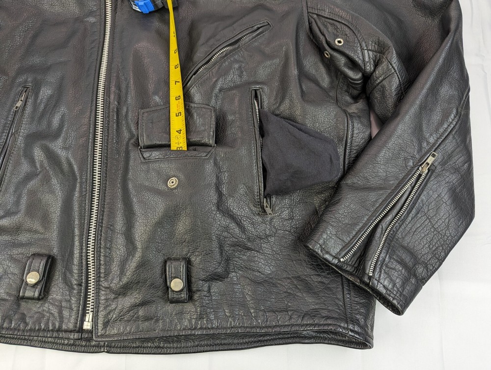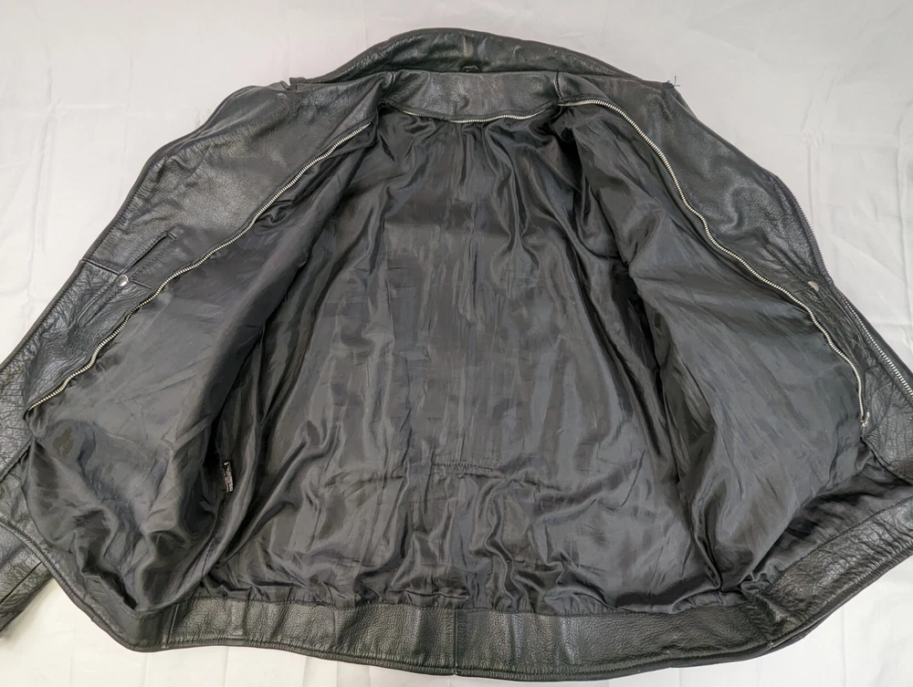 Pre-owned Good Condition. Light surface wear and frays. No structural damage such as rips, tears, or holes. The jacket is heavy in weight and the leather is high quality + very sturdy leather. The branding + sizing tag is not present, so I used and converted size to XXL = please use measurements in pictures also. The liner is in great shape and all buttons work correctly. The jacket has belt loops but no belt is present (this is the reason for good rating). All edges are in great shape; the leather has no cracking present and is in great shape. The zipper is metal and a highly sturdy zipper. Additional sizing provided throughout the photos. Please review all carefully and thank you for visiting my store. SHIPPING = FREE shipping and Item is shipped within 24 hours of close RETURNS = 30 day free returns with item in the same condition as which it left If there are any issues please reach out to me whether it be shipping, damage, or the item. My family prides itself on customer service and delivering a Happy buying experience to all that visit our store. We will work hard to resolve any issues. Thank you and happy shopping!