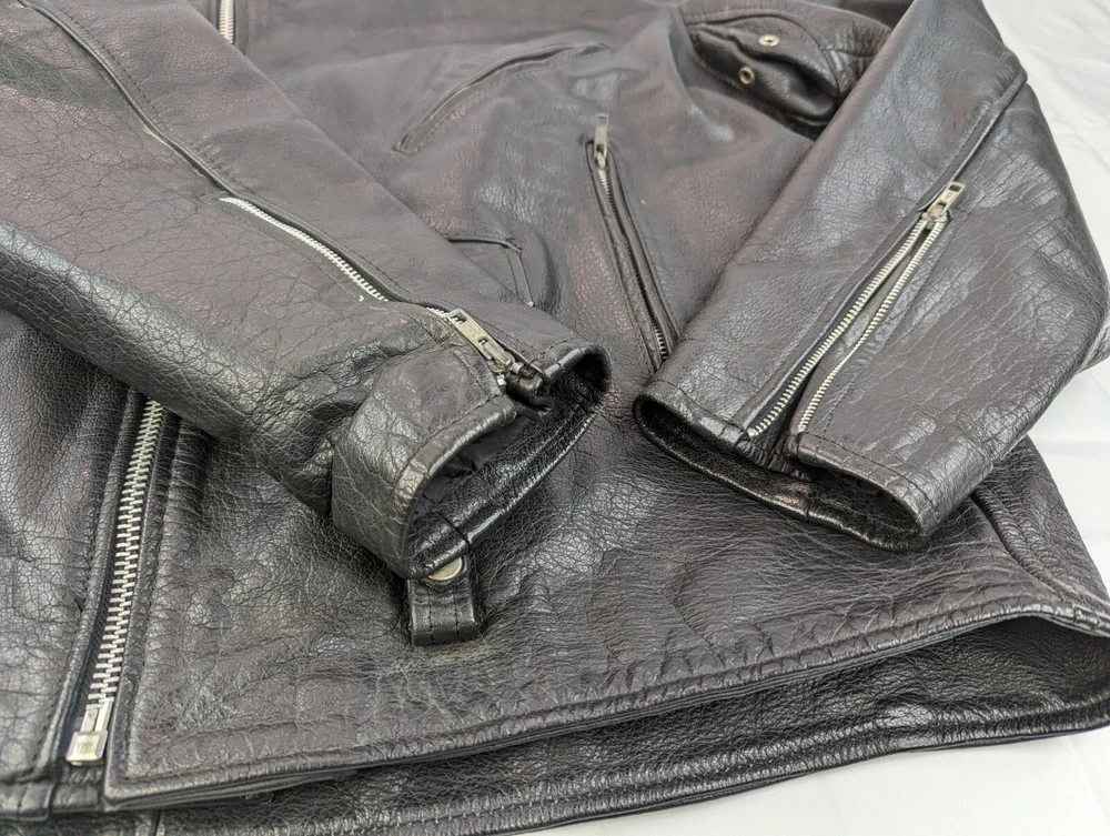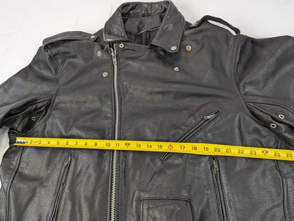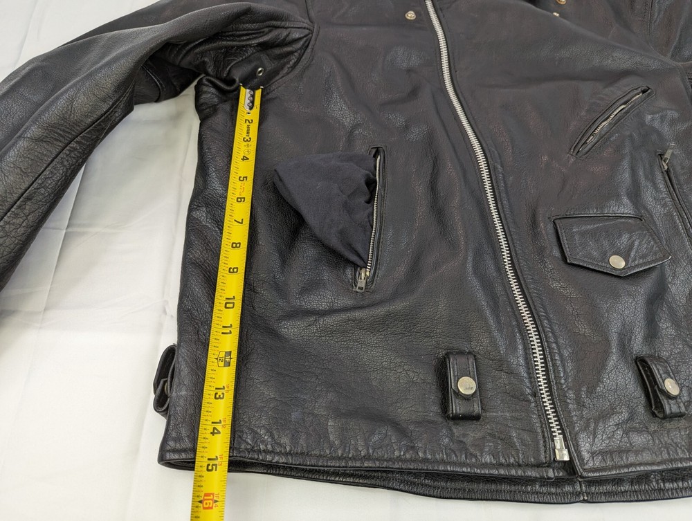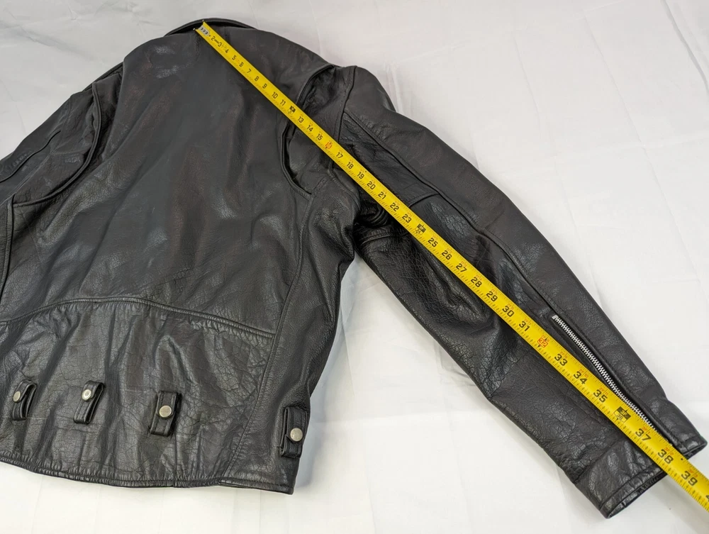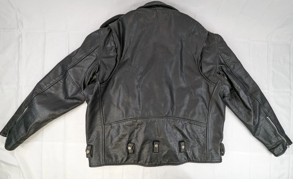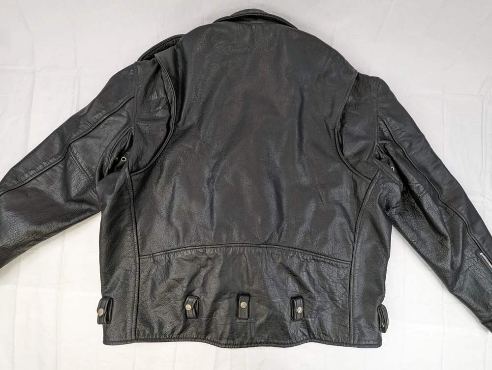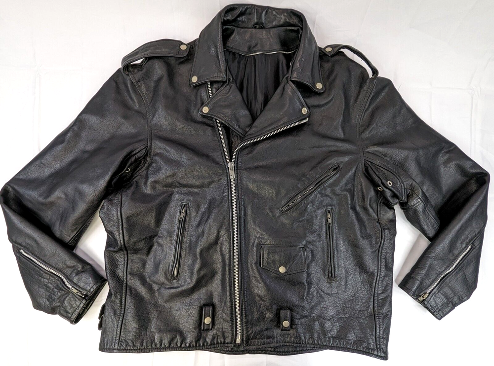 Pre-owned Good Condition. Light surface wear and frays. No structural damage such as rips, tears, or holes. The jacket is heavy in weight and the leather is high quality + very sturdy leather. The branding + sizing tag is not present, so I used and converted size to XXL = please use measurements in pictures also. The liner is in great shape and all buttons work correctly. The jacket has belt loops but no belt is present (this is the reason for good rating). All edges are in great shape; the leather has no cracking present and is in great shape. The zipper is metal and a highly sturdy zipper. Additional sizing provided throughout the photos. Please review all carefully and thank you for visiting my store. SHIPPING = FREE shipping and Item is shipped within 24 hours of close RETURNS = 30 day free returns with item in the same condition as which it left If there are any issues please reach out to me whether it be shipping, damage, or the item. My family prides itself on customer service and delivering a Happy buying experience to all that visit our store. We will work hard to resolve any issues. Thank you and happy shopping!
