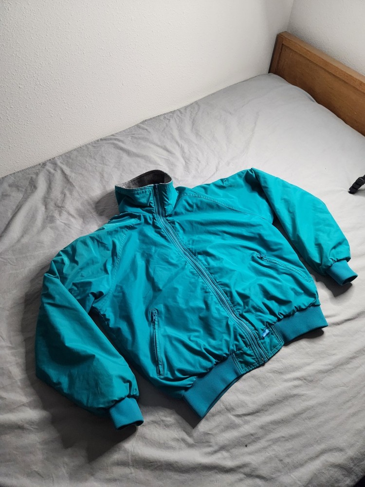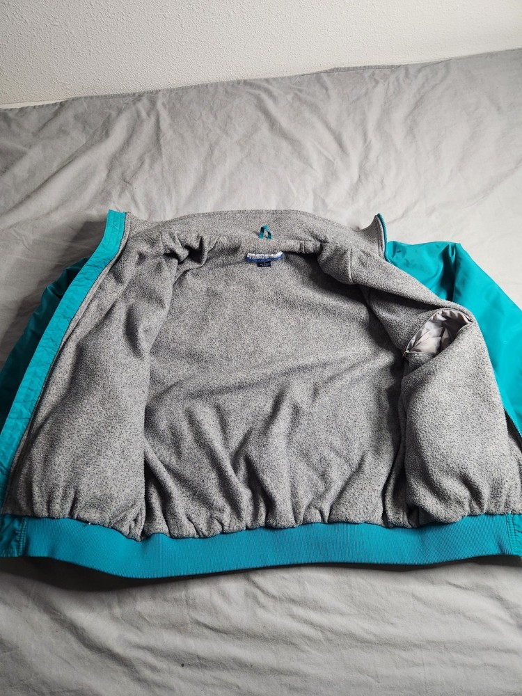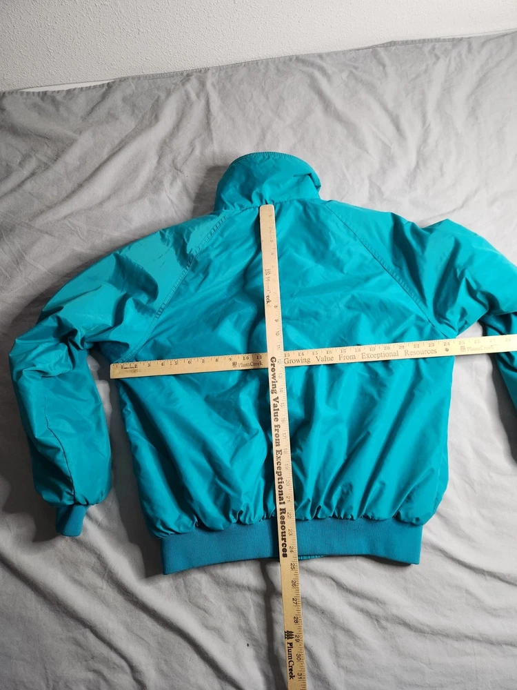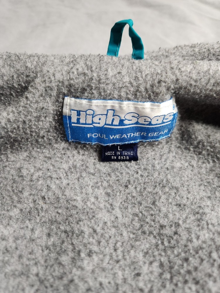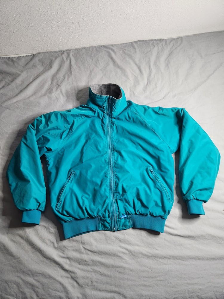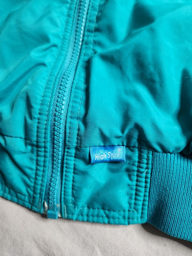 This vintage High Seas Foul Weather Gear Bomber Jacket is a must-have for any stylish man. The turquoise blue color and classic stand-up collar style make it a timeless piece that can be worn for any occasion, whether it be travel, casual, or workwear. The jacket is made of nylon and polyester blended fabric, which is both breathable and wind-resistant, making it perfect for all seasons. The jacket features a full zip closure, zipped pockets, and an elastic waistband for a comfortable fit. It is also equipped with a host of features such as weathergear, bodywarmer, and limited edition. The jacket is perfect for those who love the nautical theme and can be paired with any outfit to create a hipster, ski, or outdoor look.